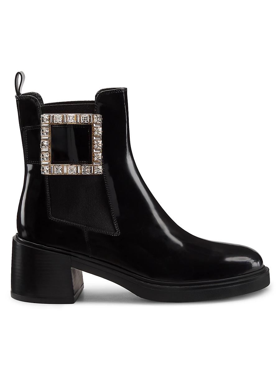 Made in Italy, Roger Viviers Viv Rangers Chelsea booties are styled with a slim round toe, gored sides, and a large metal buckle at the side. Leather/polyester/elastane upper Round toe Pulls on Leather lining Rubber sole Made in Italy SIZE True to size Block heel, about 2.36 (60mm). Womens Shoes - Roger Vivier Womens Shoe > Roger Vivier > Saks Fifth Avenue > Barneys. Roger Vivier. Color: Black. Size: 6.