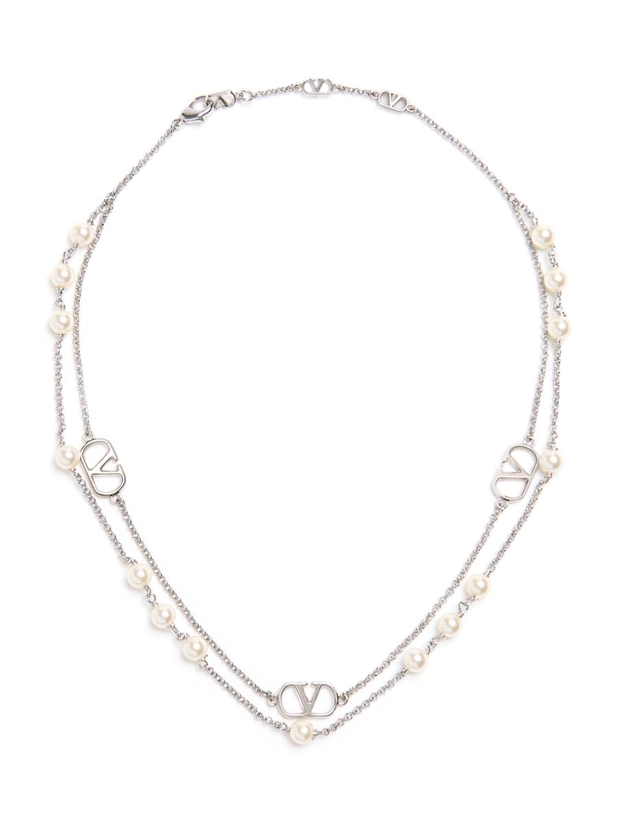 VLogo signature necklace in metal and Swarovski pearls. Palladium-tone finish VLogo Signature double chain and pearl detail VLogo Signature dimensions: 15 x 9 mm / 0.59 x 0.35 in Pearl diameter: 6 mm / 0.24 in Adjustable length from 38 to 42 cm / 15.0 to 16.5 in Snap hook closure Made in Italy. Lsd Rtw - Valentino Rtw > Valentino Garavani > Saks Fifth Avenue > Barneys. Valentino Garavani. Color: Palladium.