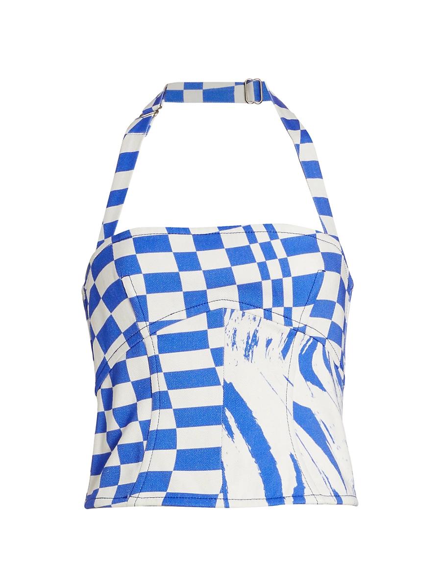 Cut in a cropped silhouette, Christopher John Rogers denim halterneck top boasts mixed wave and checkered patterning. Adjustable halterneck Sleeveless Open back Back zip Silvertone hardware 100% cotton Dry clean Made in USA SIZE & FIT About 12.25 from shoulder to hem Model measurements: 510 tall Model is wearing a US size 4. Designer Evening - Couture Collections > Christopher John Rogers > Saks Fifth Avenue > Barneys. Christopher John Rogers. Color: Cunningham Multi. Size: 0.