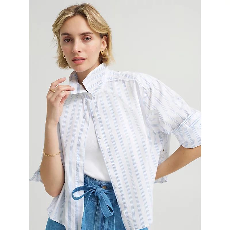 This regular-fit button-down comes with a cropped hem and comfortable fit for a playful take on your favorite work top. With a hidden button panel and a unique wide cuff at the sleeve, this bolder take on the blouse brings some extra personality to your business attire. 100% Cotton. Halogen Stripe. L.
