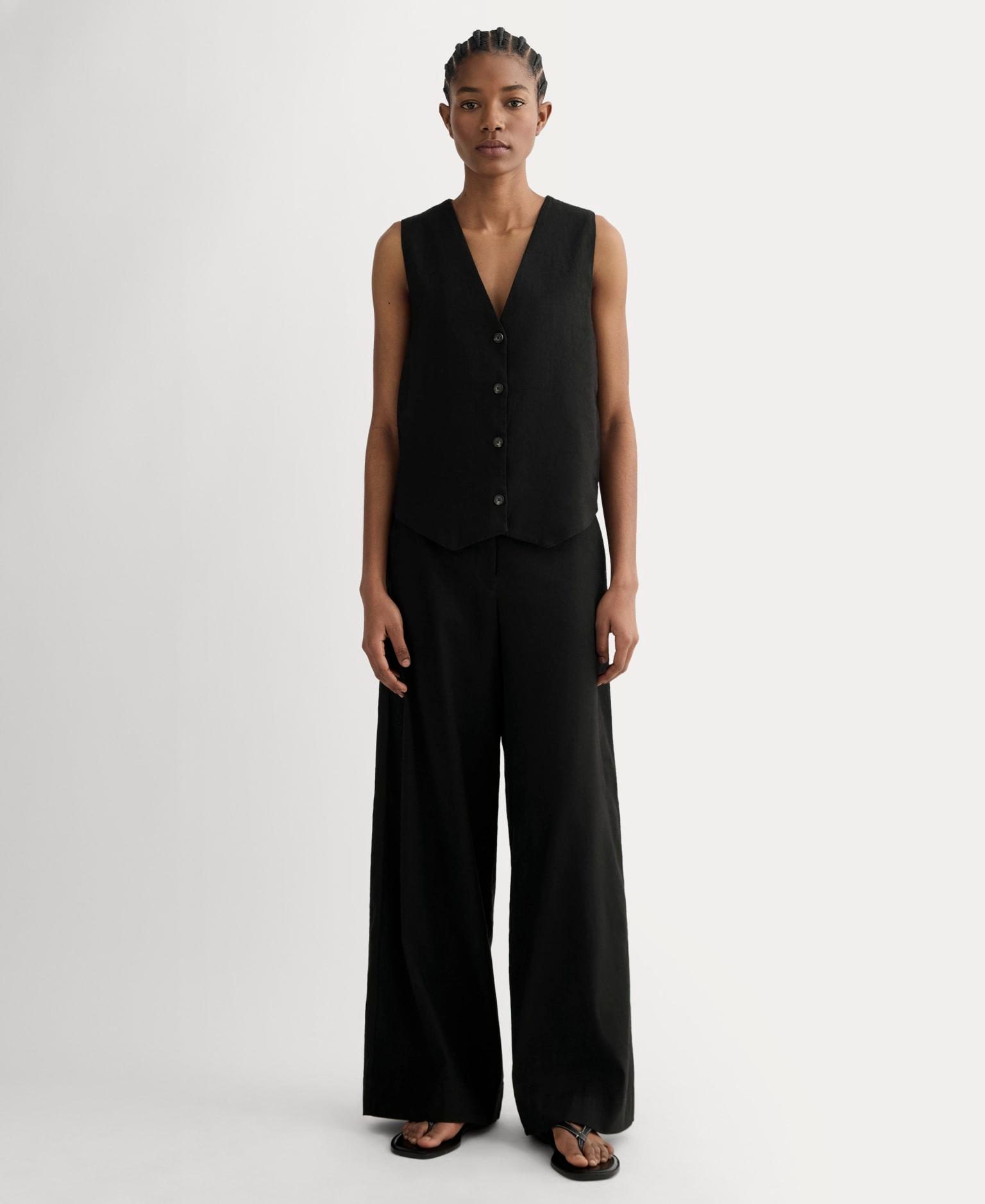 A modern take on the classic trouser. Designed with an extra high rise wide leg zip fly and floor-skimming length in our new Stretch Linen fabric this flattering silhouette offers a statement look you can dress up or down. We love it with our Vest in Stretch Linen. Womens Wide-Leg Pant in Stretch Linen by Everlane in Black, Size 8