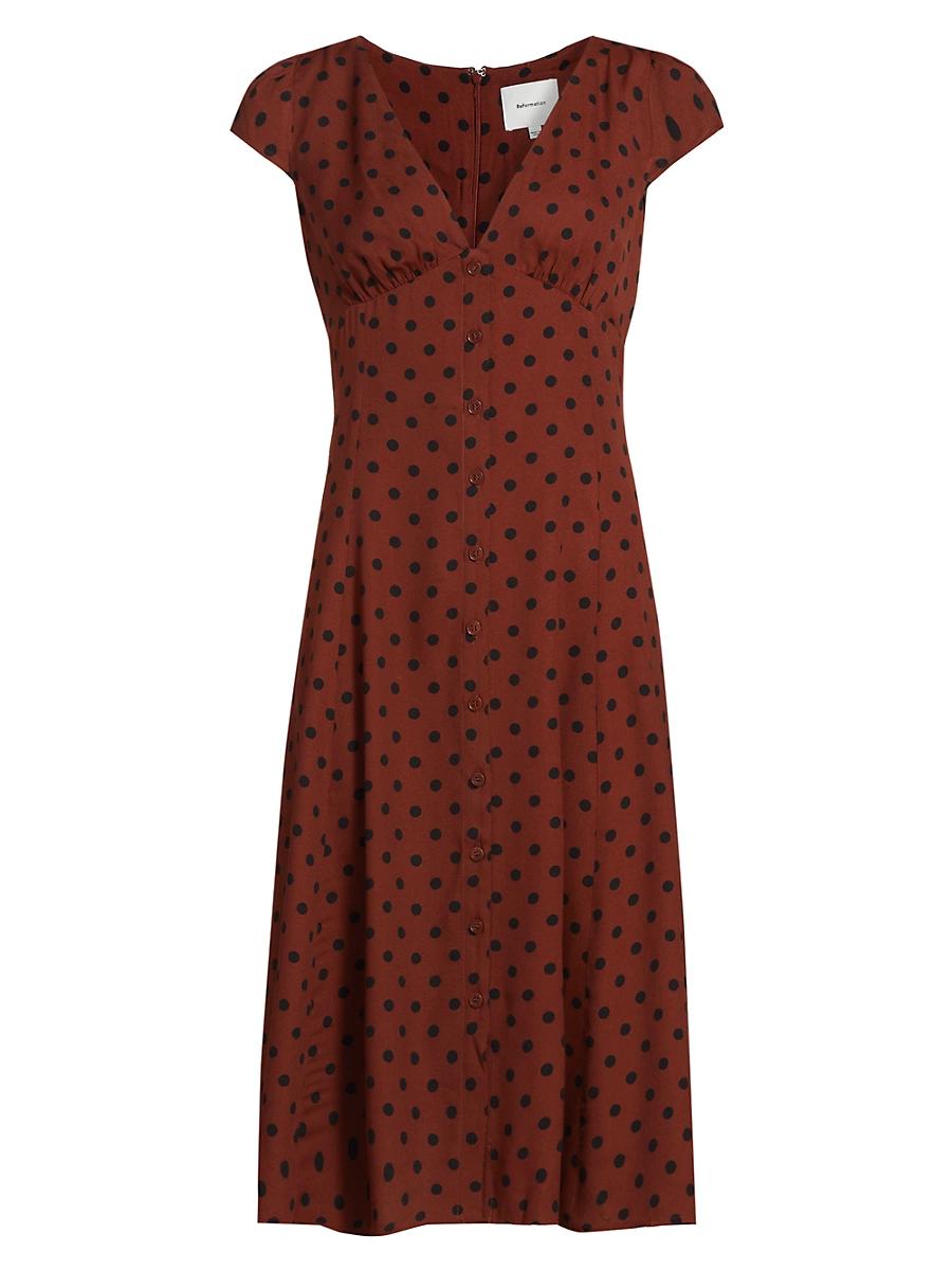 Reformations Wilda dress highlights a classic polka-dot print. A V-neckline, cap sleeves, and a refined front button closure complete this A-line silhouette. V-neck Cap sleeves Front button closure Back zip closure 53% viscose/ 47% rayon Dry clean Made in USA SIZE & FIT This style is constructed in a woven, no-stretch fabric for a fitted shape About 51 from shoulder to hem Bust: about 34 Model measurements: 510 tall Model is wearing a US size 4. Contemporary Sportswear - Contemporary Collections > Reformation > Saks Fifth Avenue > Barneys. Reformation. Color: Fig Jam Dot. Size: 0.