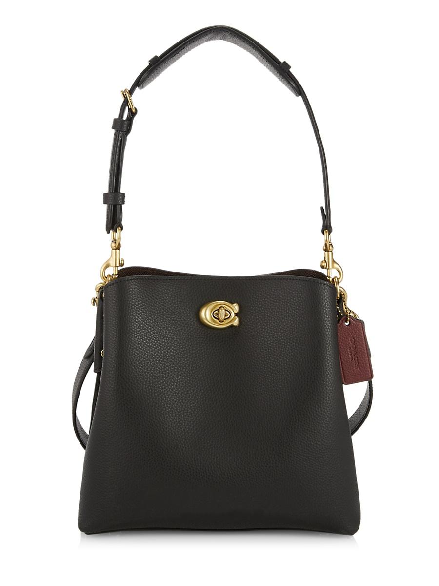 A pebbled leather bucket bag with two-way wearability. Turnlock and snap closures Goldtone hardware Two interior open compartments Interiorzip compartment Interior multifunction pocket Metal feet Leather Imported SIZE Removable crossbody strap, 21.5 drop Removable top handle, 8 drop 9.25W x 8.75H x 4.25D. Handbags - Contemporary Handbags > Coach > Saks Fifth Avenue > Barneys. COACH. Color: Black.