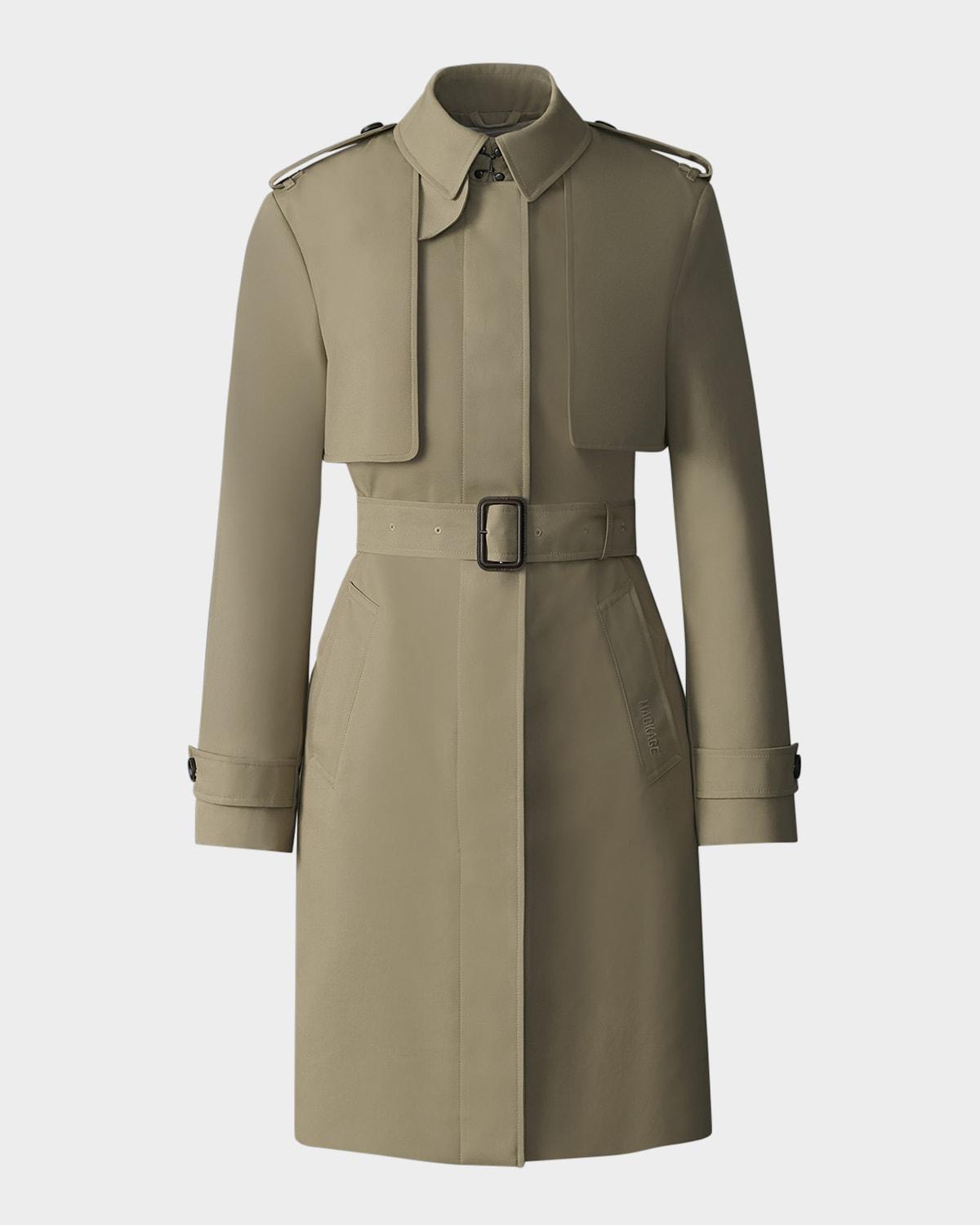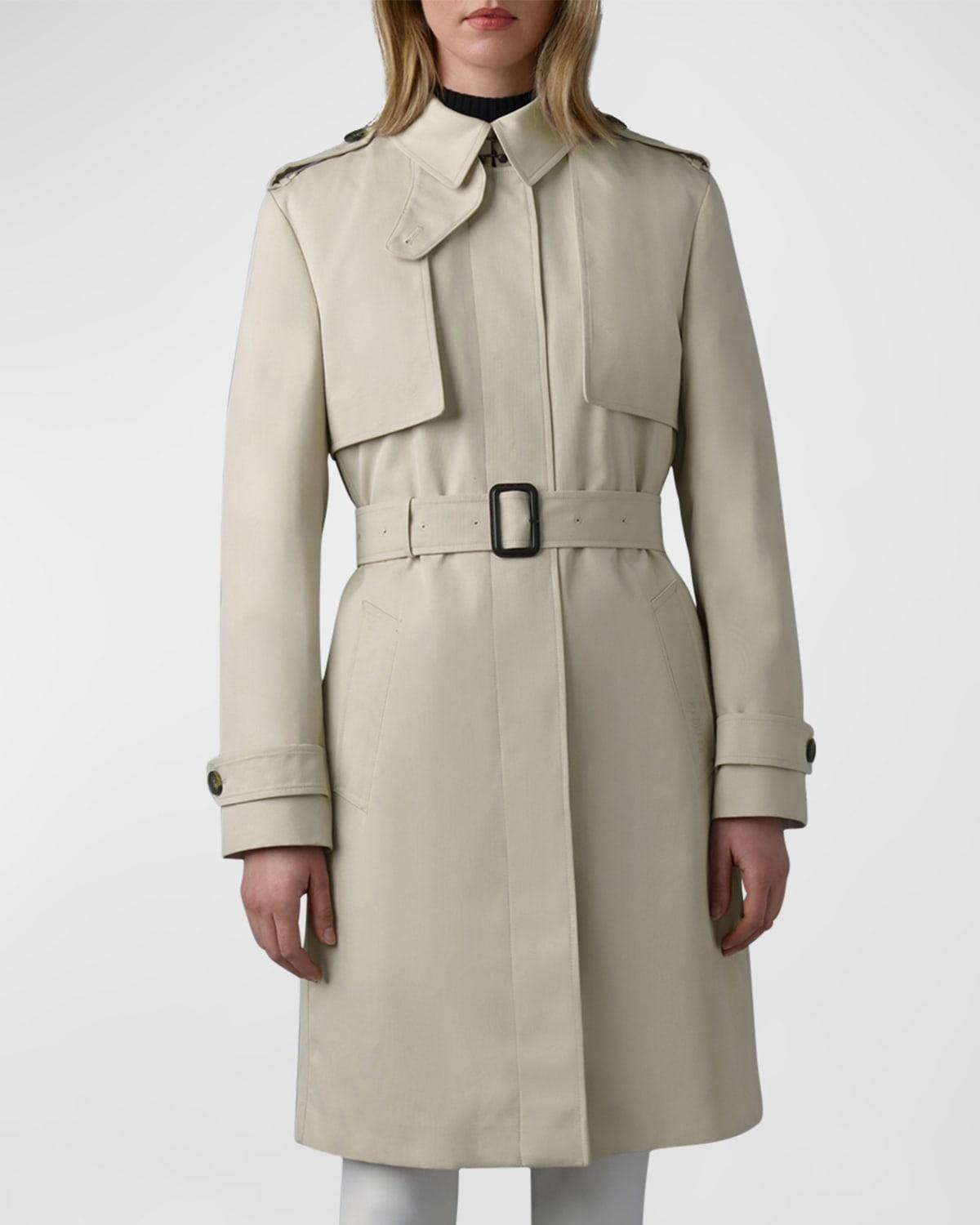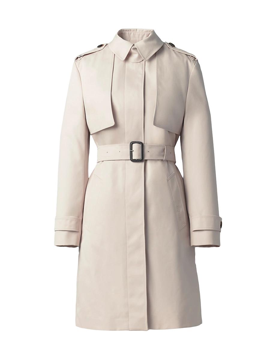 Mackage Winn 2-in-1 classic trench coat designed for moderate cold weather down to -5C Detachable buttoned throat latch Hidden button front closure Shoulder tabs with buttons Front and back rainshedder Long sleeves; adjustable sleeve tabs with buttons Adjustable belt Side welt pockets Vent at center back Hem hits around the knee Semi-fitted silhouette Polyester/cotton Lining: Viscose Removable polyfill liner Dry clean, leather method...