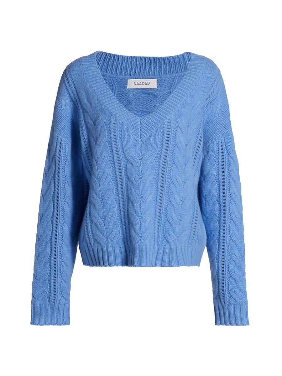This cable-knit sweater from Naadam is crafted of a luxe wool blend. V-neck Long sleeves Pulls over 70% wool/30% cashmere Dry clean Imported SIZE & FIT About 20.75 from shoulder to hem Model measurements: 510 tall Model is wearing a US size Small. Contemporary Sportswear - Trend > Naadam > Saks Fifth Avenue > Barneys. Naadam. Color: Sky Heather. Size: Medium.