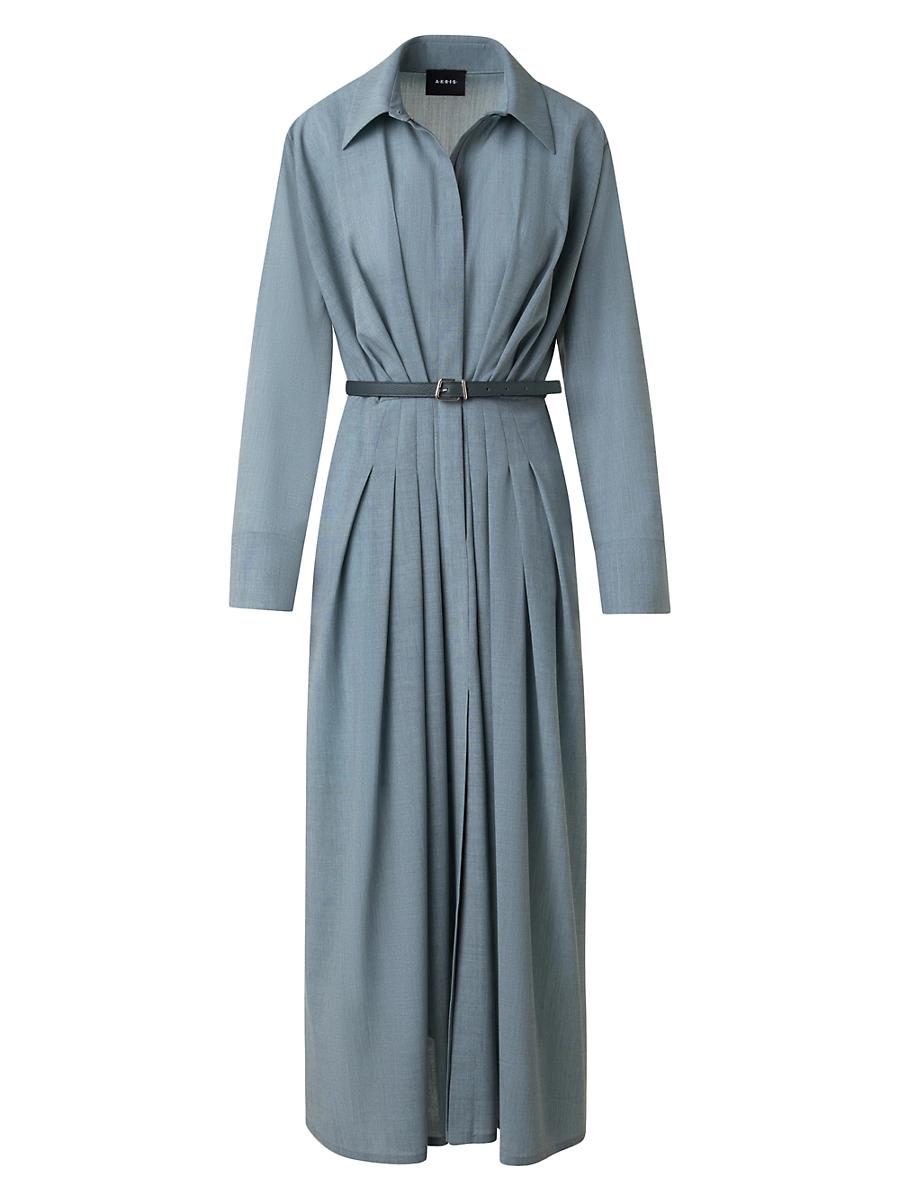 This shirt-style midi-dress from Akris is crafted of wool and styled with a spread collar, pleated waist, and front zip closure. Spread collar Long sleeves, button cuffs Side slip pockets Belted Front zip closure 100% wool Lining: 72% viscose/28% silk Dry clean Imported SIZE & FIT Model measurements: 510 tall Model is wearing a US size 4 ABOUT THE BRAND Founded in 1922 in St. Gallen, Switzerland, the name Akris was derived from founder Alice-Kriemler Schochs initials. The entrepreneurial designer first started designing dotted aprons with intricate embroidery and soft cotton, which quickly grew into a full line of ready-to-wear. Almost 100 years later, the brand is now helmed by her grandsons. Creative Director Albert Kriemler continues to pay homage to his grandmother through polka-dot lined clothing, luxe fabrications and modern design-which now include sleek accessories like the cult-favorite AI trapezoidal handbag. Advanced European - Akris > Akris > Saks Fifth Avenue > Barneys. Akris. Color: Stone Blue. Size: 6.