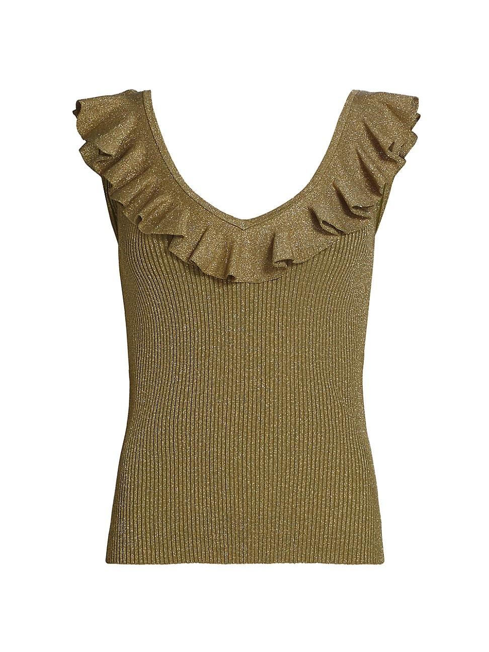 This rib-knit Wylie top from Zimmermann features a ruffled V-neck and metallic finish. V-neck Sleeveless Pulls over 63% viscose/30% polyamide/7% metallic fibers Hand wash Imported SIZE & FIT About 22 from shoulder to hem Model measurements: 510 tall Model is wearing a US size 4 ABOUT THE BRAND Australian founders and sister-duo Nicky and Simone Zimmermann design with a signature feminine aesthetic, each piece rife with tiers of fabric, rich embroidery and splashy prints. From ruffled bikinis and beachwear to luxe, intricately patterned maxi (and mini) dresses, everything is overtly romantic in the most elevated, effortless way. Contemporary Sportswear - Zimmermann > Zimmermann > Saks Fifth Avenue > Barneys. Zimmermann. Color: Dusty Olive Gold. Size: 6.