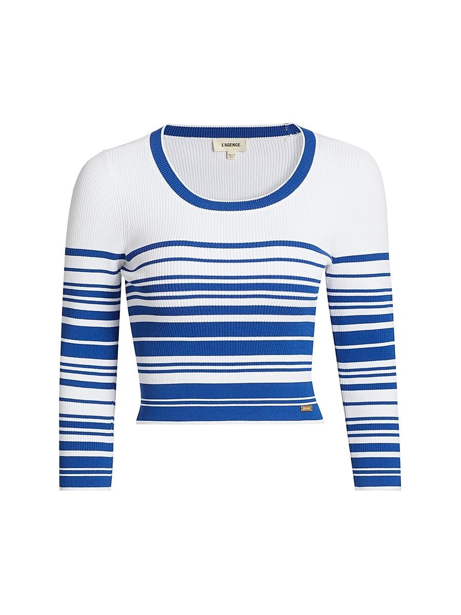 Cut for a cropped slim fit, the Yukio top from LAGENCE features dynamic stripes. Crewneck Long sleeves Pulls over 55% rayon/43% nylon/2% spandex Dry clean Imported SIZE & FIT About 17.5 from shoulder to hem Model measurements: 510 tall Model is wearing a US size Small ABOUT THE BRAND Founded in 2008, LAgence marries Southern California ease with chic Parisian style. Using luxurious fabrics, the Los Angeles-based label delivers feminine collections that are both timeless and versatile. In 2015, the label launched a denim line in a range of sleek, impeccably tailored cuts. Contemporary Sportswear - Workshop > Lagence > Saks Fifth Avenue > Barneys. LAGENCE. Color: White Navy. Size: Medium.