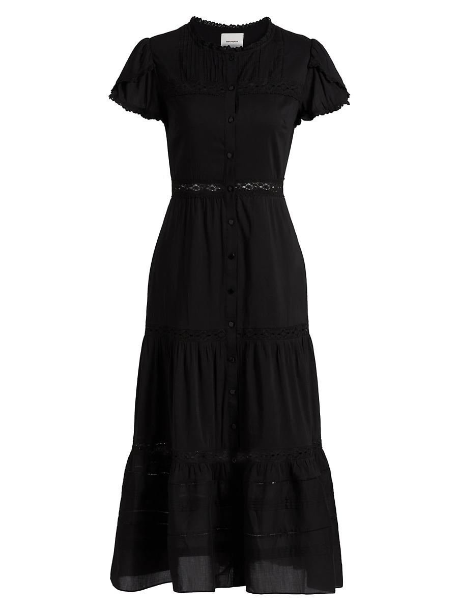 Reformations Zebrina tiered midi-dress is crafted of cotton showcasing an eyelet trim waist and puff sleeves. Roundneck Short sleeves Button-front closure 100% cotton Machine wash Imported SIZE & FIT About 50.5 from shoulder to hem Model measurements: 510 tall Model is wearing a US size 4. Contemporary Sportswear - Contemporary Collections > Reformation > Saks Fifth Avenue > Barneys. Reformation. Color: Black. Size: 8.