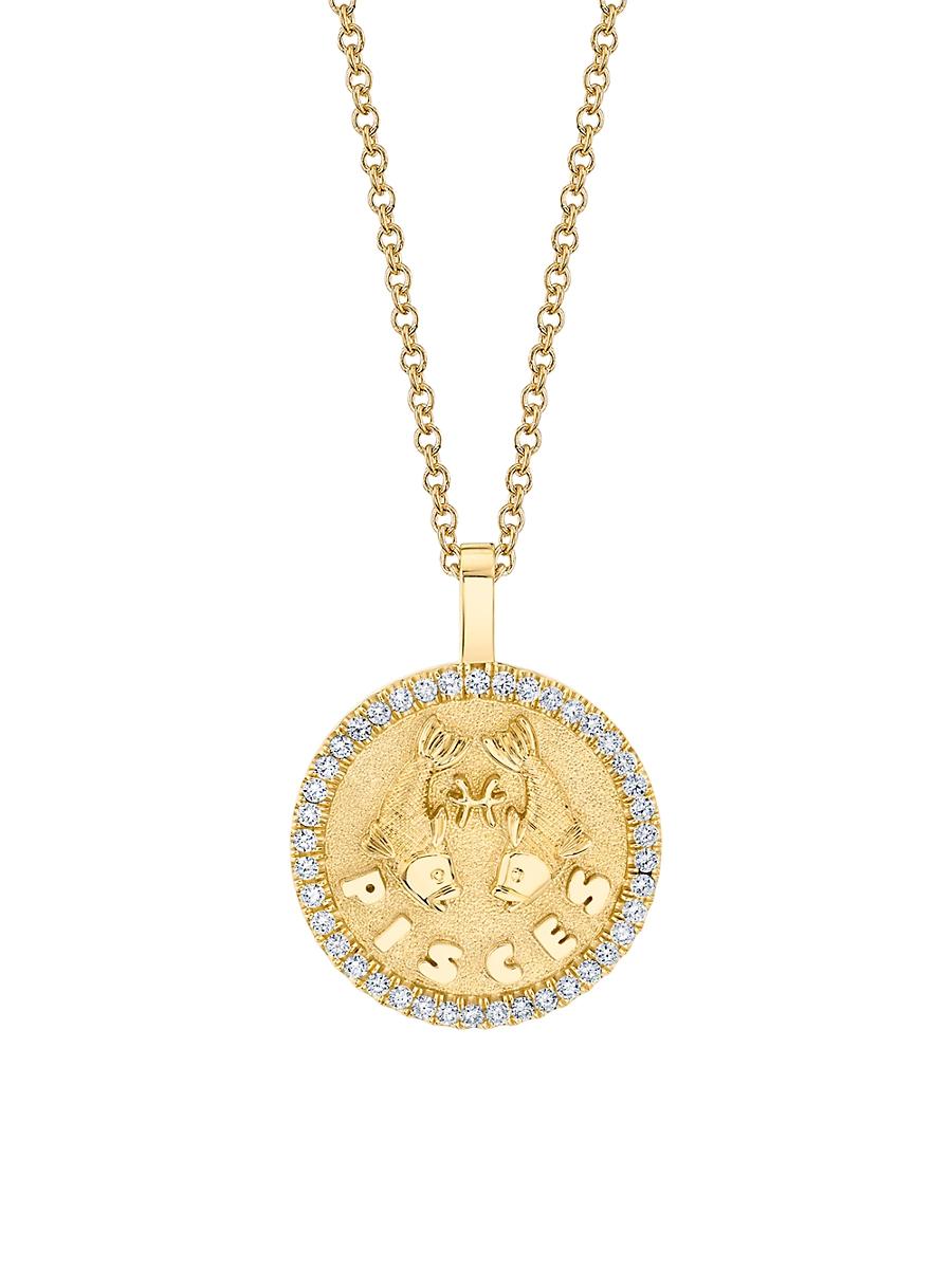 Rendered in textured 18K gold, this gleaming round pendant features the Pisces sign framed in a sparking diamond halo.The Pisces sign represents birthdays from February 19 to March 20. Diamonds, 0.48 cw 18K yellow gold Made in USA SIZE Length, about 20 with loop at 16 and 18 Pendant diameter, about 1. Fashion Jewelry - Designer Fine Jewelry > Anita Ko > Saks Fifth Avenue > Barneys. Anita Ko. Color: Yellow Gold.