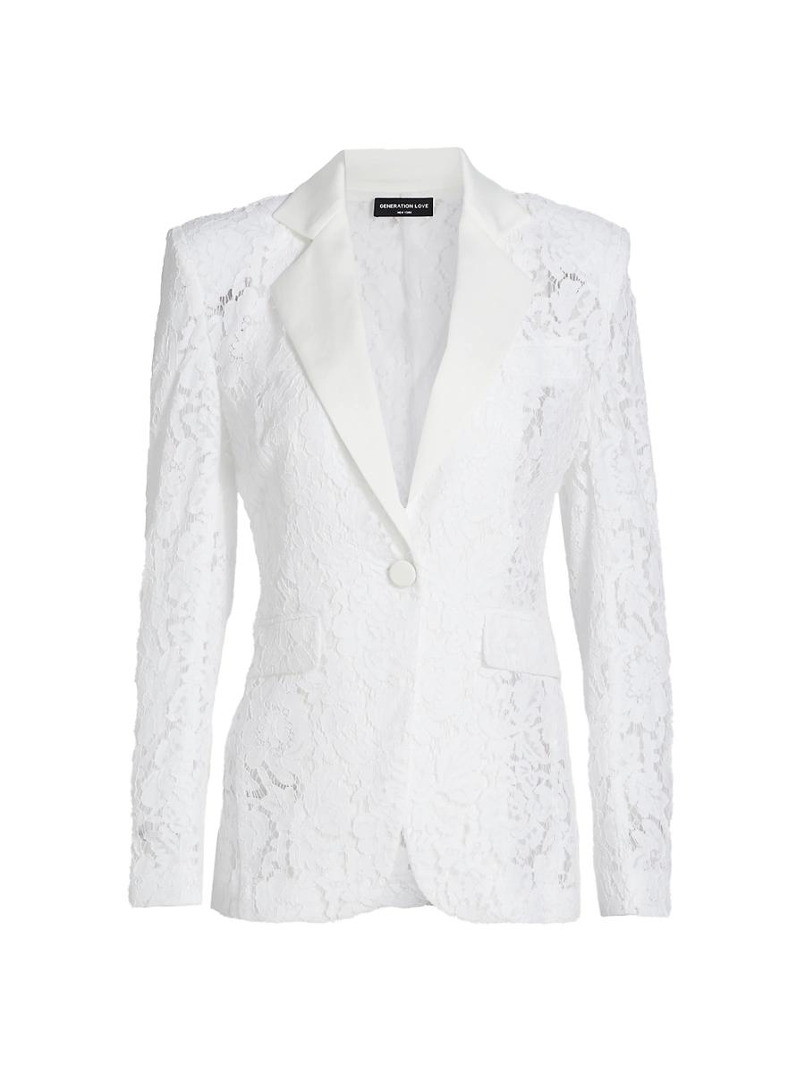 Generation Loves Zoya single-breasted blazer is crafted of a cotton blend and styled with lace detailing. Notch lapels Long sleeves Side flap pockets Button-front closure 60% cotton/40% nylon Combo: 98% polyester/2% elastane Dry clean Imported SIZE & FIT About 27 from shoulder to hem Model measurements: 510 tall Model is wearing a US size Small. Contemporary Sportswear - Casual Separates > Generation Love > Saks Fifth Avenue > Barneys. Generation Love. Color: White. Size: XS.