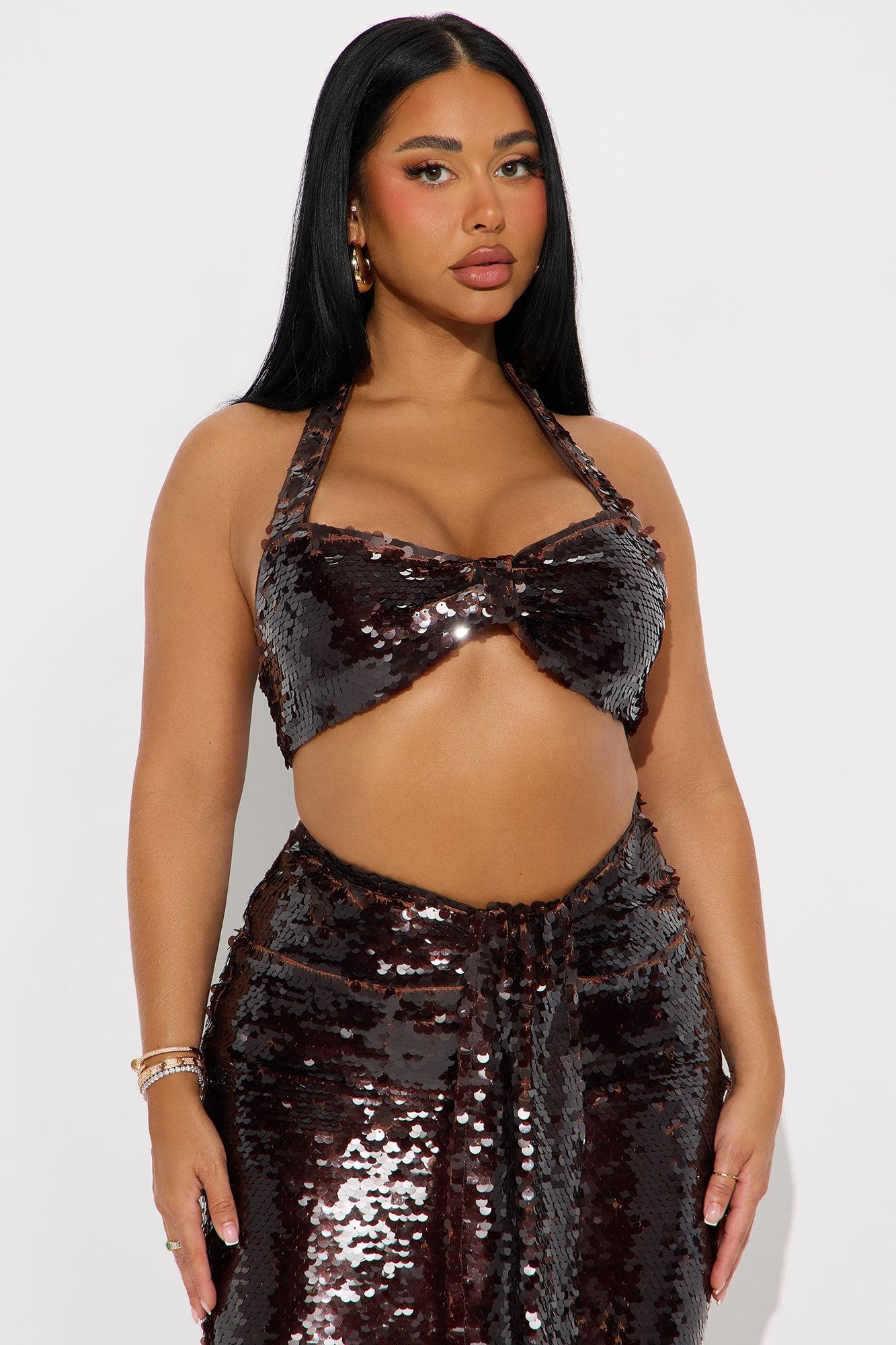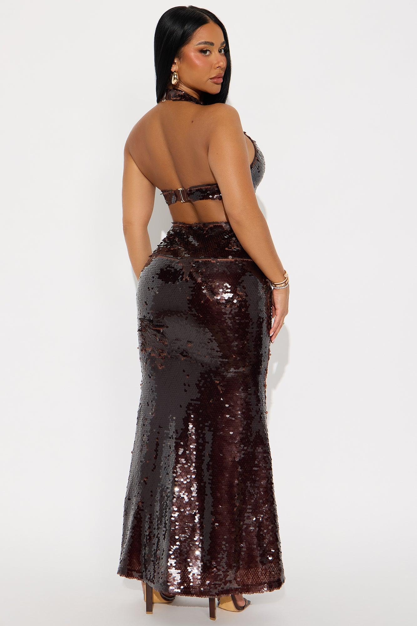 Available In Chocolate And Emerald. 2 Piece Ensemble Halter Top And Maxi Skirt Set Non Stretch Fully Lined Back Hardware Slider Closures On Top Invisible Side Zipper Closure On Skirt Self: 100% Polyester Lining: 100% Polyester Imported California Proposition 65WARNING: Cancer and Reproductive Harm - www.P65Warnings.ca.gov.
