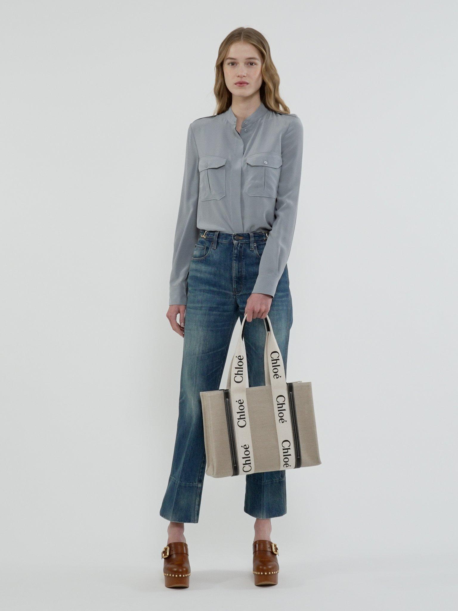 Medium Woody tote bag in cotton canvas & shiny calfskin with Woody ribbon
