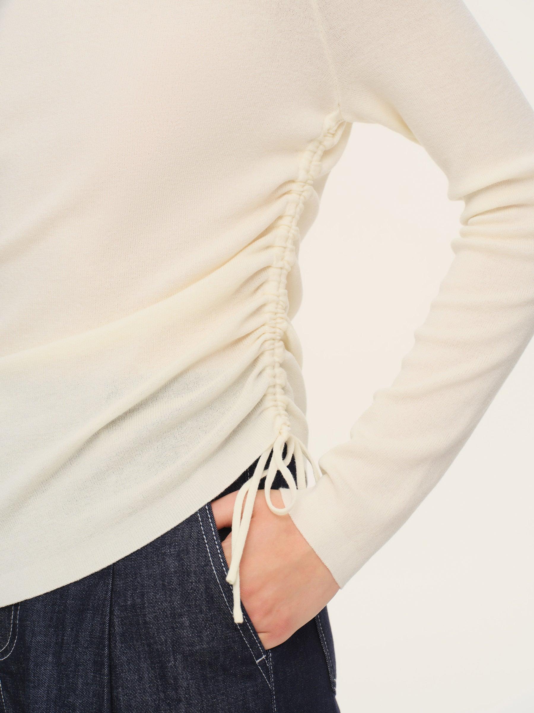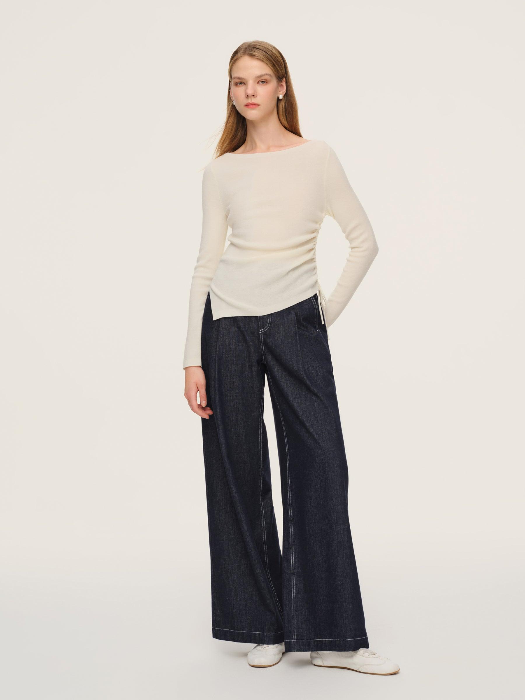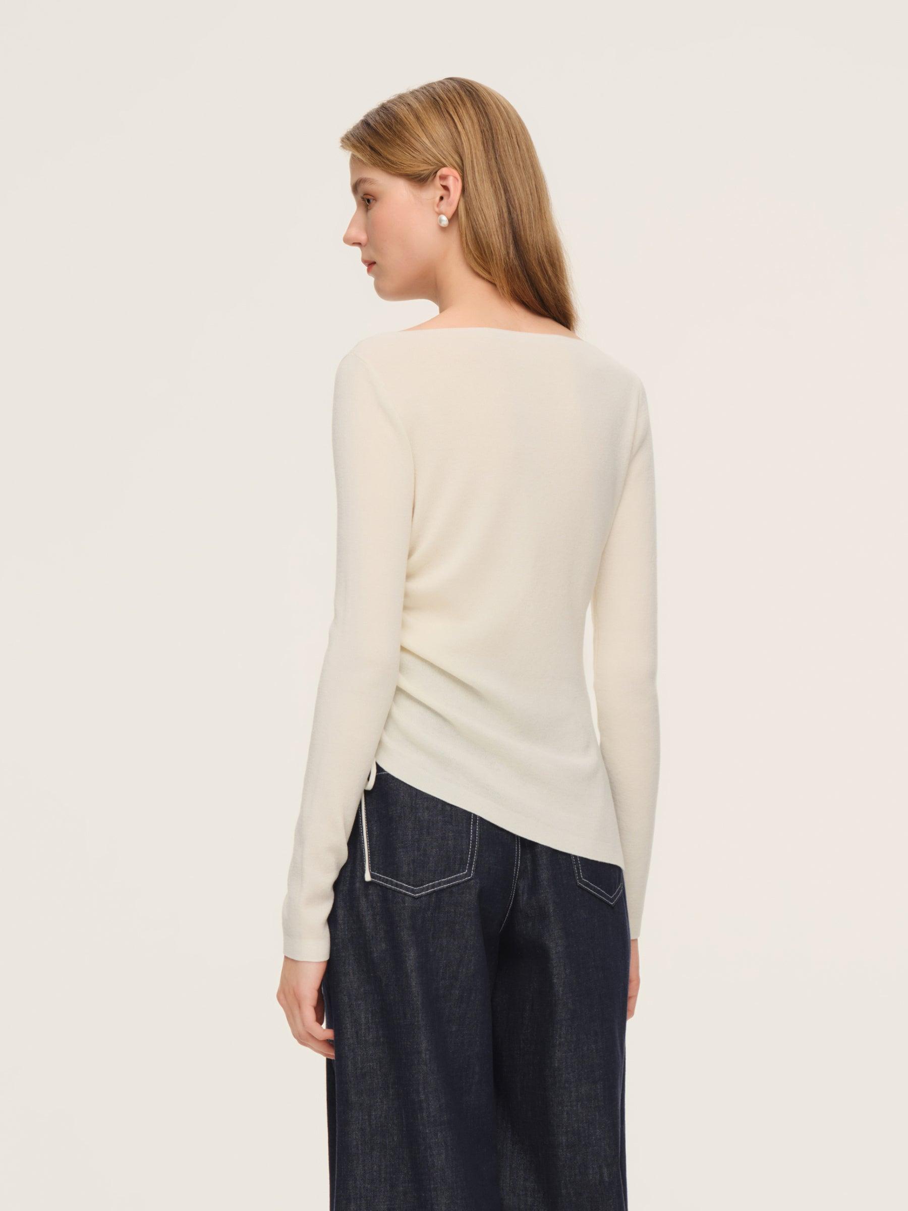 -69% Wool and 31% Acetate -Boat neck -Slim fit Elevate your daily wardrobe with this wool-acetate blend knit top. Designed for the modern woman seeking effortless elegance, it transitions seamlessly from office to dinner. The premium wool blend ensures warmth without itchiness, while the boat neck and left side drawstr