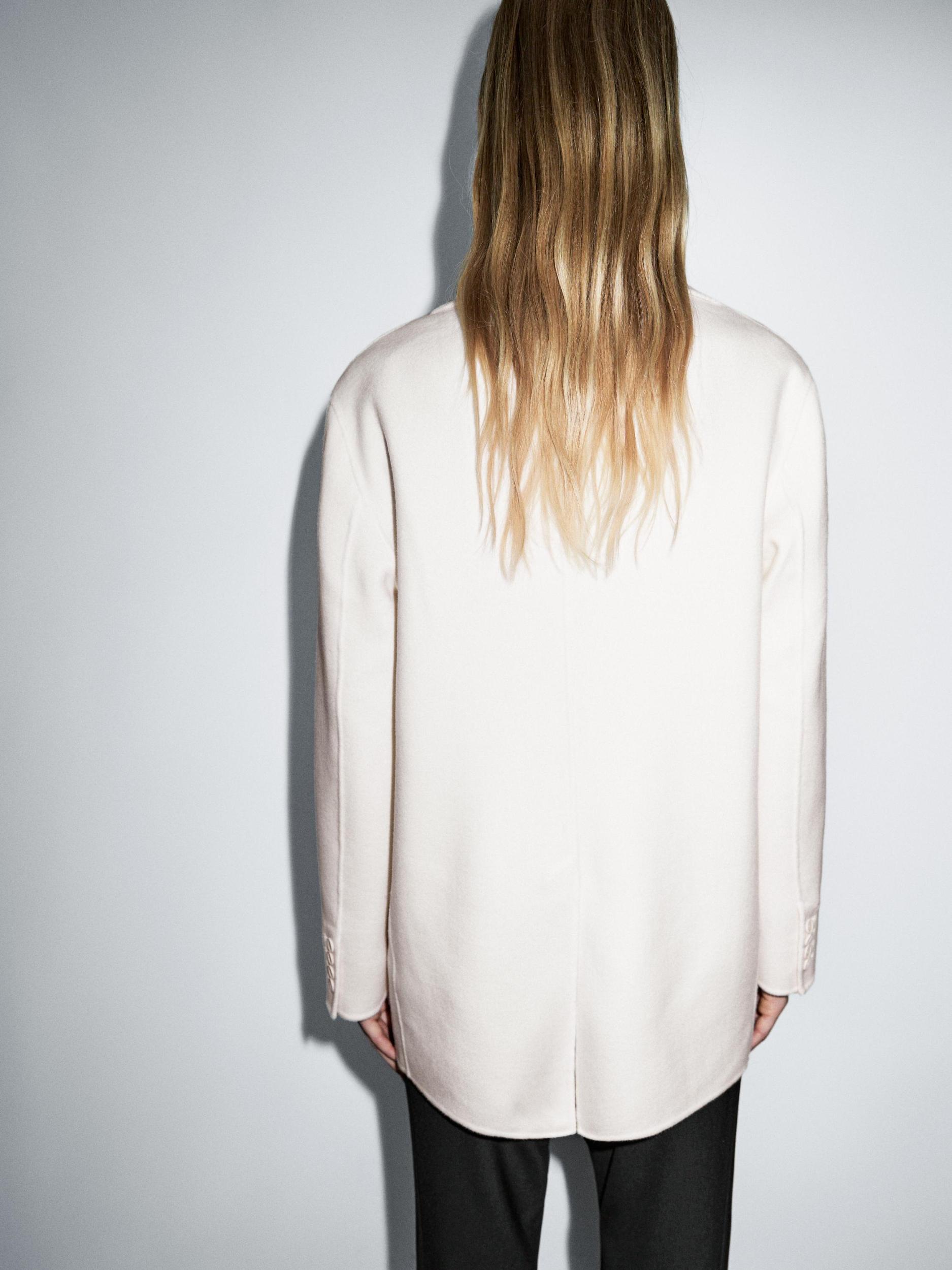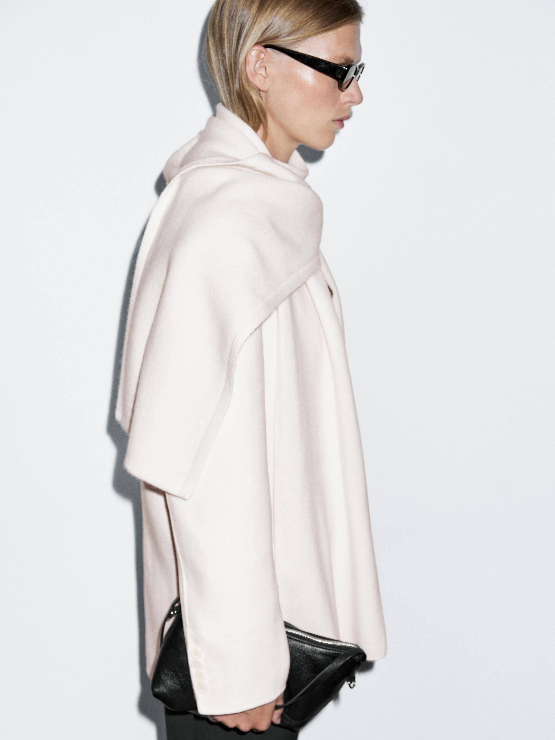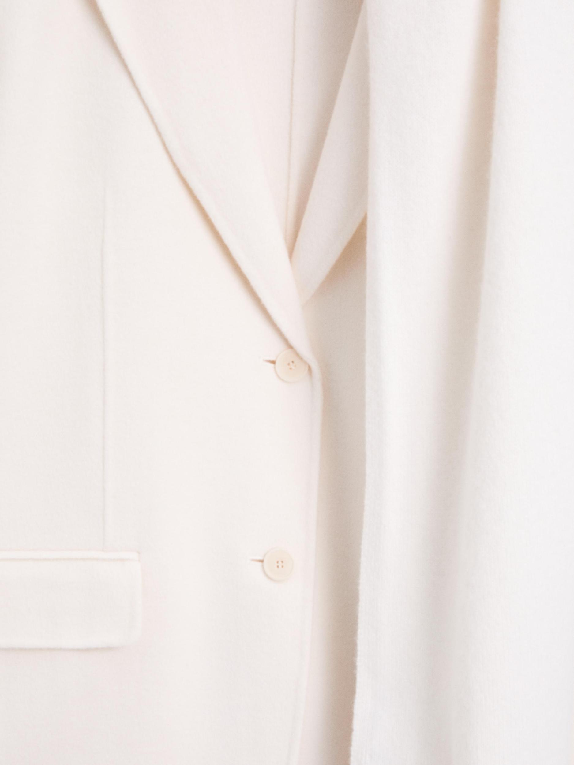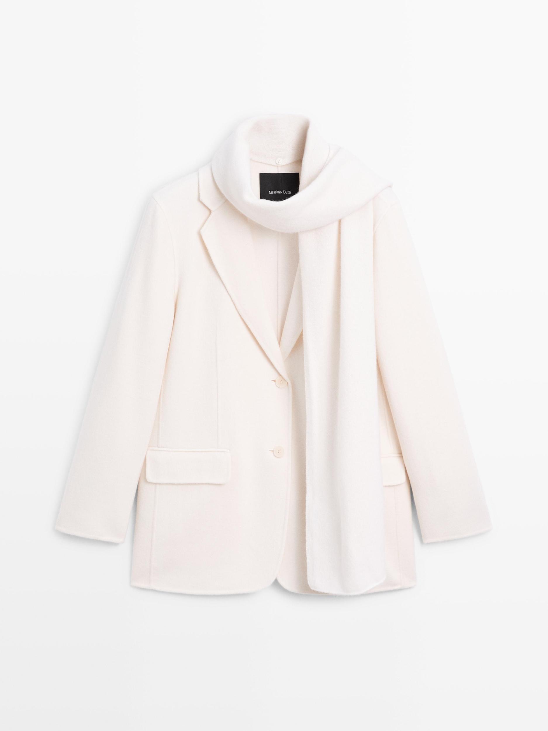 Wool blend blazer, Peak lapel collar, Long sleeves with buttoned cuffs, Two-button fastening, With built-in detachable scarf, Two front welt pockets with flaps, Hem with back vent