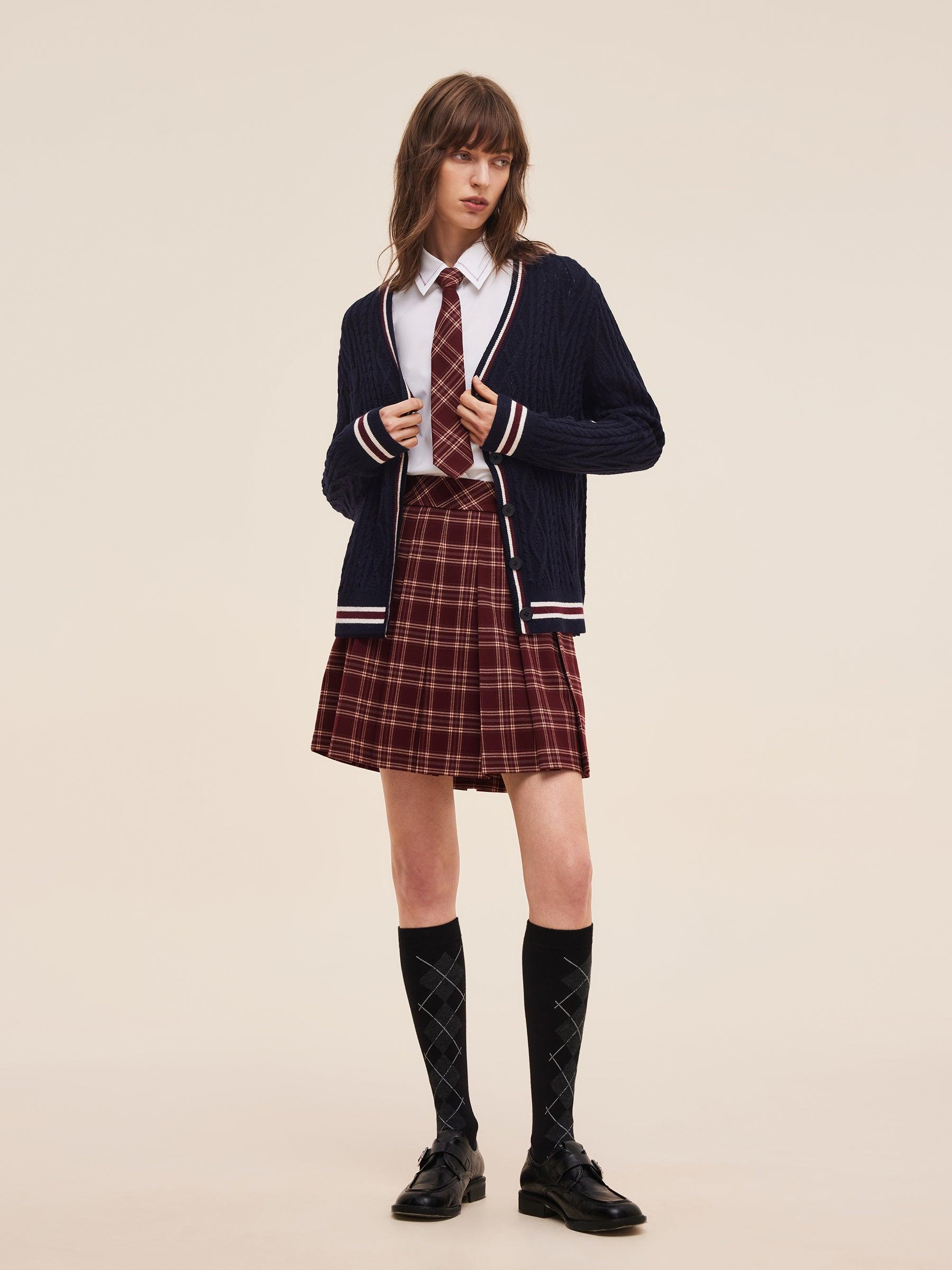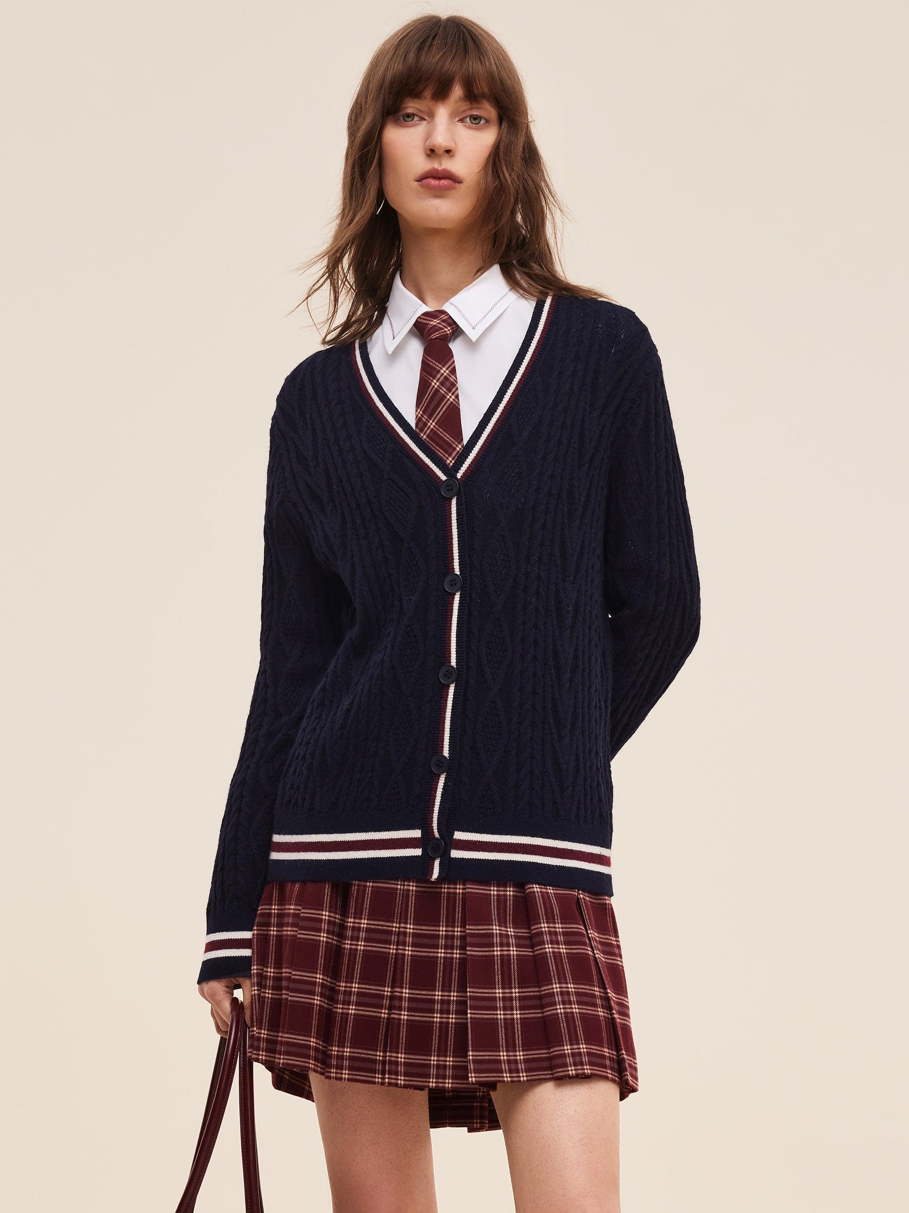 -Wool blend fabric -V-neck -Soft and comfortable Tailored from a soft wool blend which is warm yet breathable, this cardigan features a deep navy base accented by signature contrast stripes in burgundy, white, and dark blue. The V-neckline elongates the neck and flatters the face, while contrast trims at the collar, cu