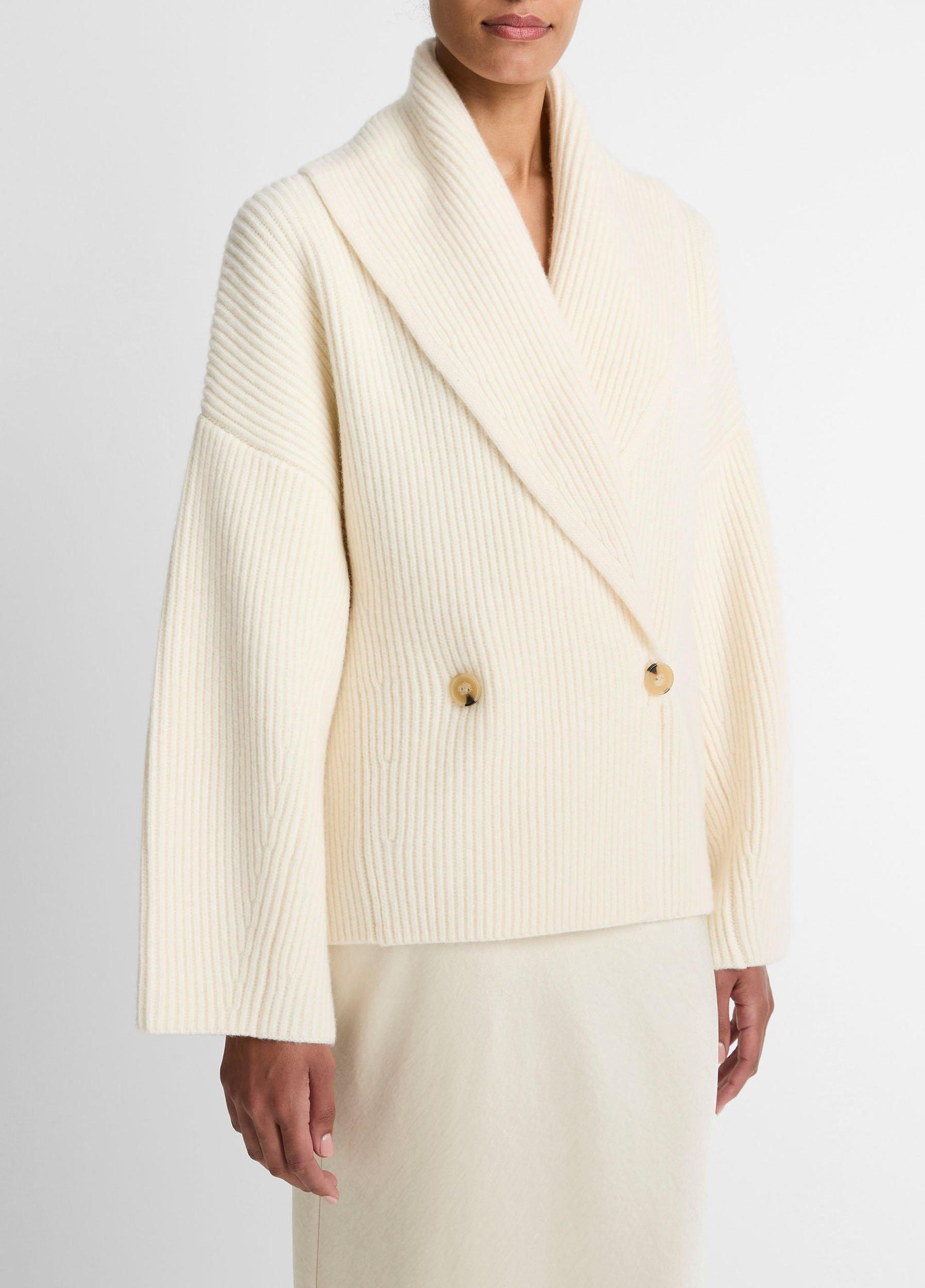Blending the very best elements of a sweater and coat, our latest layer is crafted from a chunky rib-knit wool blend for an exceptionally sumptuous feel and substantial weight. An exaggerated shawl collar lends this cozy topper its dash of definition.