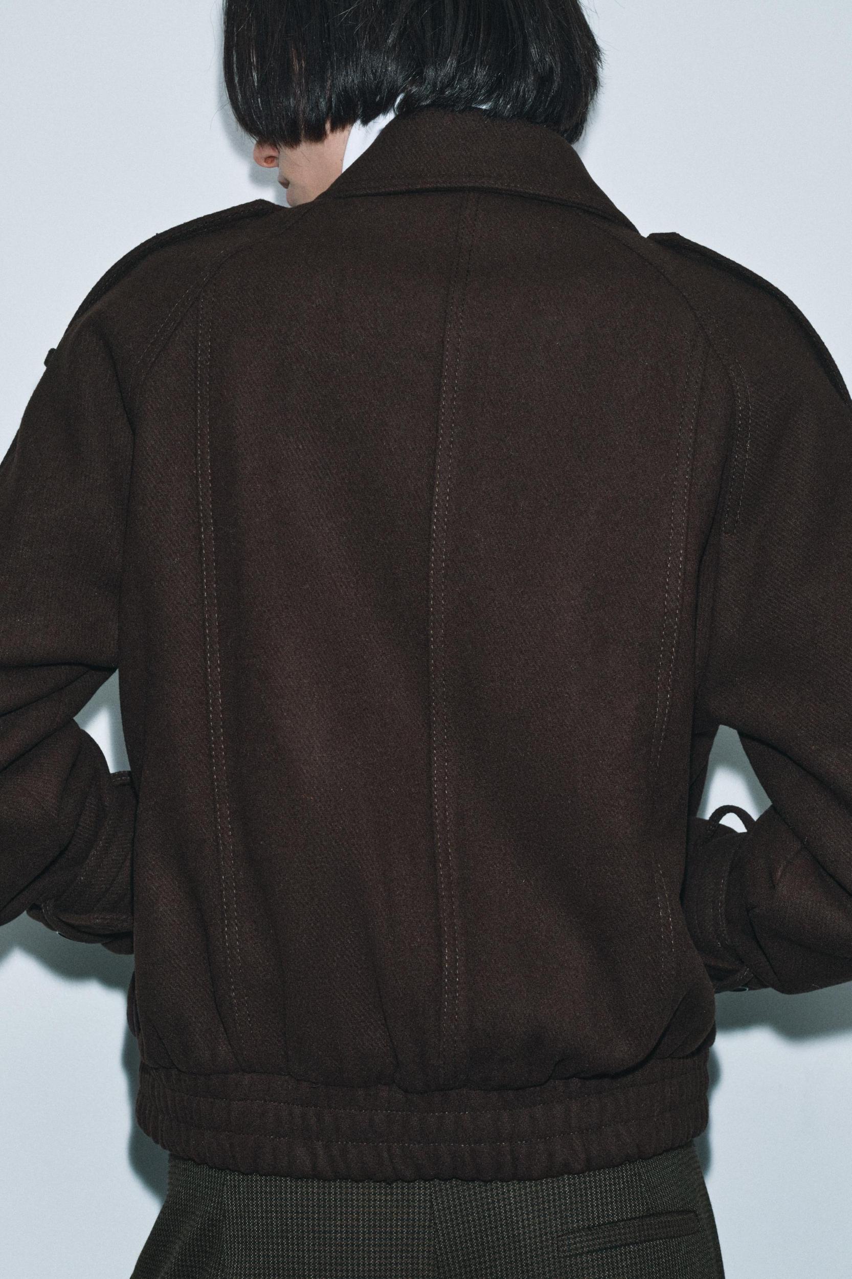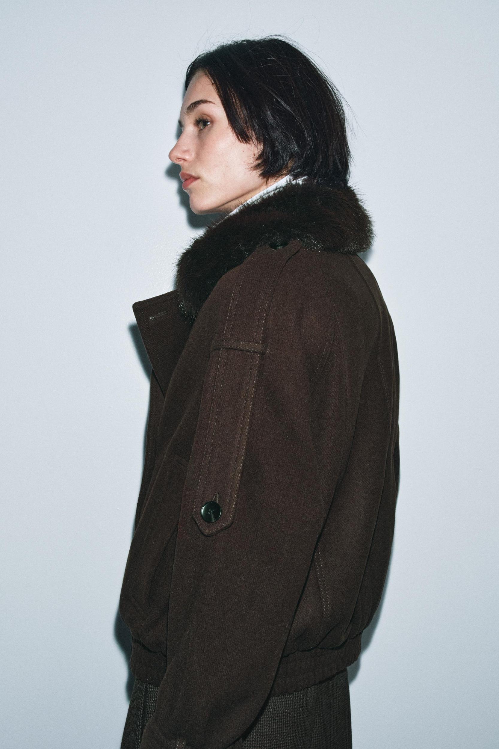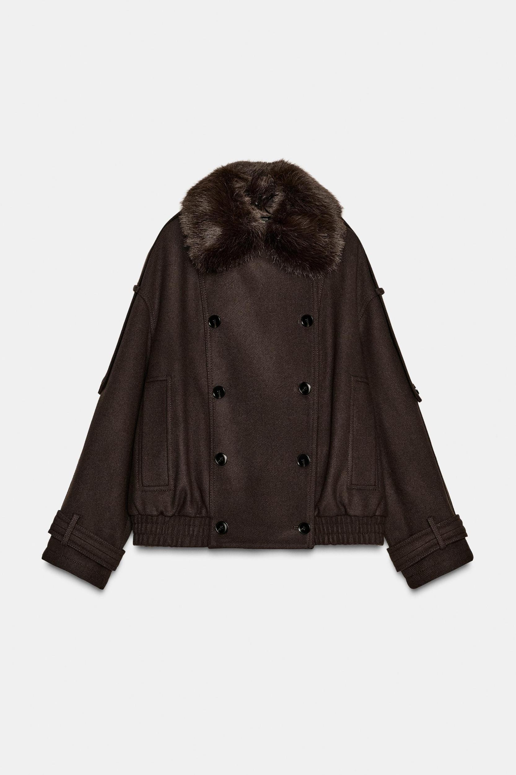 ZARA WOMAN COLLECTION Jacket made of wool blend yarn. Lapel collar with detachable faux fur application. Front pockets. Shoulder tab detail. Elastic hem. Inner lining. Front button closure.