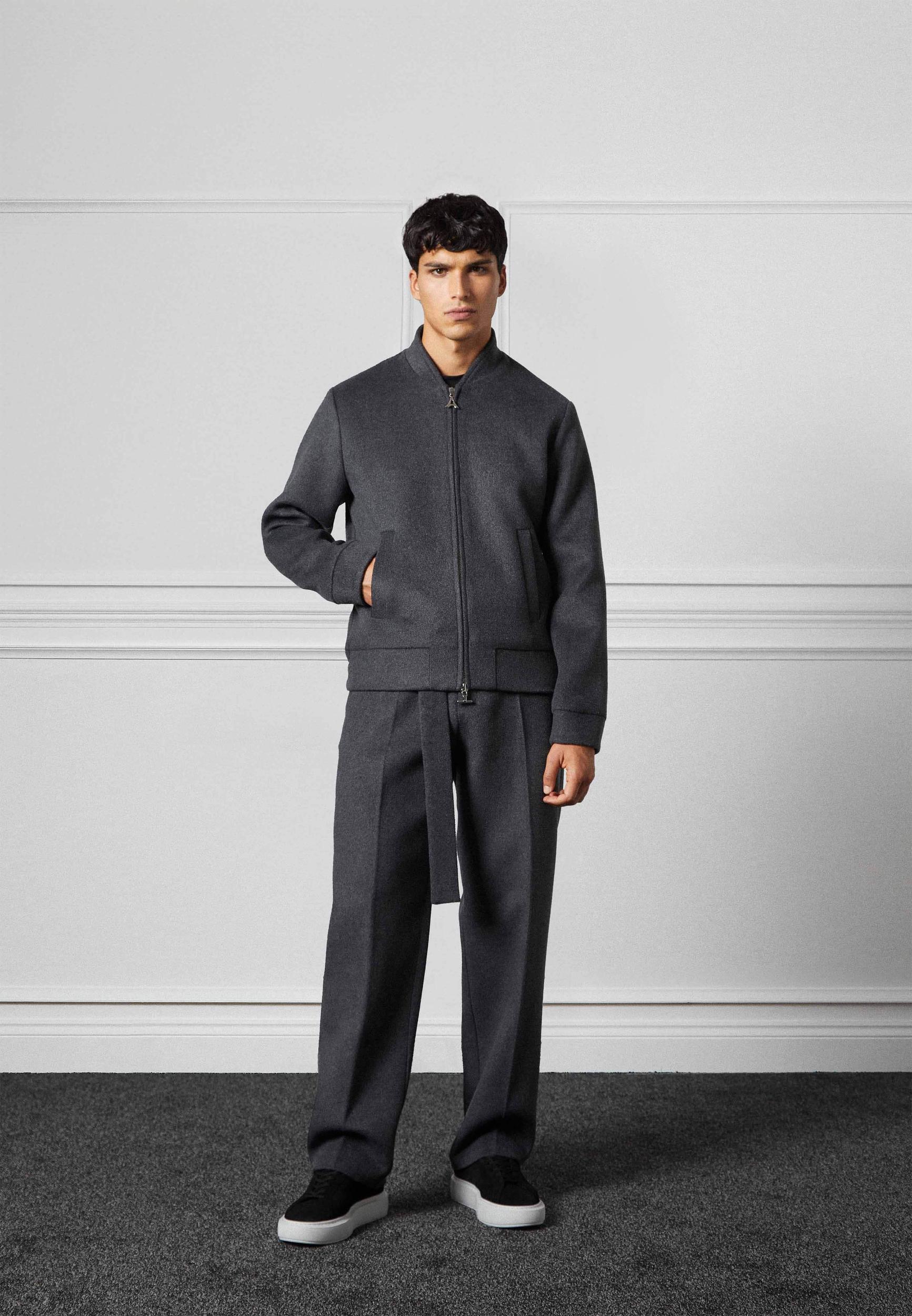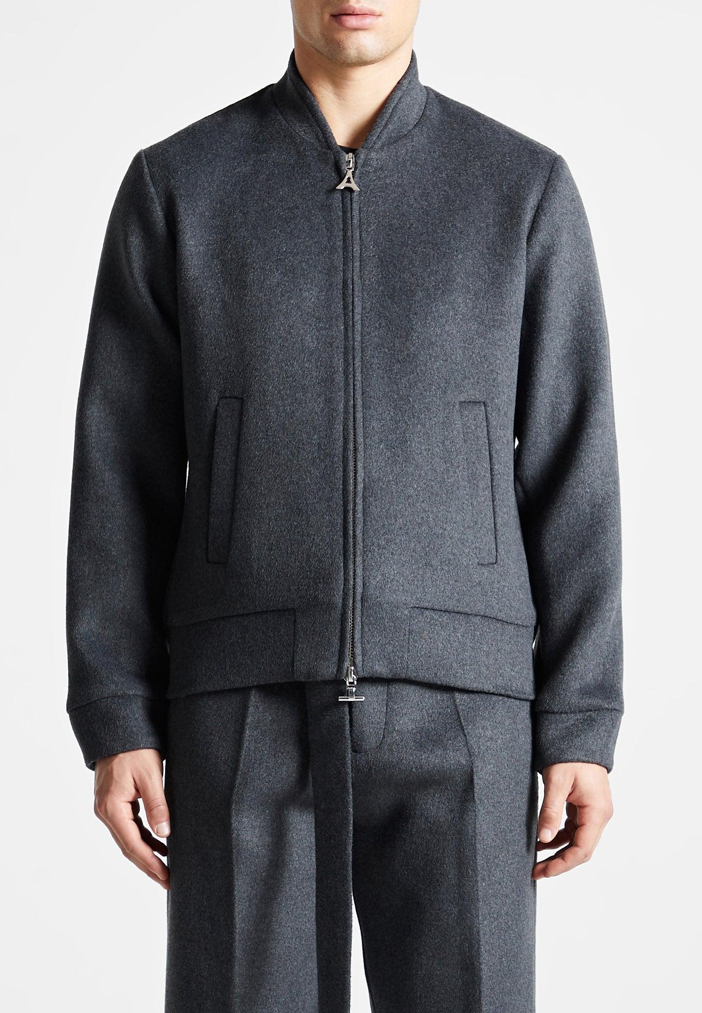 Featuring a bomber silhouette, this wool blend marl bomber jacket in a staple charcoal grey is the perfect way to stay warm in ultimate comfort and style. Crafted from a sumptuous wool blend. Complete the look with our Wool Belted Trousers. Bomber Silhouette Two Welt Pockets on Front Internal Welt Pocket Elasticated Back Hem Satin Lining Manière De Voir Silver Plaque on Back Manière De Voir Silver Eiffel Zip 30% Wool / 70% Polyester/ 97% Polyester / 3% Elastane Always check the care label for wash instructions.