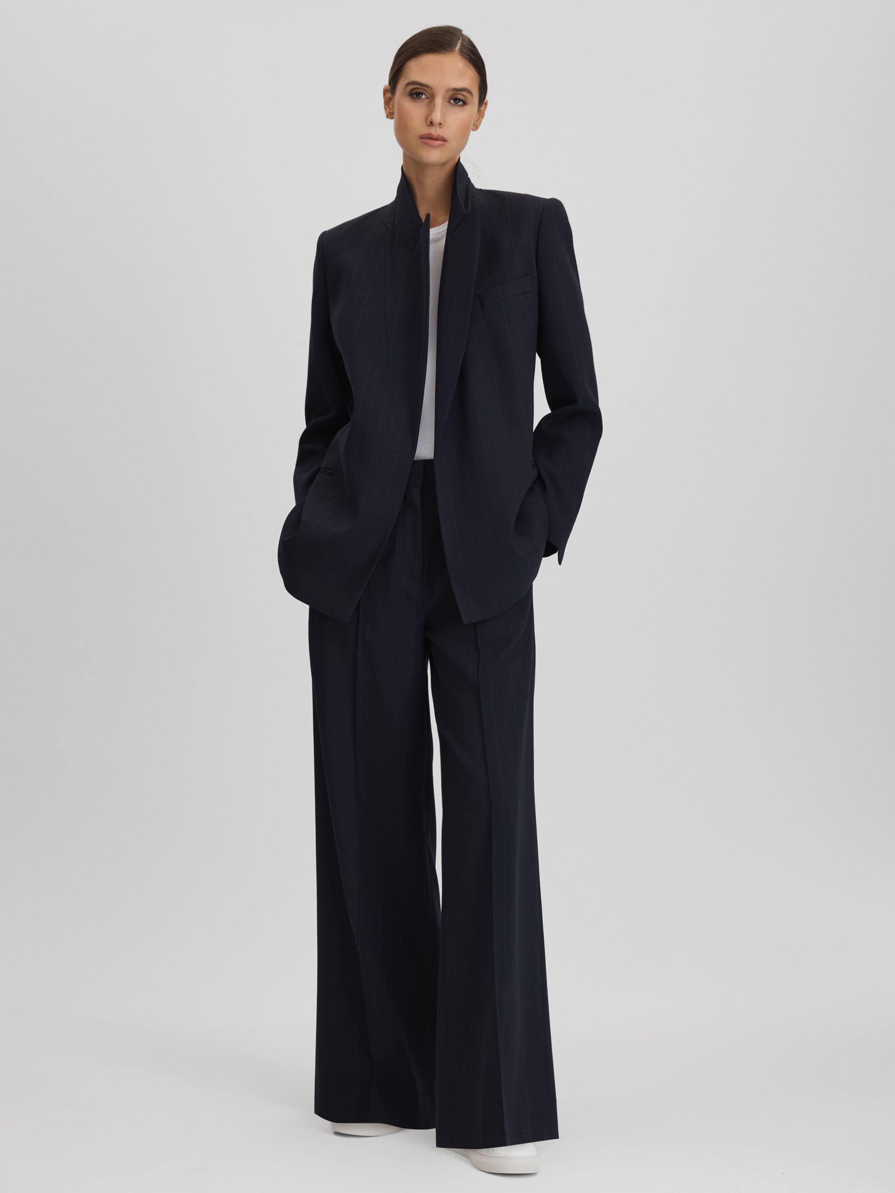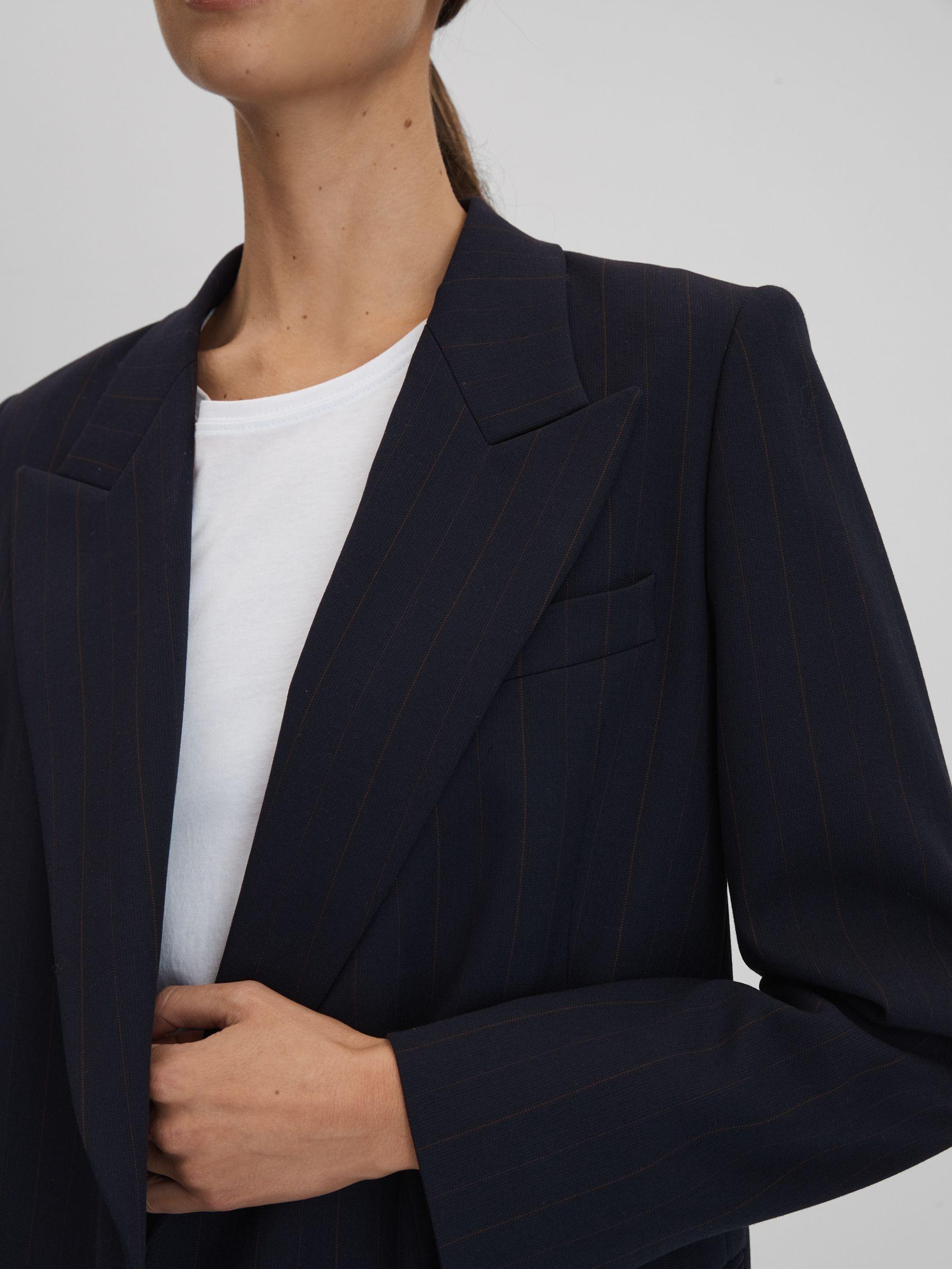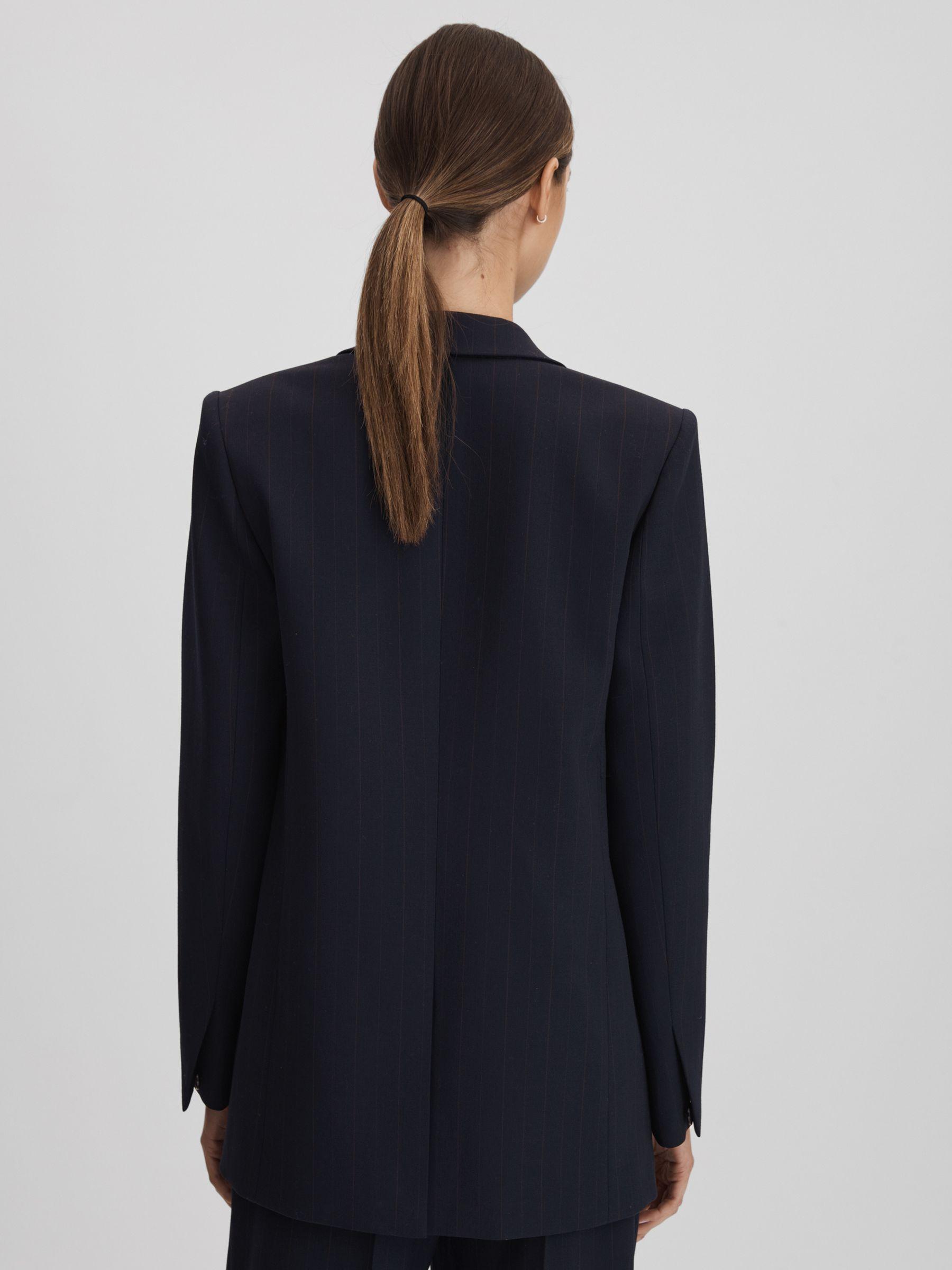 The Willow wool-blend blazer comes in a single-breasted, unbuttoned silhouette with confident shoulder padding. A soft navy pinstripe design features throughout. Choose the matching trousers and waistcoat for a modern suiting agenda. Wool blend Pinstripe design Single breasted Peak lapels Unbuttoned silhouette Jetted pockets Padded shoulders Long sleeves Concealed buttoned cuffs Vent to reverse Lined
