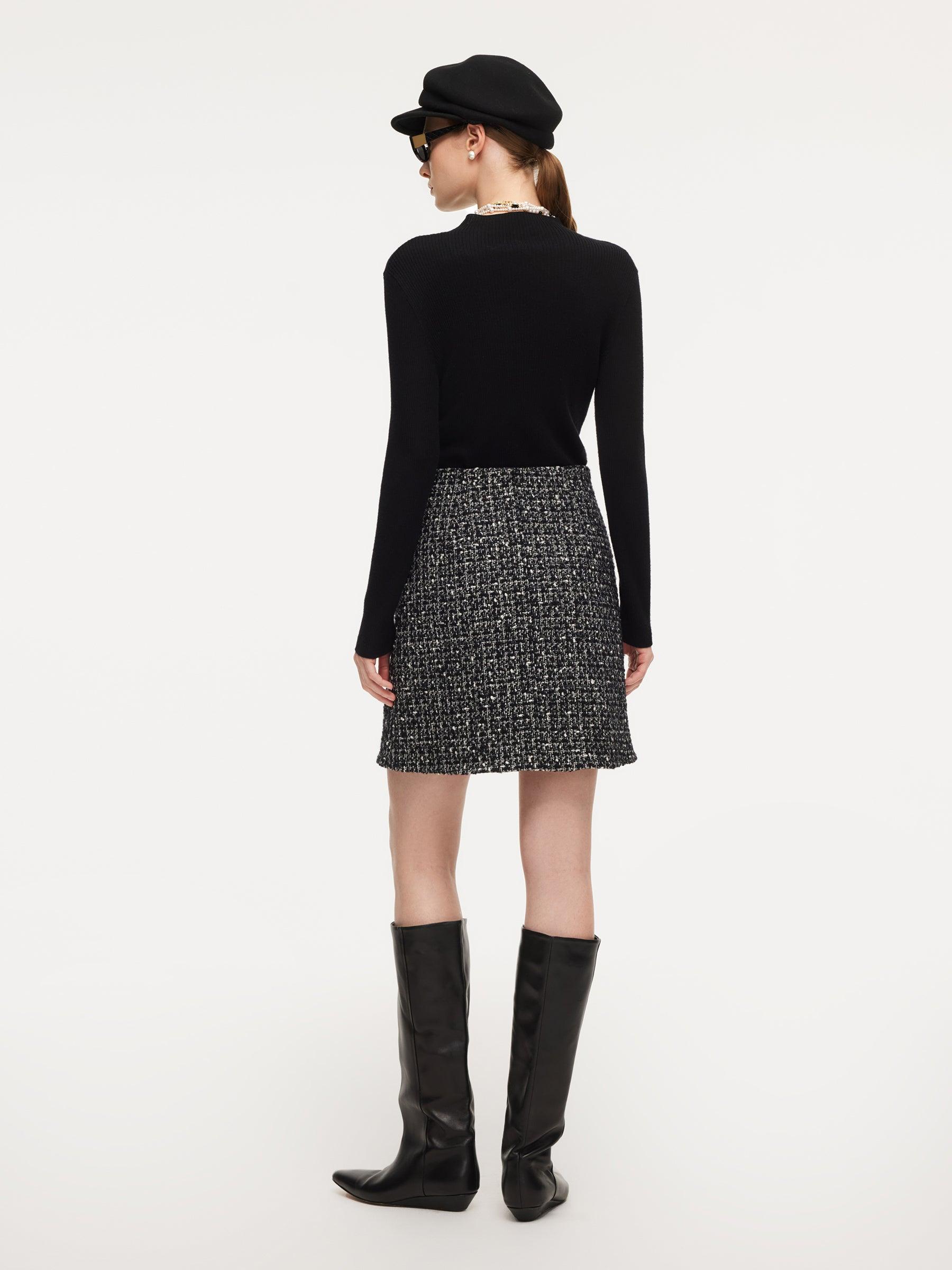 -Two-piece set -Wool Blend -H-line cropped jacket This elegant two-piece set includes a cropped jacket and matching mini skirt made from a soft, warm wool-blend fabric with a classic vintage feel. The round neckline is flattering and easy to layer over turtlenecks or shirts. The subtly cropped H-line jacket enhances pr