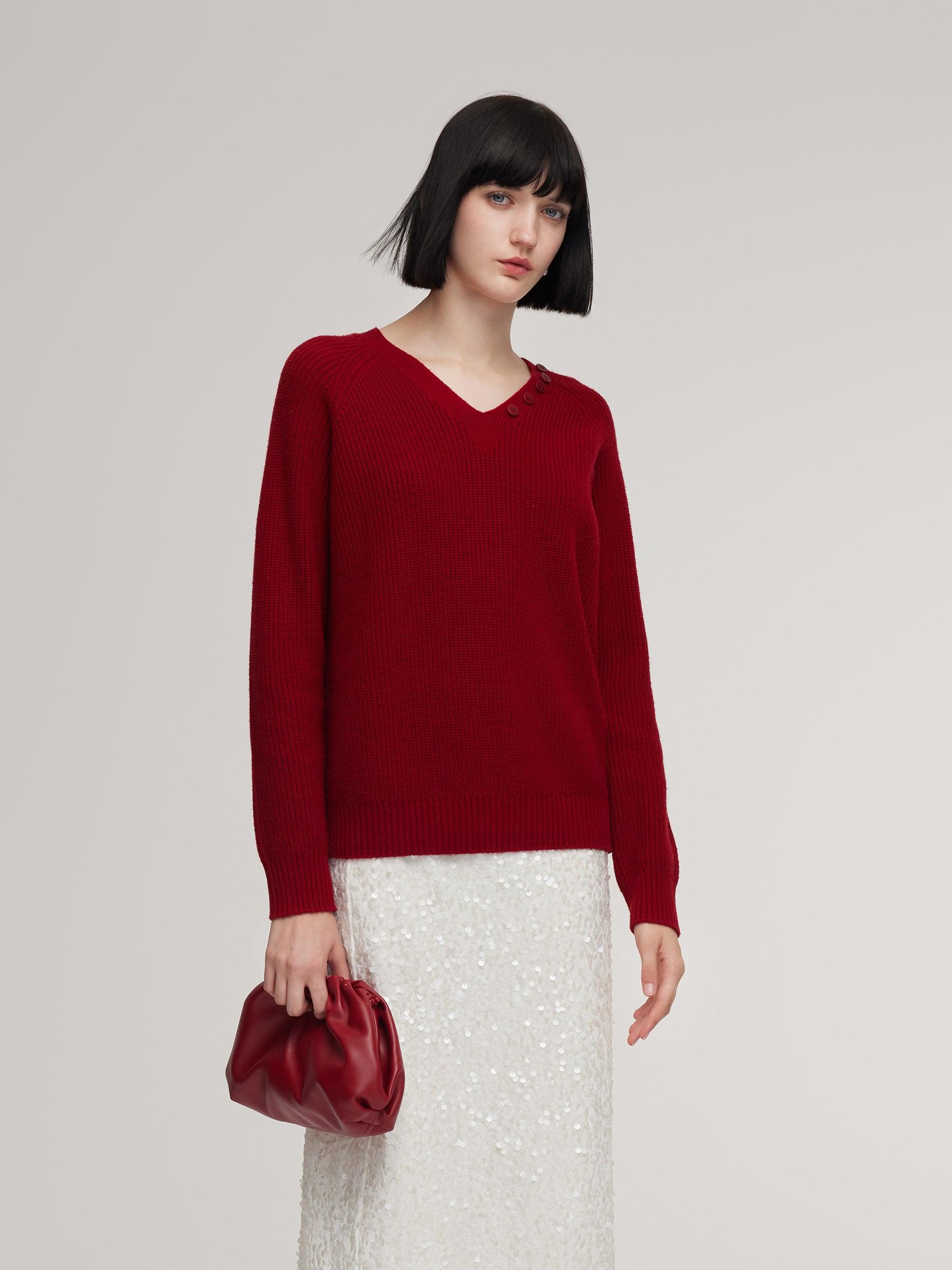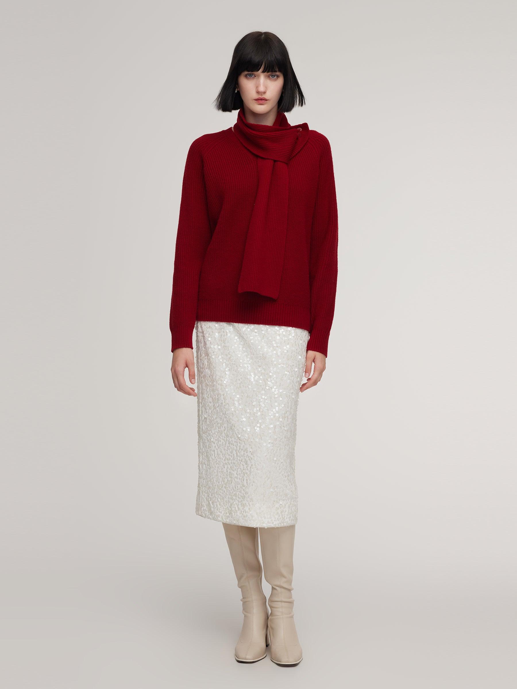 -Wool blend -With detachable scarf -Soft and comfortable Crafted from a soft wool-blend fabric, this sweater features a flattering V-neckline accented with a decorative button on the left side. It comes with a matching detachable scarf made from the same fabric, offering versatile styling options. Elegant yet cozy, it'
