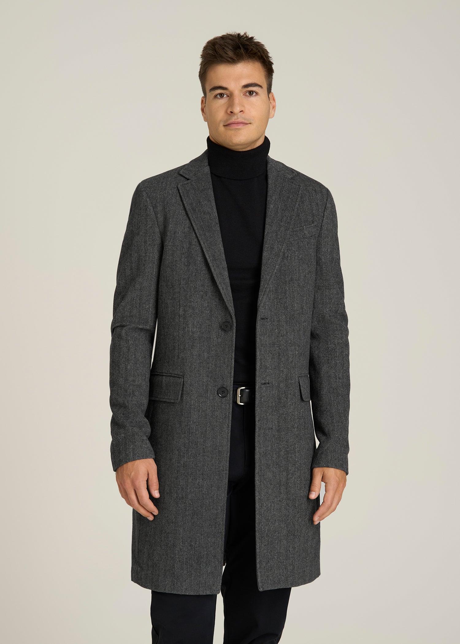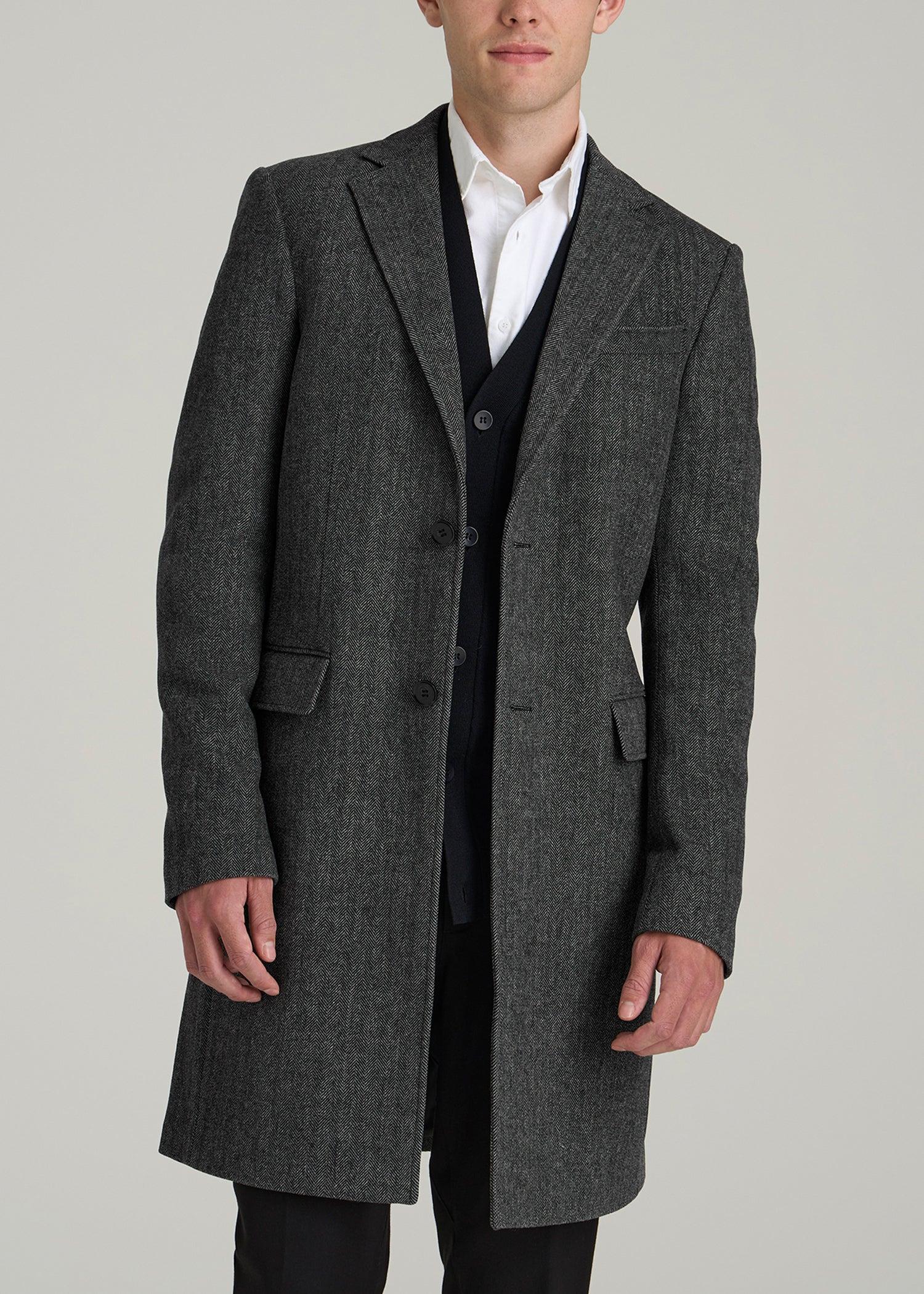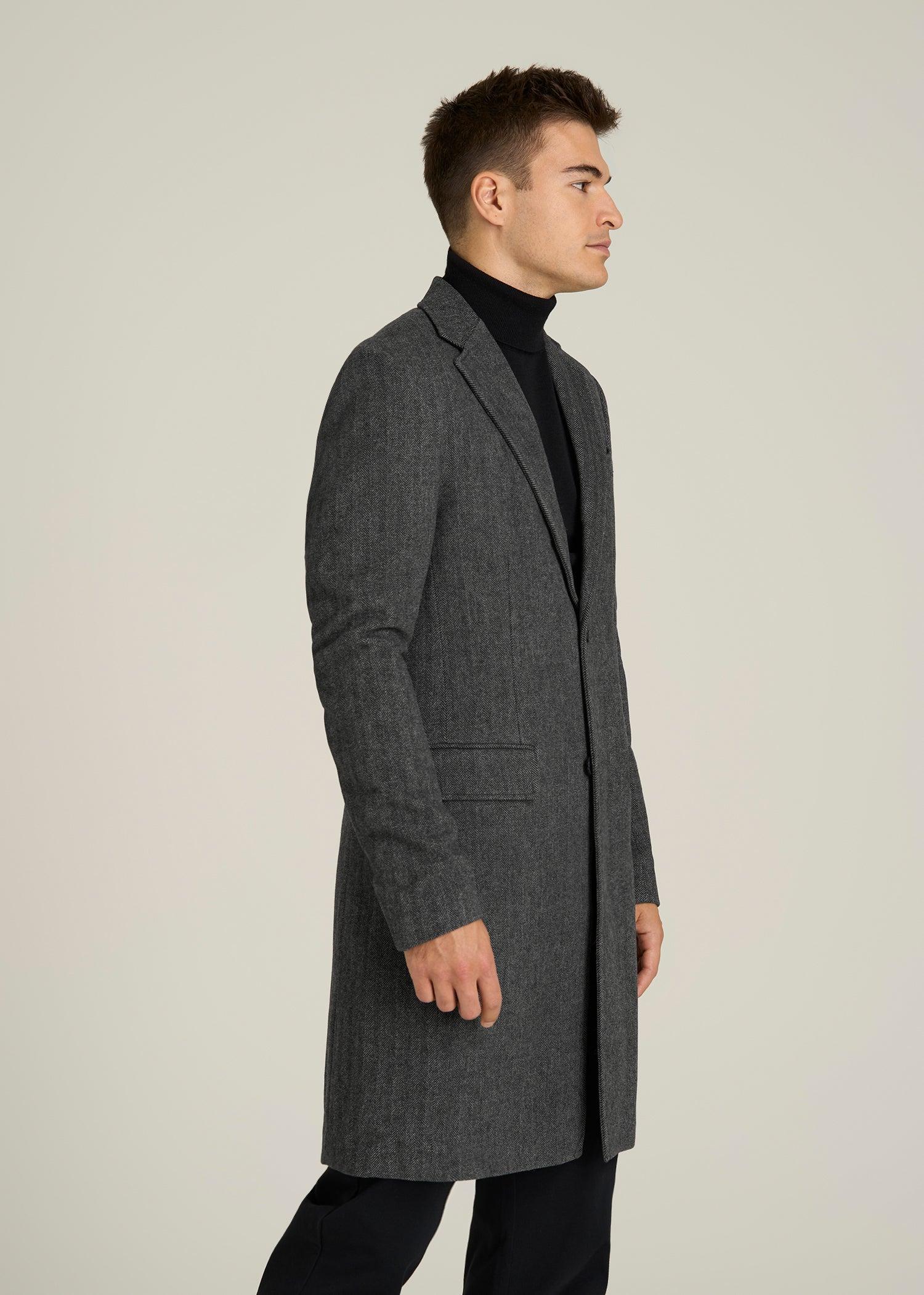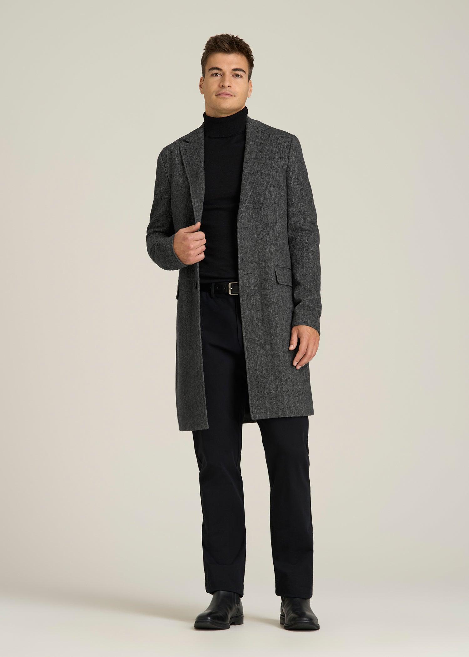 Timeless, stylish and built for your frame. This tall men's coat is essential in every guy's wardrobe, a staple piece that will instantly elevate any outfit while keeping you warm. Every seam has been measured specifically for men between 6'3” and 7'1”, with extra-long sleeves that will cover your tall guy arms and a mid-thigh length that will actually end where it's supposed to. The clean lines of this coat for tall men provide a polished look while the notch lapel and two-button front closure will make you look like the most distinguished gentleman in the room. We carefully sourced a premium wool blend for the exterior and a poly satin lining for the interior to protect you from the cold weather. A coat this classy deserves the best care. Make sure to dry clean your coat so it lasts you for many winters to come. Wear it with jeans and a knit sweater or chinos and a button-down shirt – this wool coat will go with literally everything.