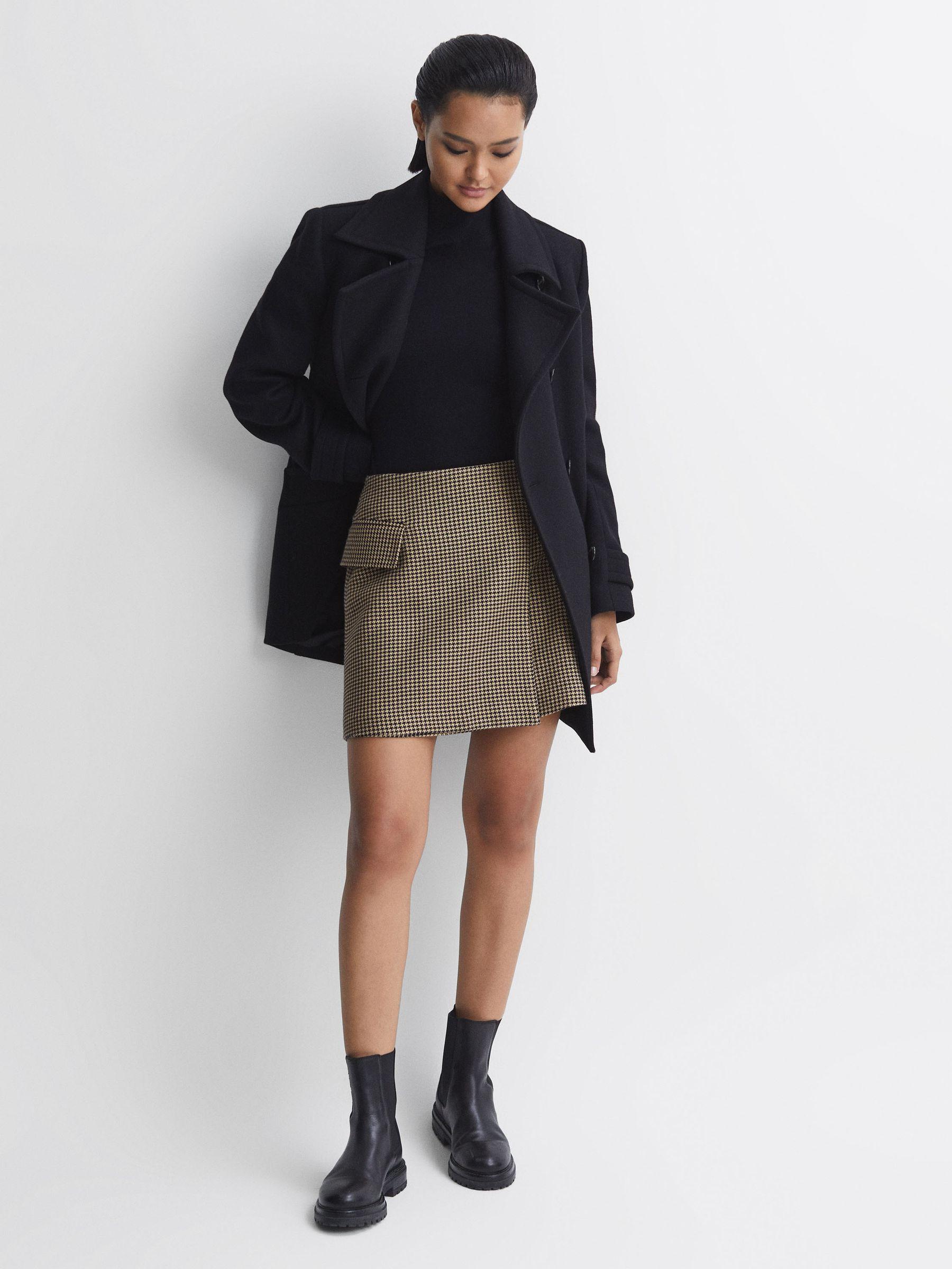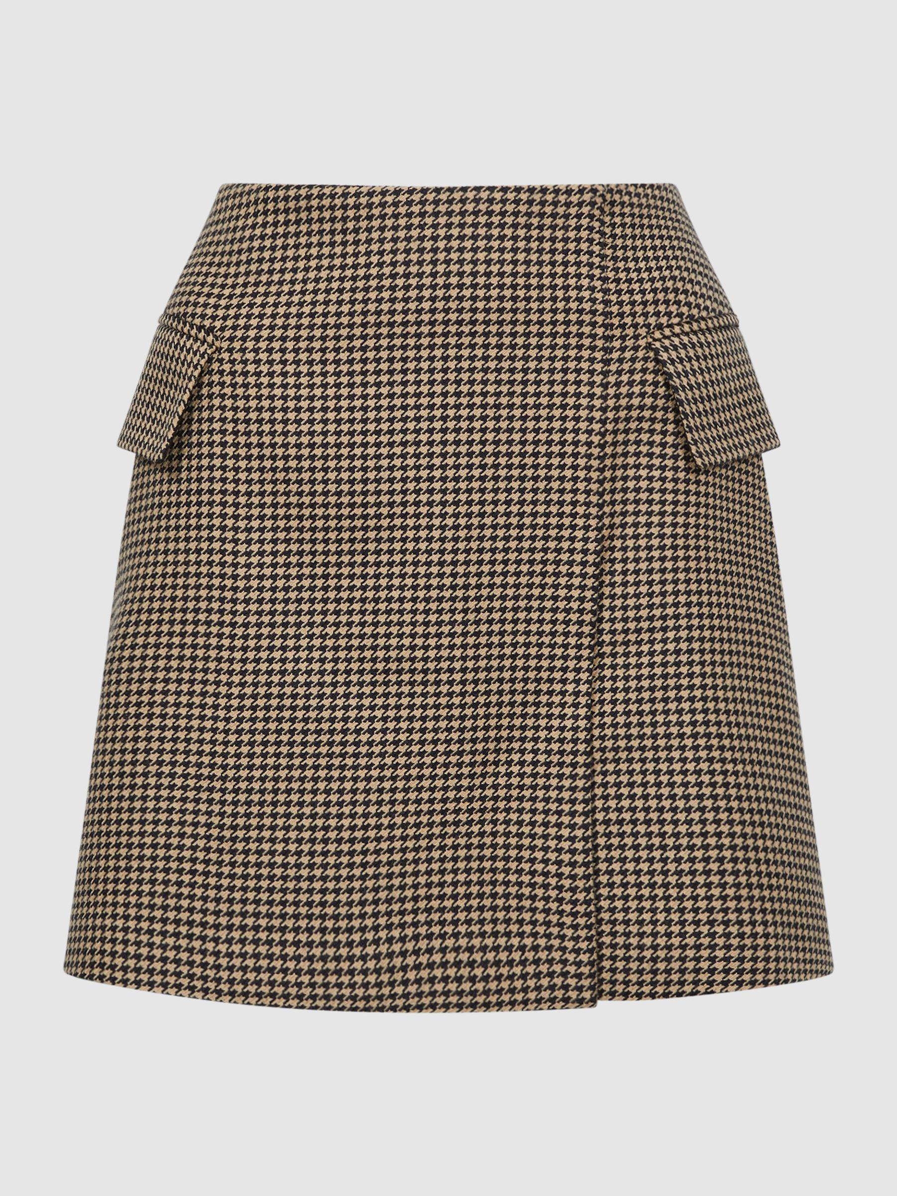 Contemporary and classic in equal measure, the Ella skirt is the perfect pick to complete your smart-casual wardrobe. It s crafted from a wool blend into a heritage-inspired black and camel dogtooth design. It s chic mini length lends it to pairing with a tucked-in blouse and heels. Wool blend. Dogtooth design. Wrap design. High rise. Flap pockets. Mini length.