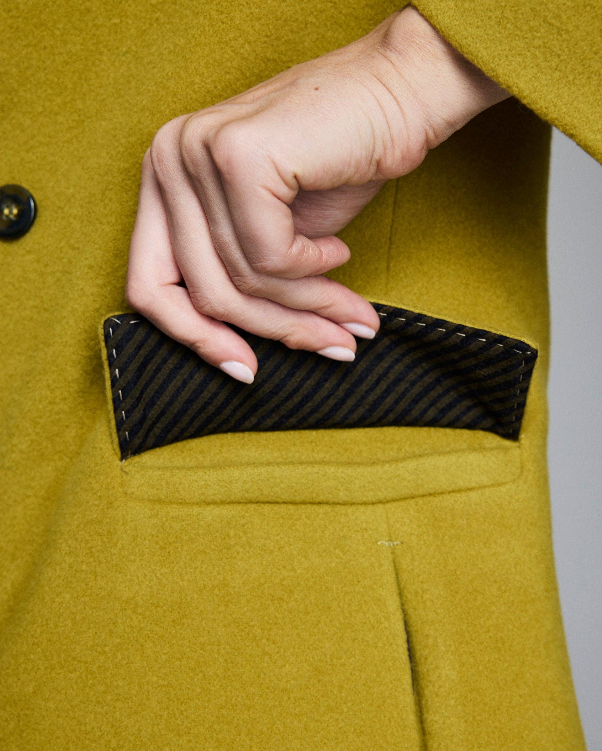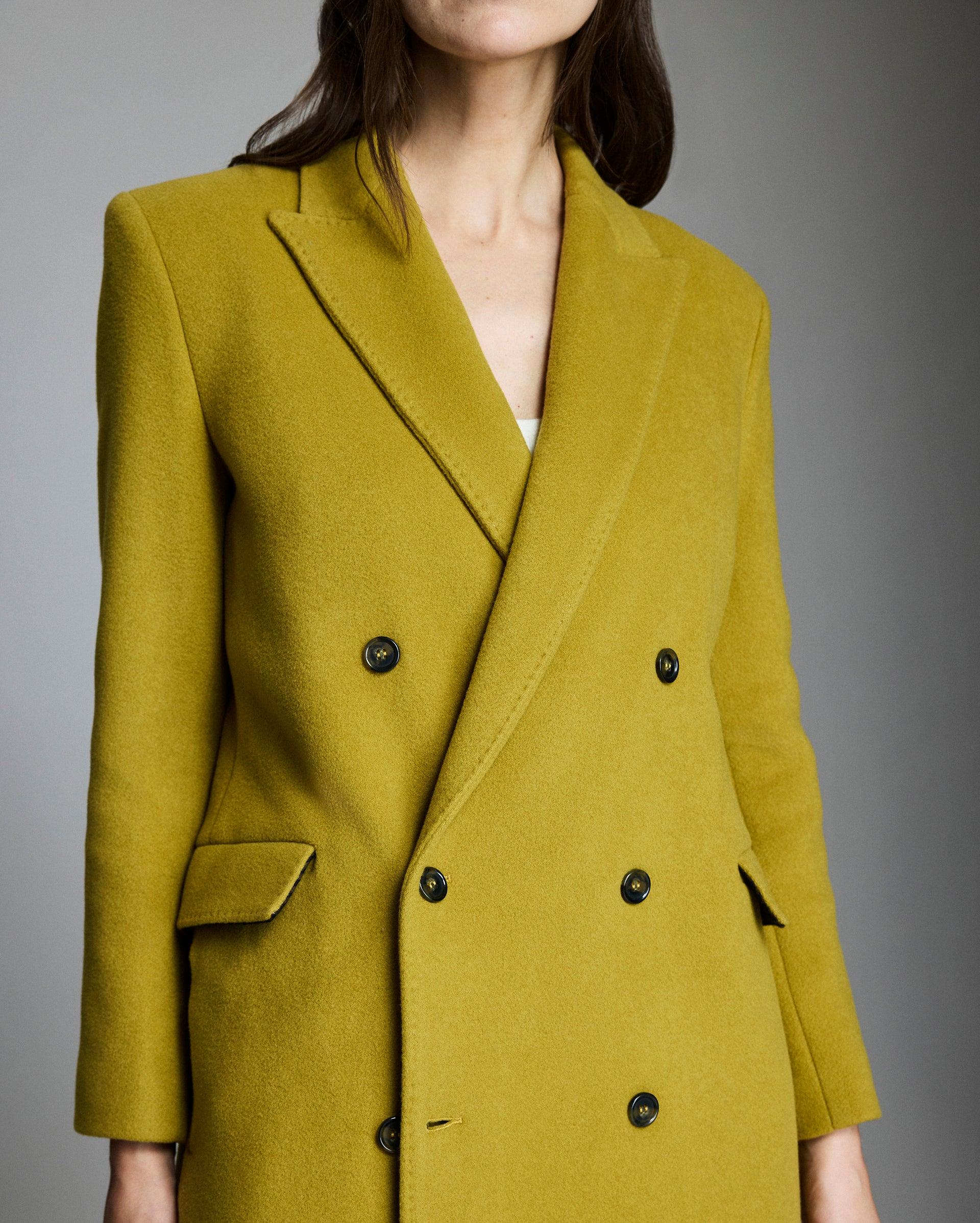 A statement coat to carry you through the season, crafted in an eye-catching chartreuse wool blend and double-breasted silhouette, finished with peak lapels. Refined details include dark horn buttons throughout, double welt flap pockets at the waist and on-seam pockets at each side, and full custom camel lining with ou