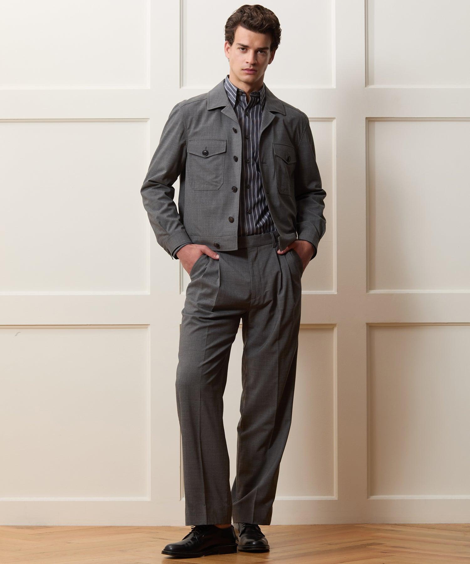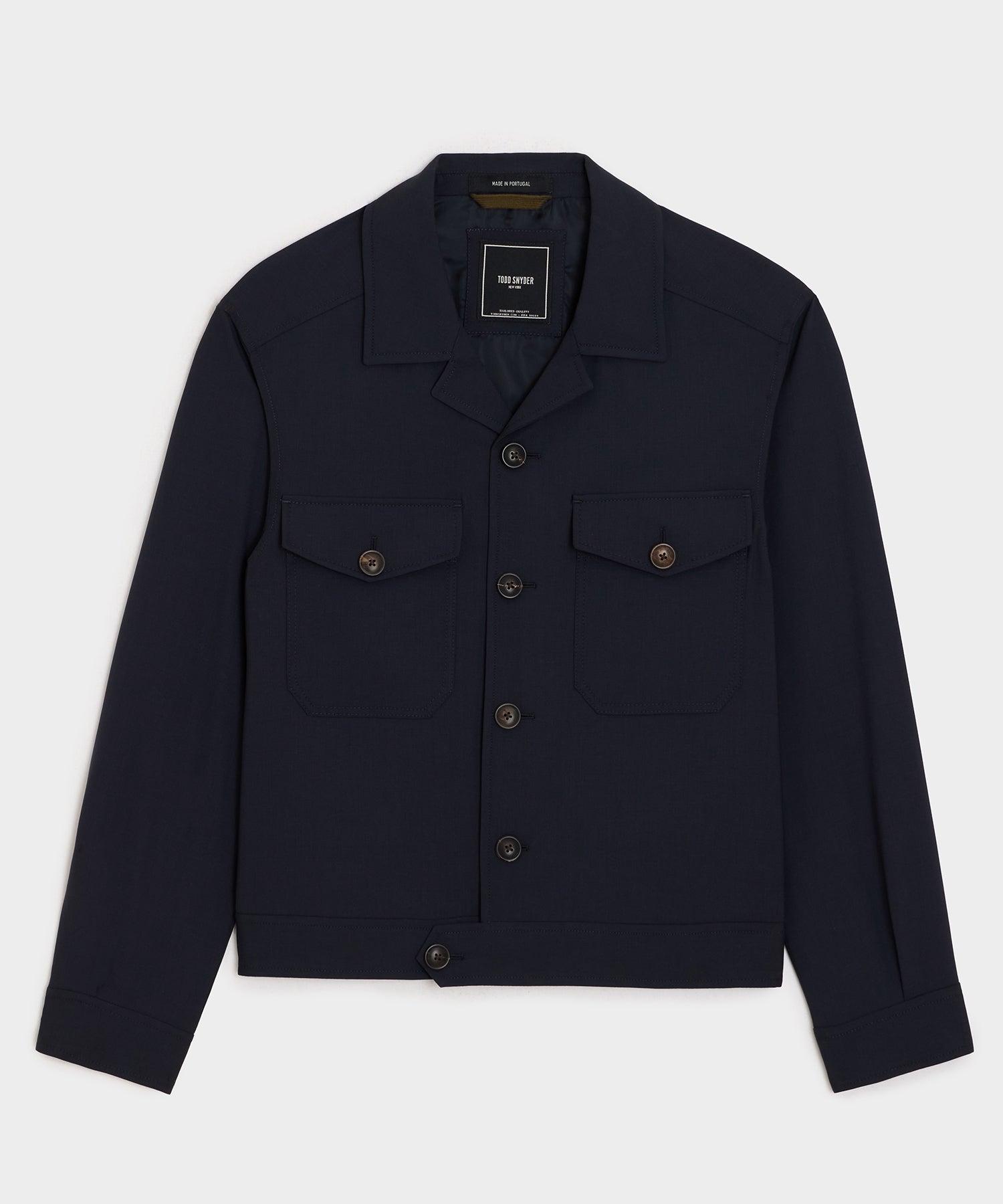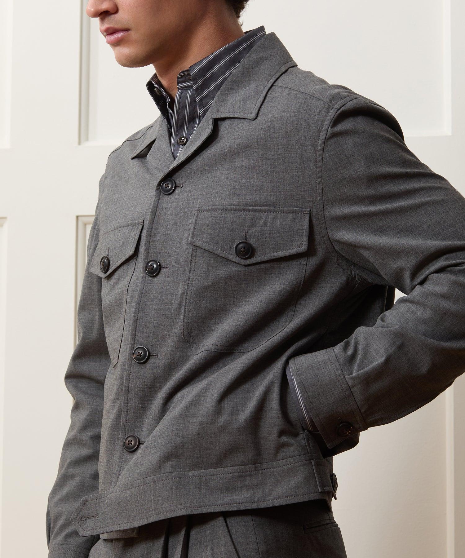 This Eisenhower Jacket is a military-inspired style with an on-trend, slightly cropped fit. It’s made from the same Italian wool fabric we use in many of our suits: sleek and smooth, with good drape and light enough to work perfectly as a transitional layer. The two-piece sleeves sit slightly off the shoulder, and the jacket is pleated at the back and cuffs for extra volume — just tighten the tabs at the waist for a rounded, retro look. The silhouette is a strong proportion play, and looks great with trousers with a higher rise. 97% Virgin Wool, 3% Elastane Classic Fit Model is 6'2" and is wearing a size Medium Cropped Point Collar Fully Lined Horn Buttons Patch-and-Flap Chest Pockets Hand Pockets Two Interior Pockets Side Tab Adjusters Pleats at Back and Cuffs Fabric from Portugal Garment Made in Portugal Dry Clean Only. Do Not Bleach. Cool Iron As Needed. Do Not Tumble Dry Style OU0242682