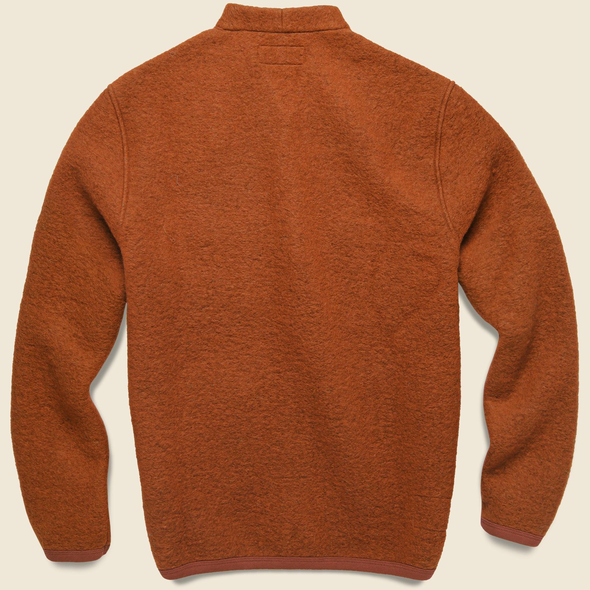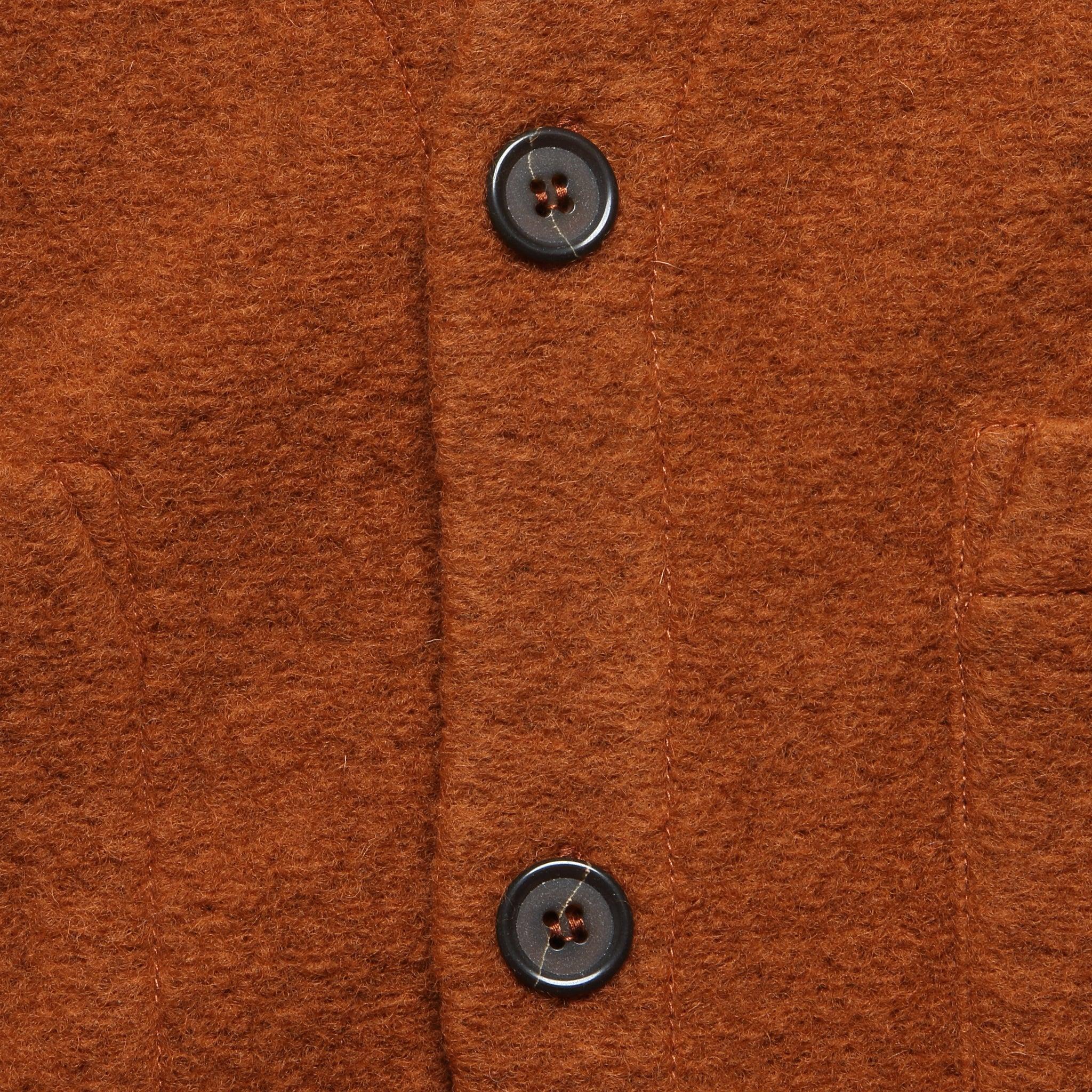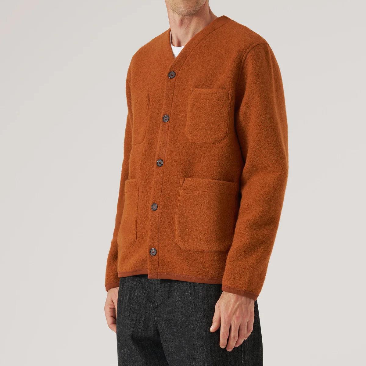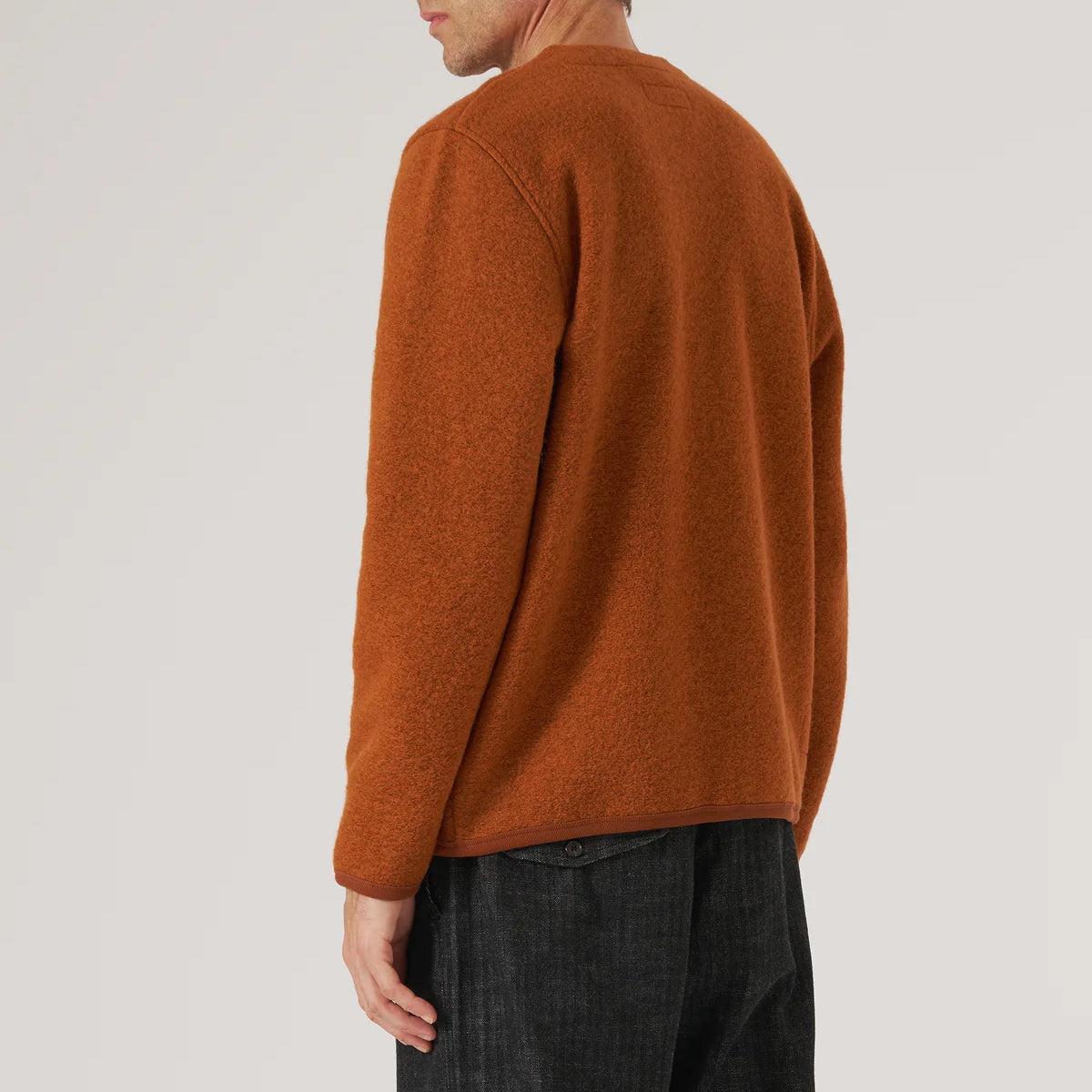 A cold-weather, chore-style cardigan with simple, workwear-inspired details like internal and external patch pockets, a short boxy fit, a high collar, and a five-button front. Made with a durable medium-weight melange wool fleece for softness and warmth, and featuring tonal soft cotton-trimmed cuffs and hem. Midweight melange wool fleece Workwear-inspired details Internal and external patch pockets Five-button front Cotton trim around the neck, cuff, and hem for comfort Traditional fit that runs true to size We recommend taking your normal size or taking one size up for a more relaxed fit Made in Portugal Materials: 65% wool, 35% recycled polyester | Trim: 100% cotton The following measurements are for size Medium: Chest: 44” | Shoulder: 17” | Sleeve: 33 ½” | Length: 25”