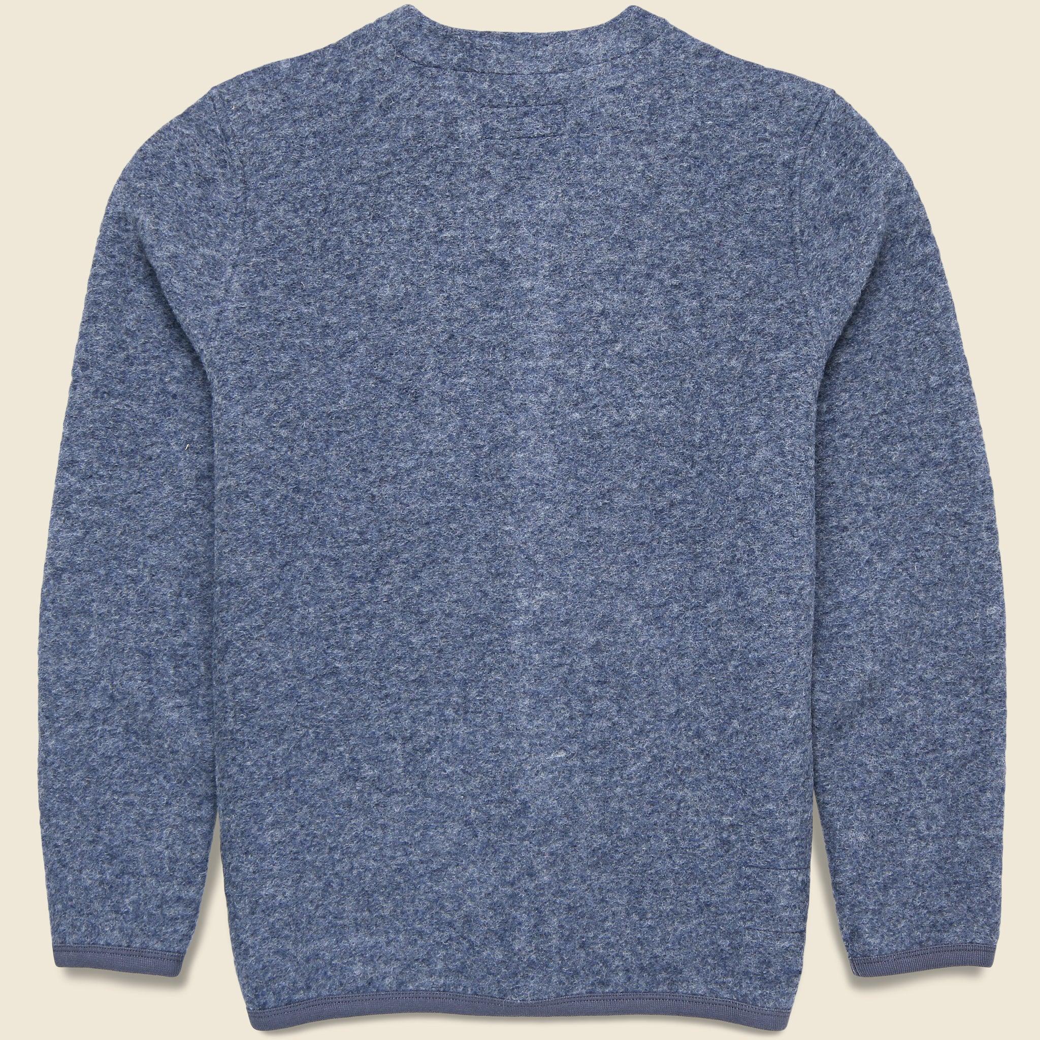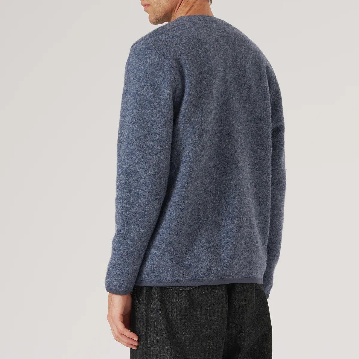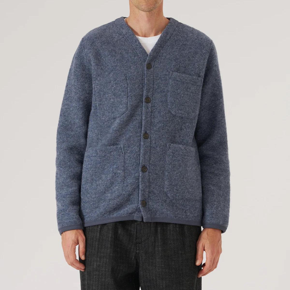 A cold-weather, chore-style cardigan with simple, workwear-inspired details like internal and external patch pockets, a short boxy fit, a high collar, and a five-button front. Made with a durable medium-weight melange wool fleece for softness and warmth, and featuring tonal soft cotton-trimmed cuffs and hem. Midweight melange wool fleece Workwear-inspired details Internal and external patch pockets Five-button front Cotton trim around the neck, cuff, and hem for comfort Traditional fit that runs true to size We recommend taking your normal size or taking one size up for a more relaxed fit Made in Portugal Materials: 65% wool, 35% recycled polyester | Trim: 100% cotton The following measurements are for size Medium: Chest: 44” | Shoulder: 17” | Sleeve: 33 ½” | Length: 25”