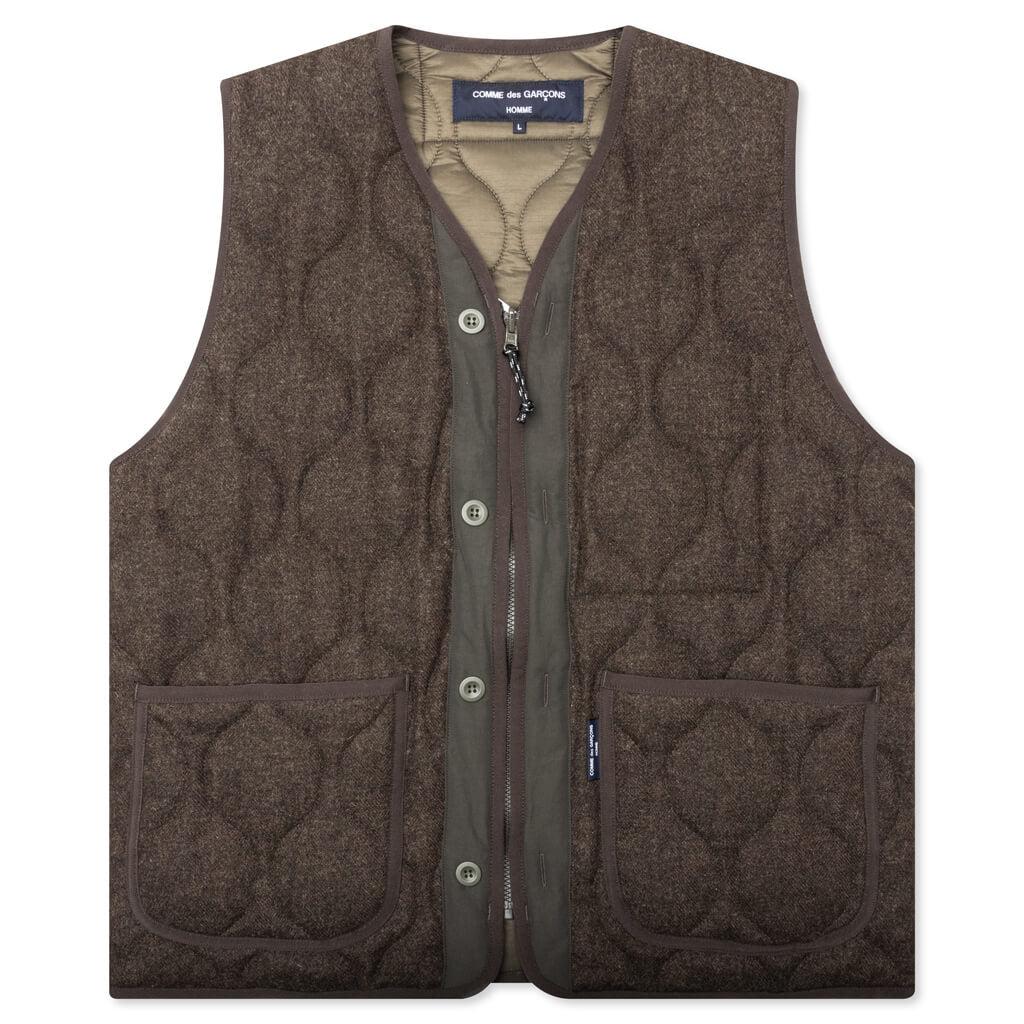 Comme Des Garçons expands its Homme collection with the Wool Herringbone Quilted Vest. This transitional piece is constructed from a wool blend and features a quilted construction that ensures warmth and comfort. The garment has a zip closure with decorative buttons as well as side pockets for functionality. Woven branded labels placed throughout the design complete the look. Wool blend Quilted construction Zip closure Side pockets Woven labels Style No: HL-V002-051-2