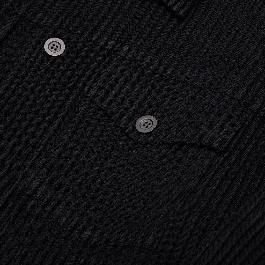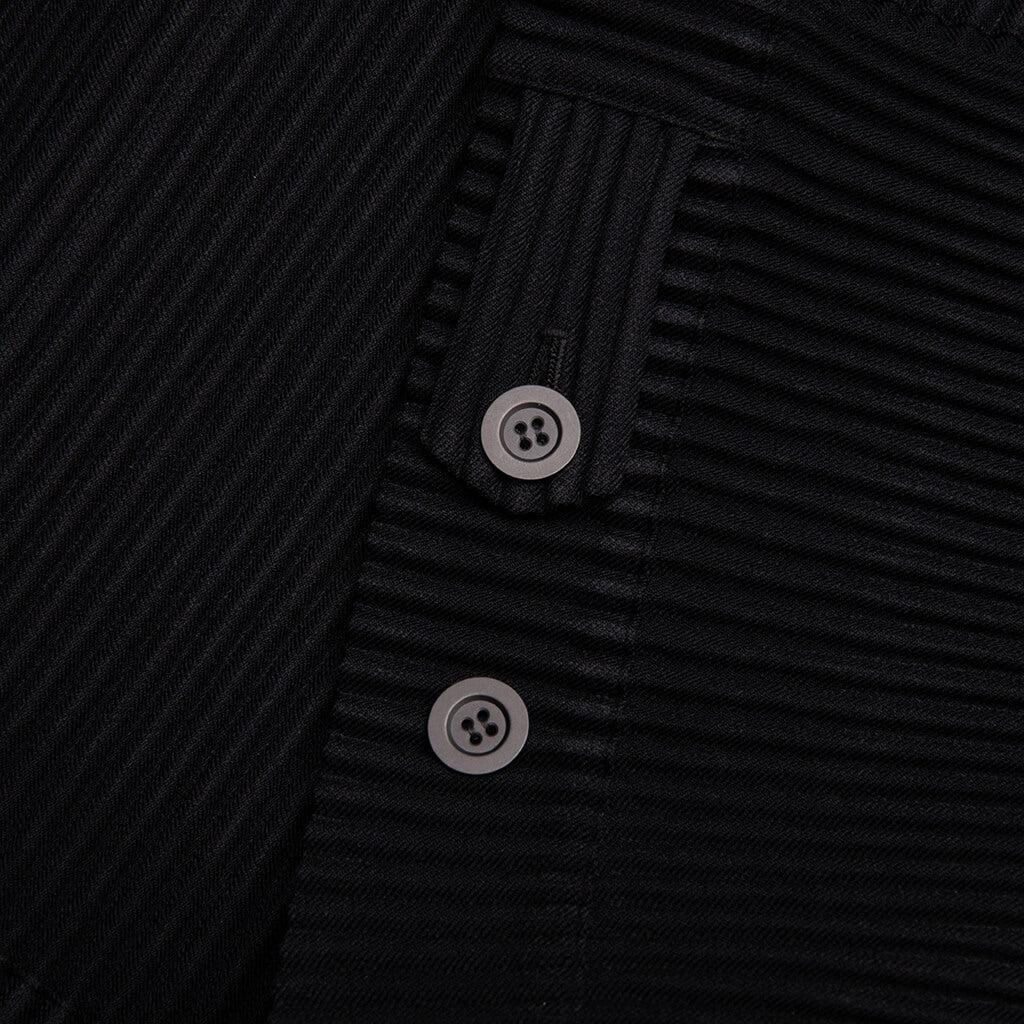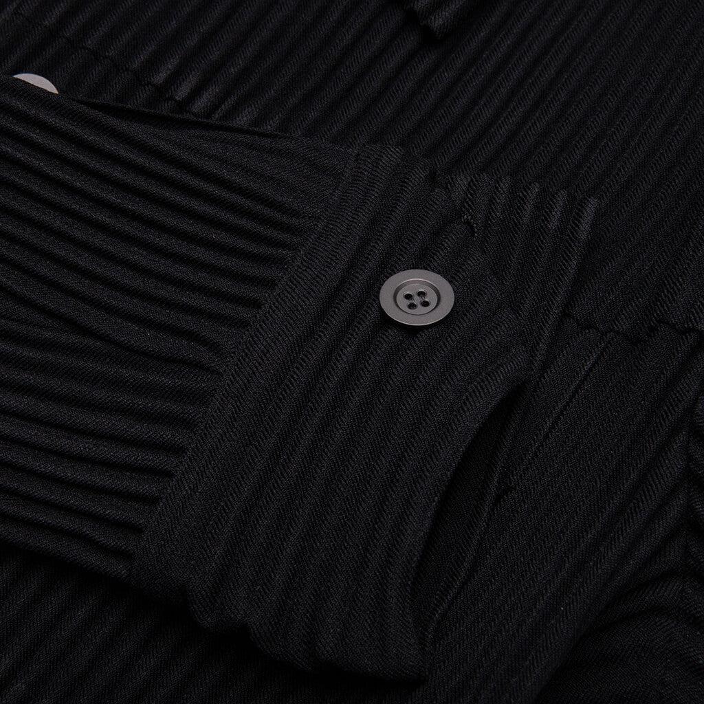 The Wool Like Light Trucker Jacket in Black delivers the textured appeal of wool with the lightweight functionality of polyester. Crafted from space-dyed fabric and finished with Homme Plissé Issey Miyake’s signature pleated construction, it offers structure, breathability, and modern refinement. Chest and side pockets add utility, while the tailored cut makes it suitable for layering or standalone wear. 100% Polyester Signature pleated fabric Space-dyed Lightweight wool-like texture Button-up front closure Point collar Style No: HP56FC250-15