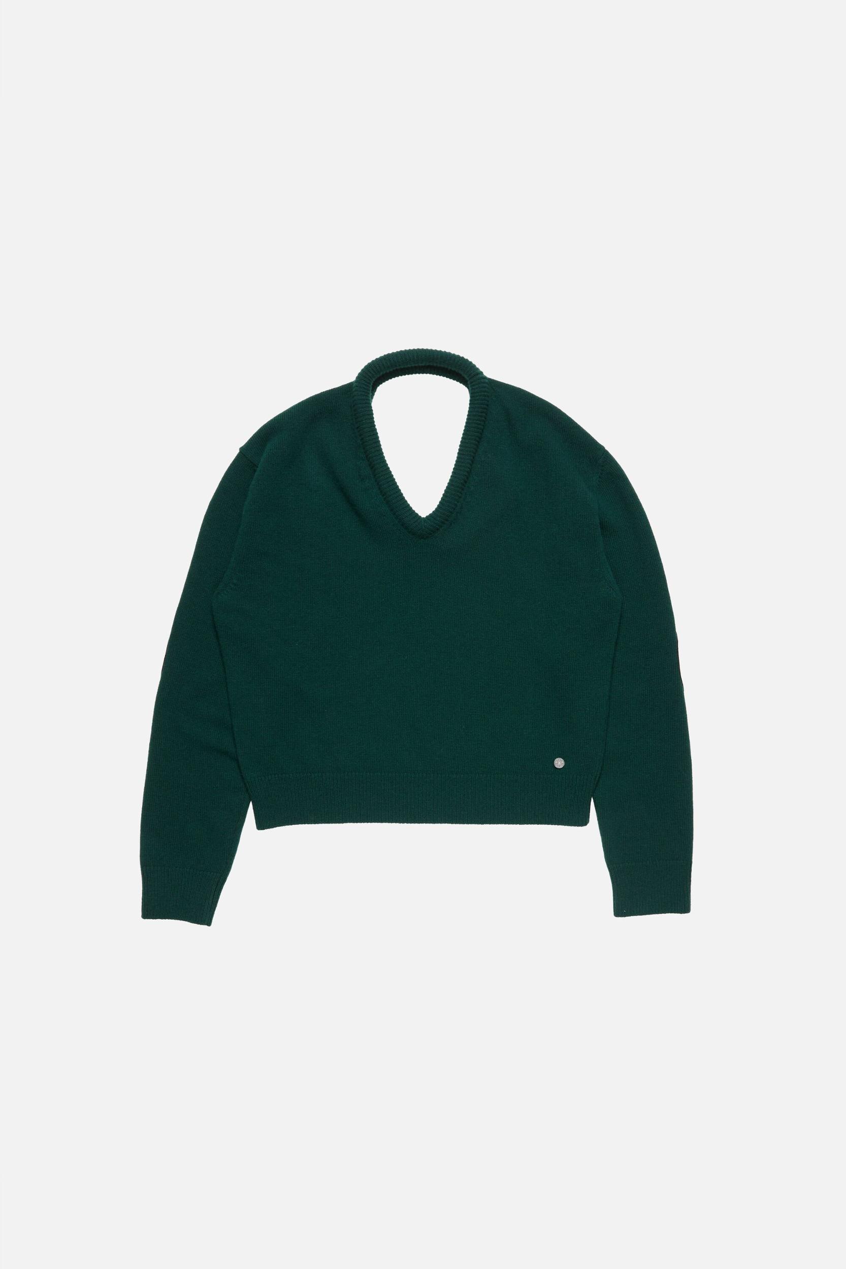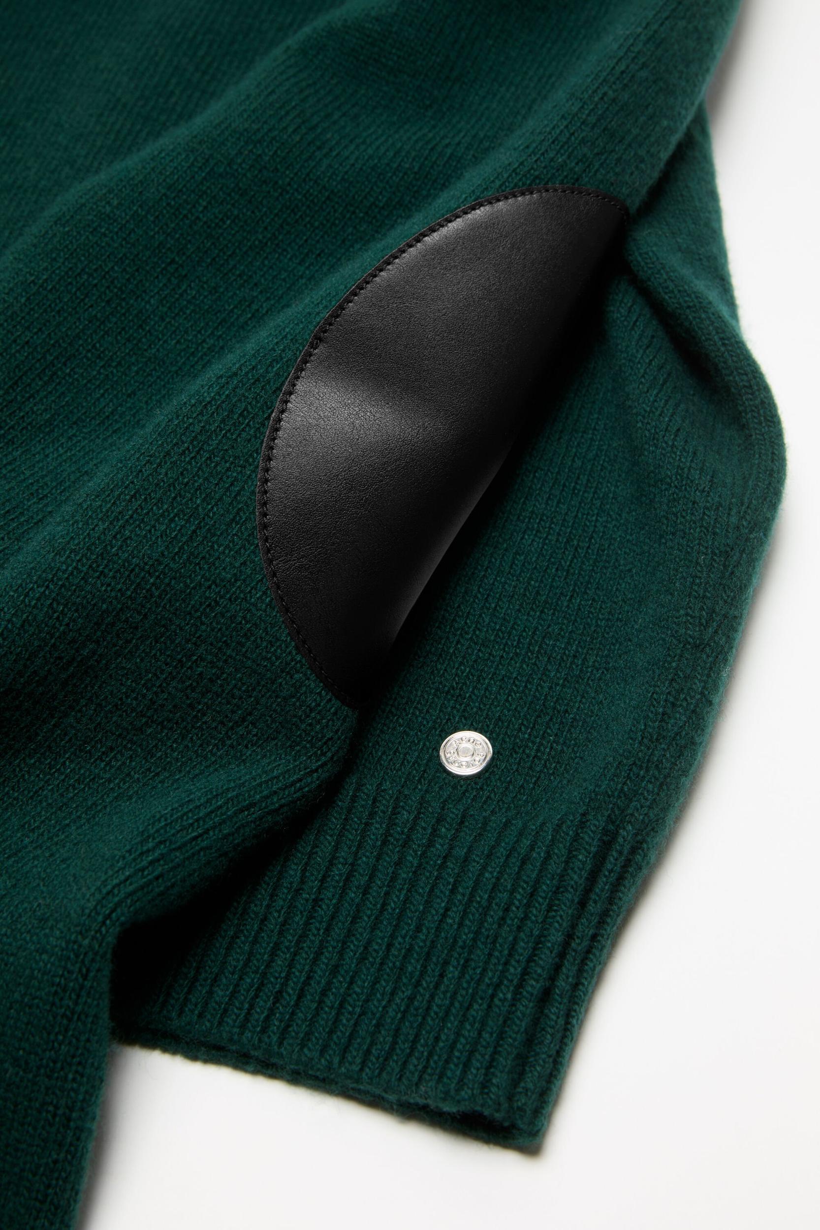 V-neck sweater crafted from soft wool, featuring a 3D neck trim with a triangular cut-out at the back. Detailed with leather tonal elbow patches, ribbed trim, and a branded rivet at the hem. Cut to a regular fit and below-waist length. FN-WN-KNIT001005