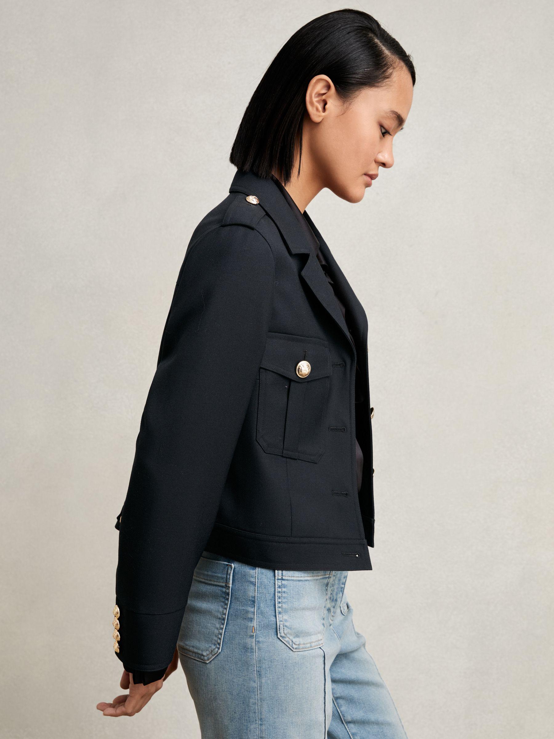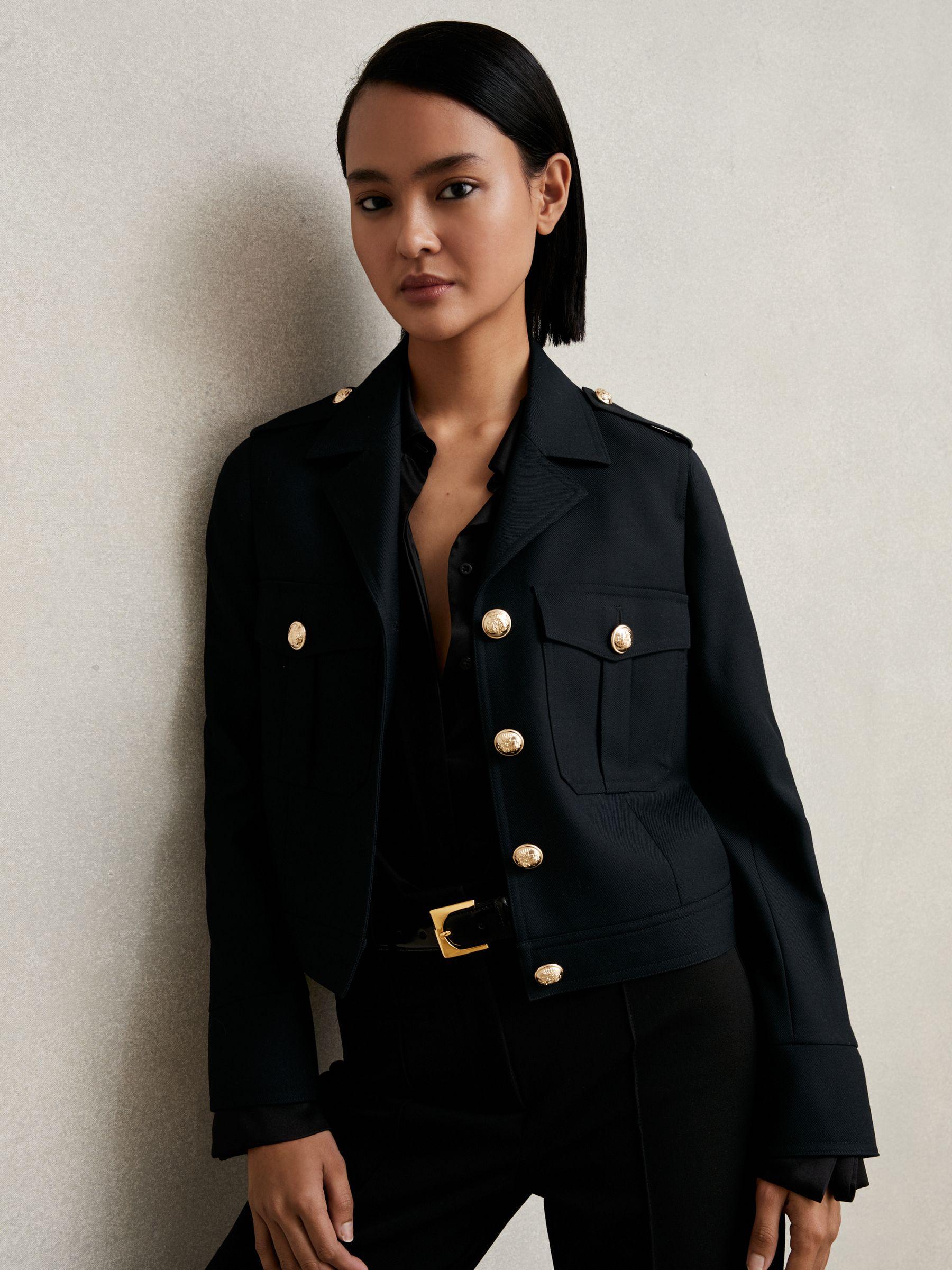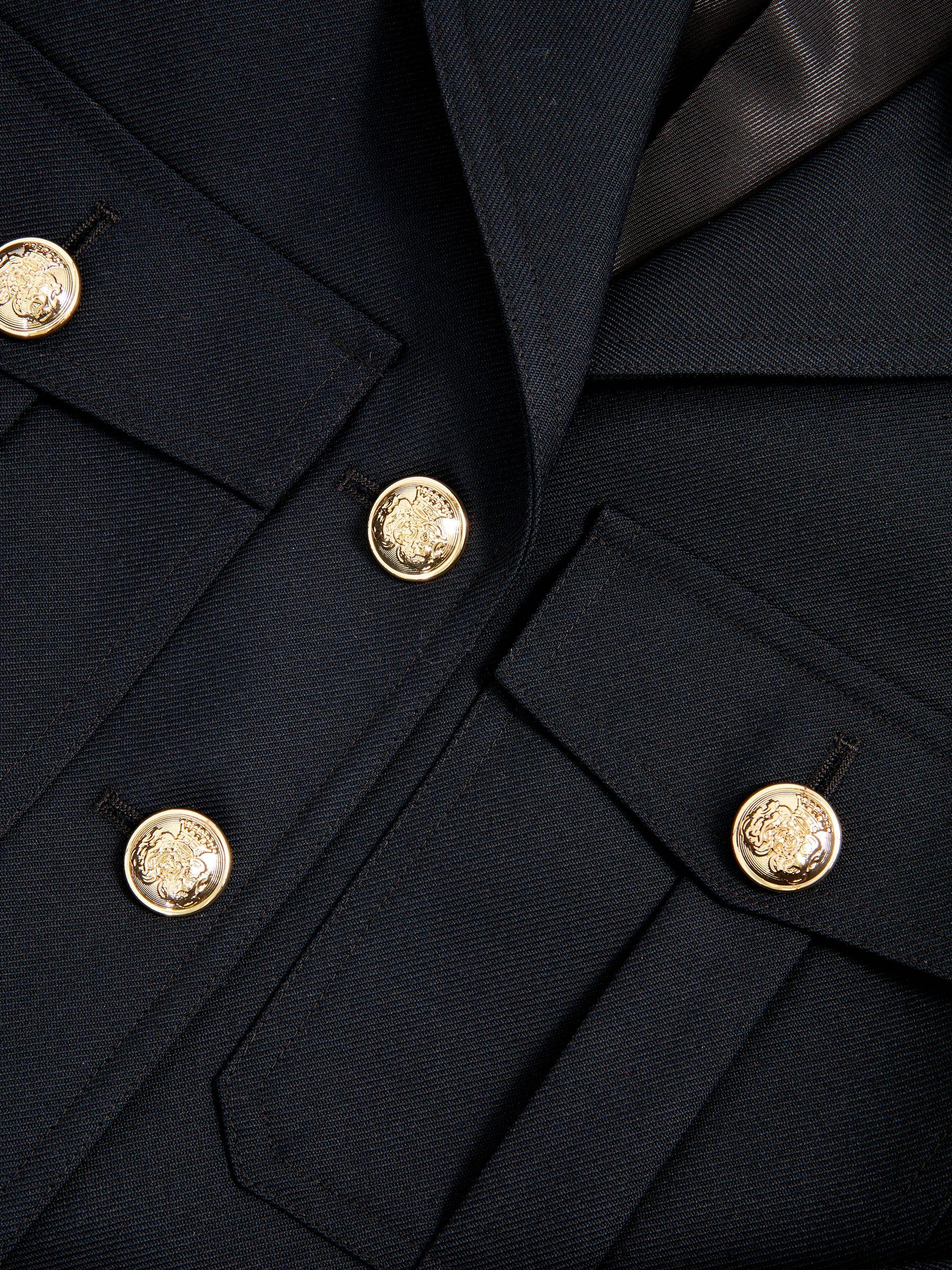 The Jaque jacket is tailored from wool twill in a structured, cropped silhouette. Crest-embossed gold-tone buttons and buttoned epaulettes nod to classic military styling, while pleated flap pockets and adjustable side tabs lend practical detail. 100% wool twill. Notch collar. Button epaulettes, cuffs and side adjusters. Button pleated flap pockets. Cropped Front buttons.