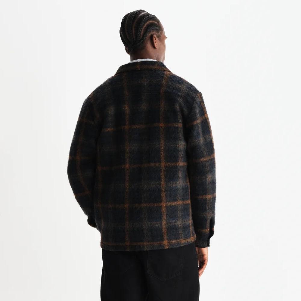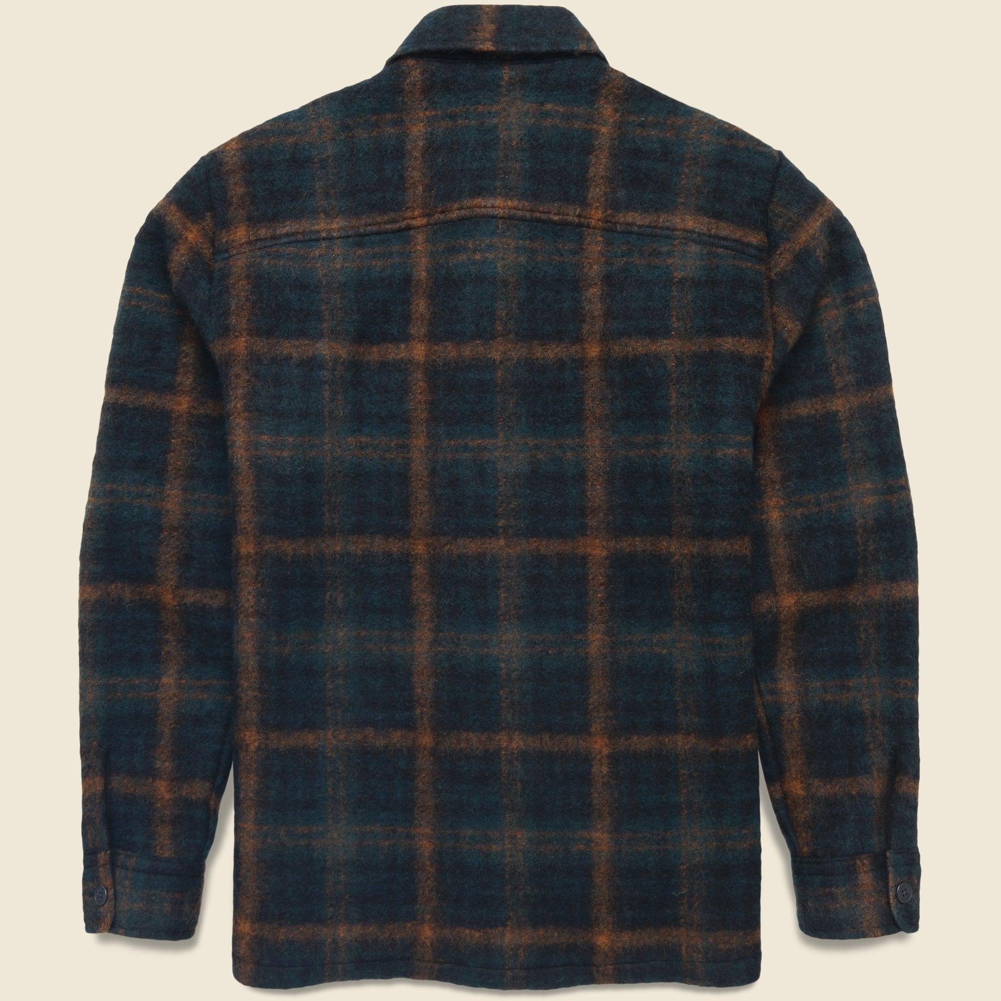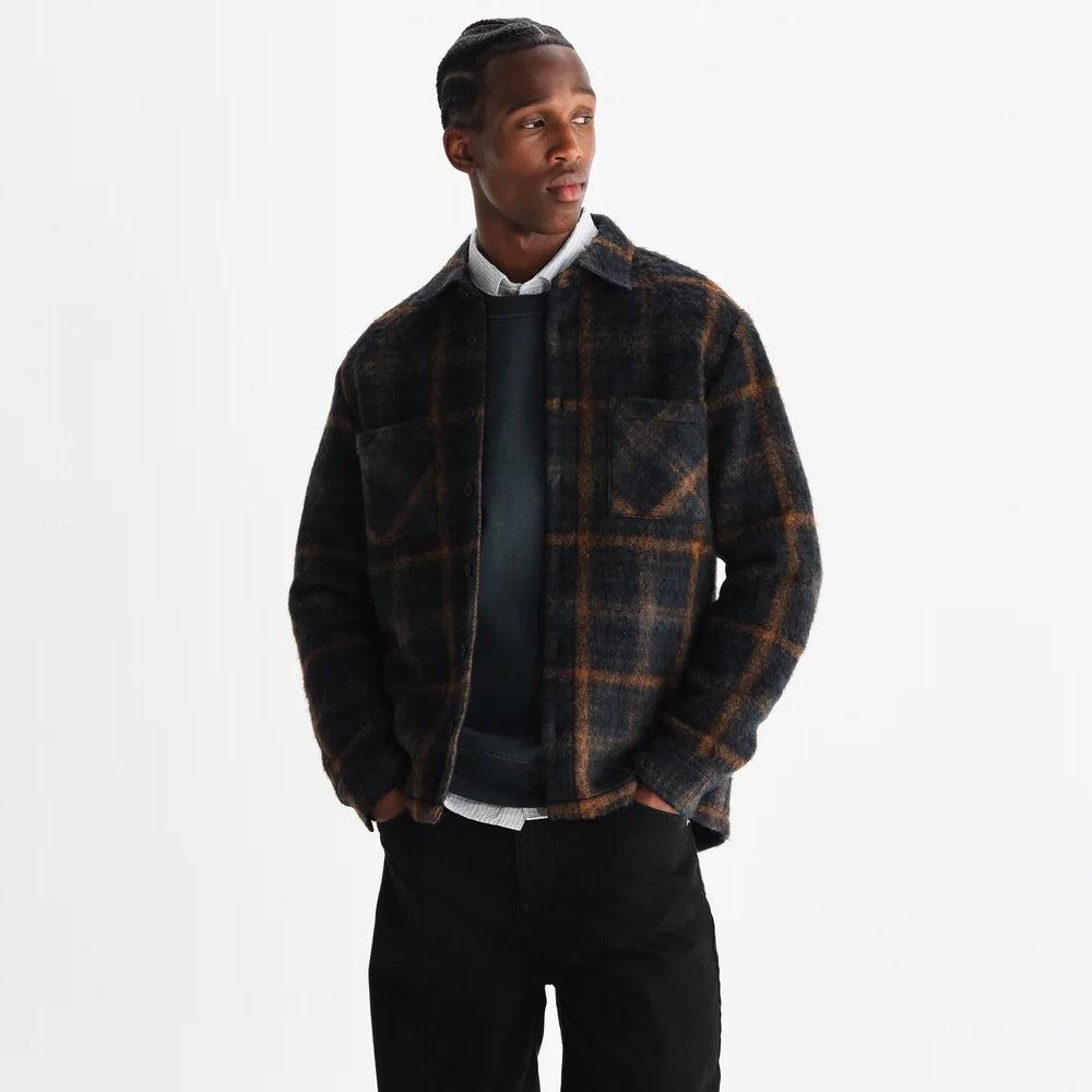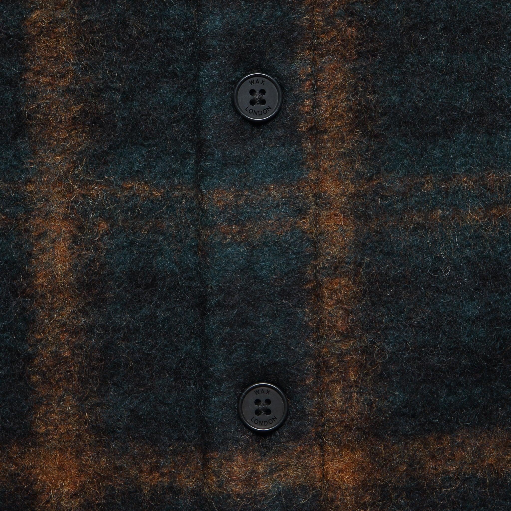 This seasonal version of the classic Whiting Overshirt from Wax London uses a midweight, insulating wool blend to keep you nice and warm on chilly days and features a soft viscose lining through the sleeves for all-day comfort. It has a perfectly relaxed fit through the chest and shoulder and comes detailed with a pair of patch packets at the chest, a squared hem, and environmentally-friendly corozo nut buttons up the front. Warm wool-poly blend Knit teal and orange plaid pattern Two patch chest pockets Corozo nut buttons Spread collar Straight hem Relaxed fit that runs true to size We recommend taking your normal size Materials: 50% polyester, 35% wool, 15% acrylic The following measurements are for size Medium: Chest: 45” | Shoulder: 18” | Sleeve: 34” | Length: 30 ½”