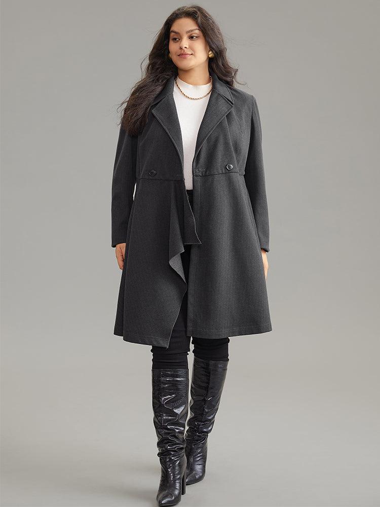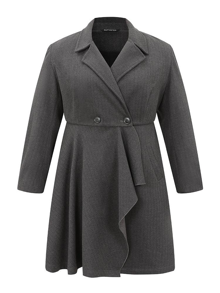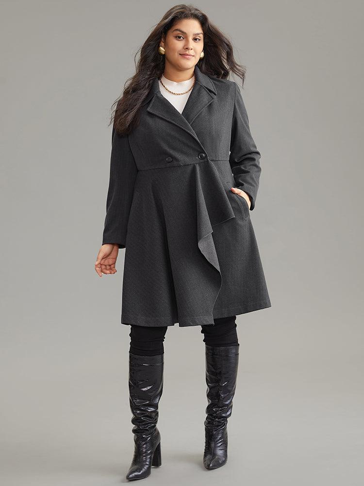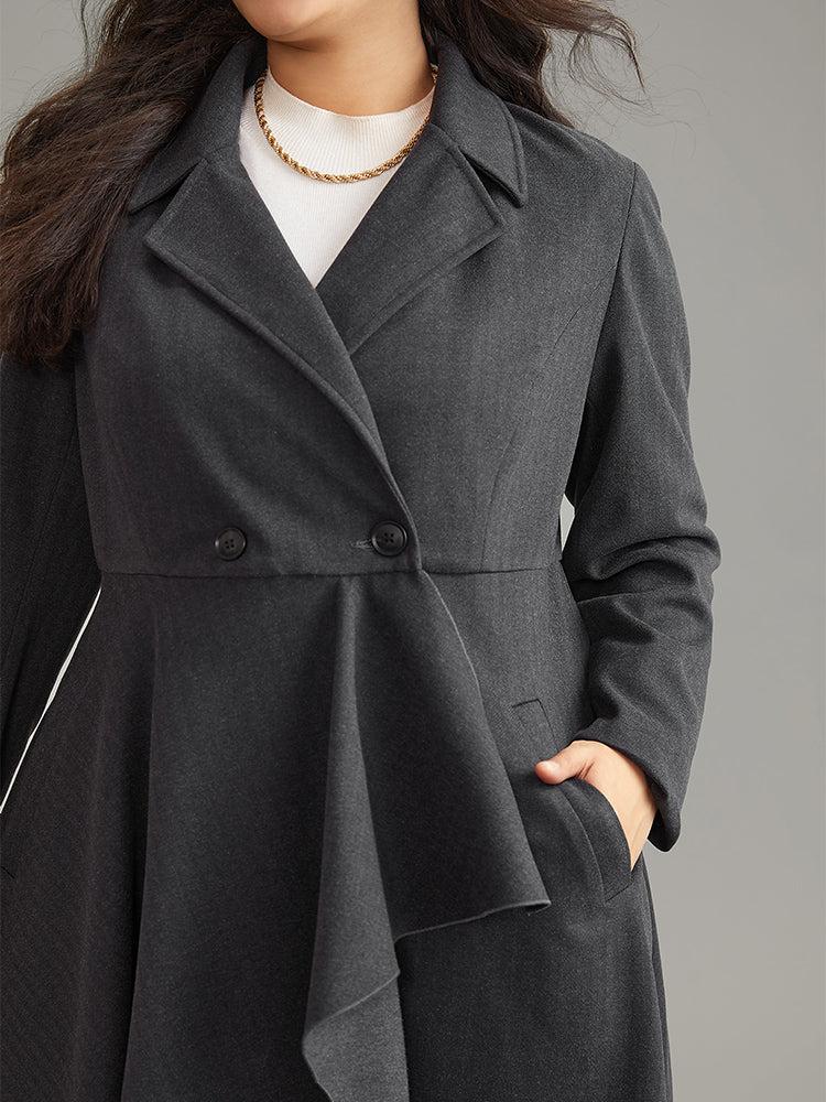 Shop Woolen Solid Button Up Ruffle Trim Coat now and redefine your style with confidence at BloomChic. Tailored for mid and plus-size women. This trendy Outerwear Women, sizes 10-30. Season:Winter;Color:Gray;Style:Elegant;Pattern Type:Plain;Details:Asymmetrical, Pocket;Pocket:It is perfectly sized to carry a phone.;Snap Fastener:Snap fastener;Belt:No-belt;Lining:Lining