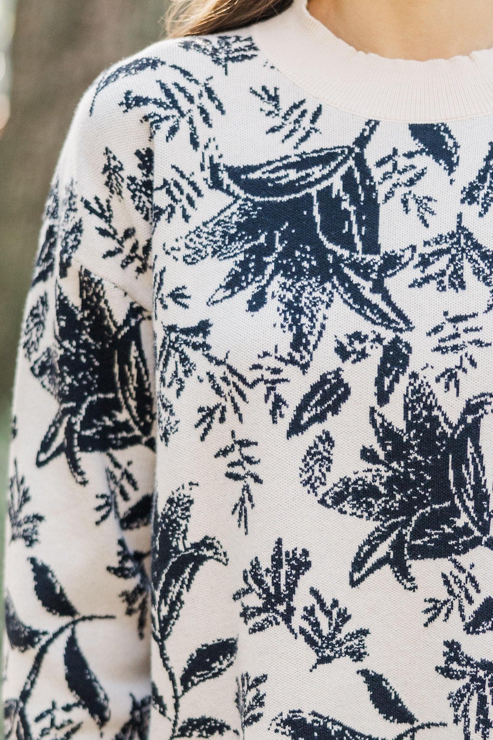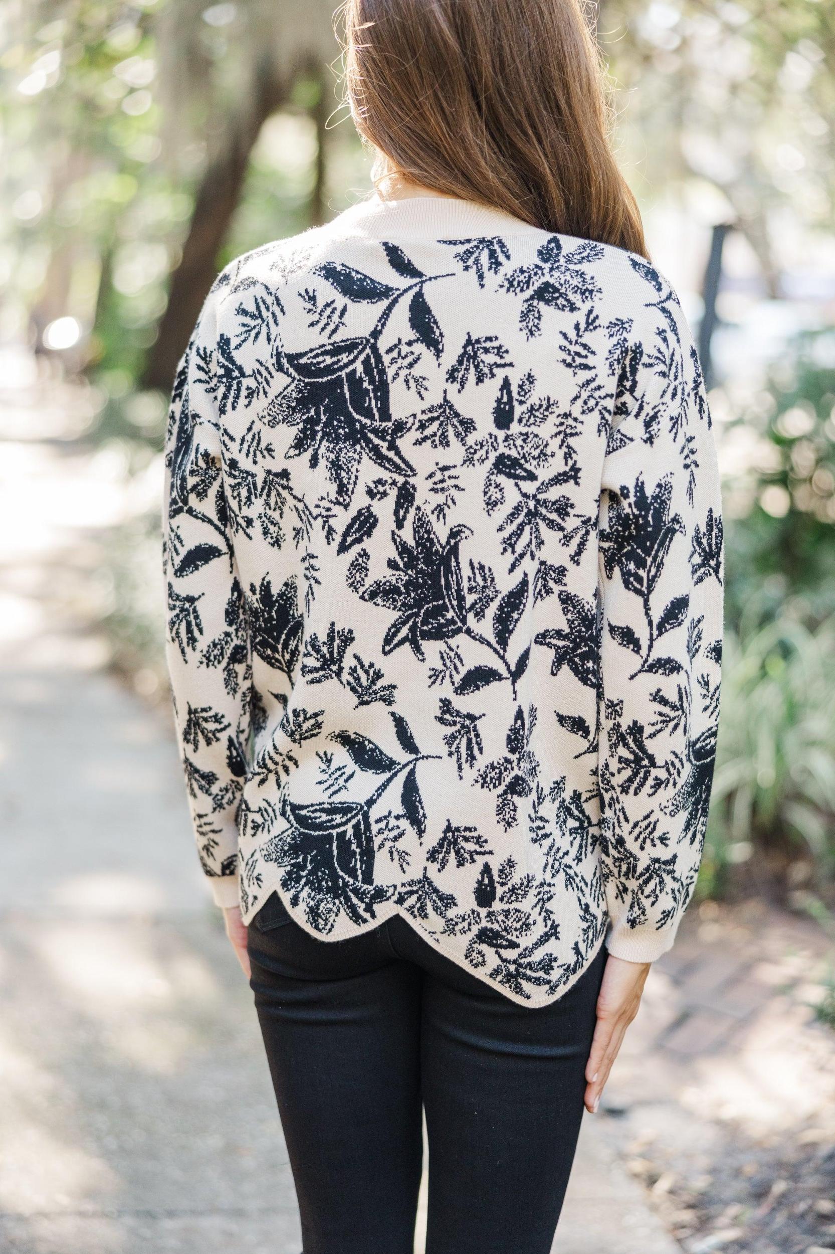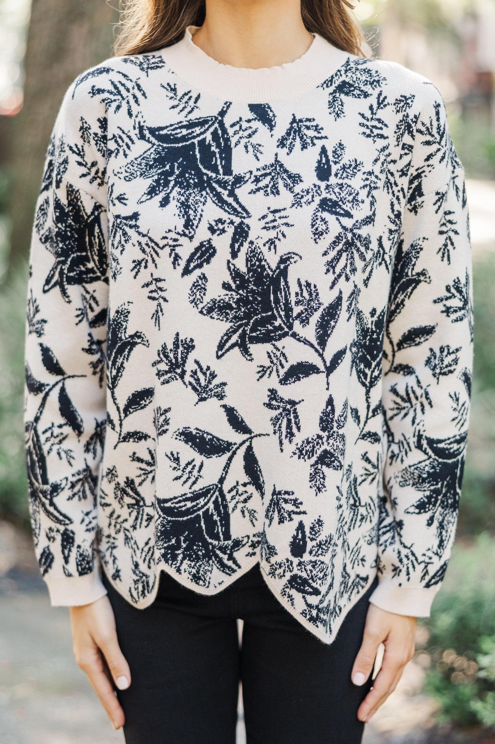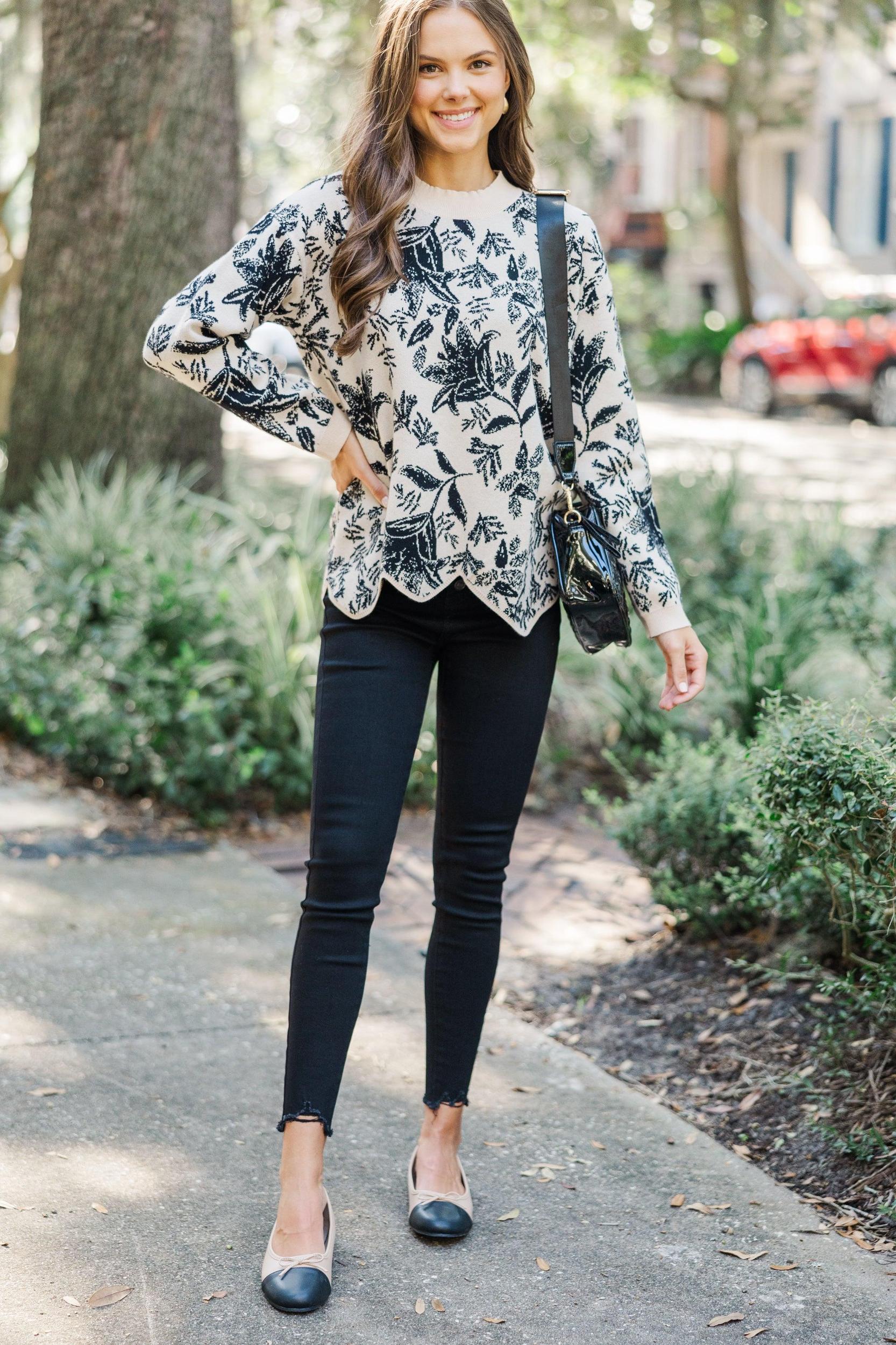 This sweater is so pretty! We are obsessed with that floral print and those neutral hues. The scalloped/asymmetrical hem is really fun too! This sweater is going to be a fall favorite for sure! Round neckline Long sleeves Floral print Scalloped/asymmetrical hemline Generous stretch Sydney is wearing the small.