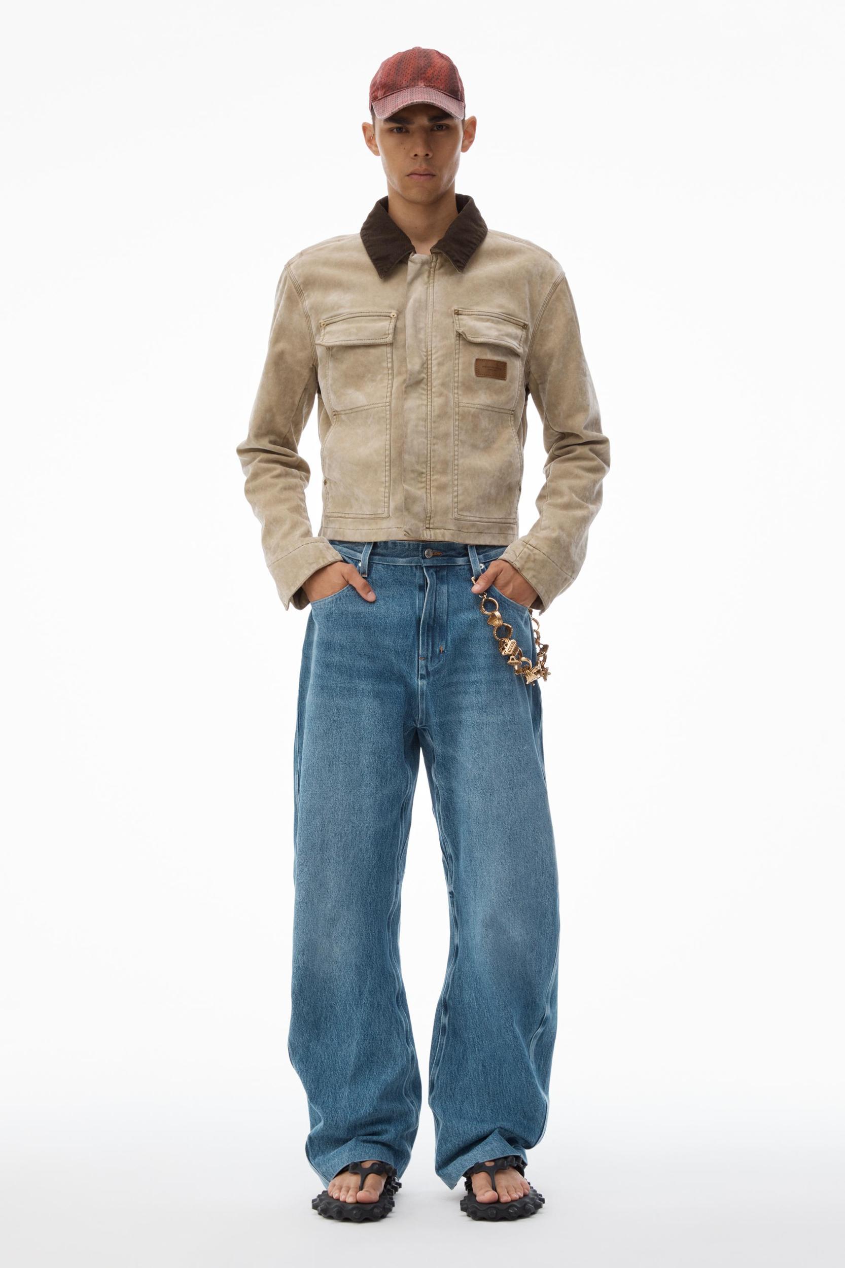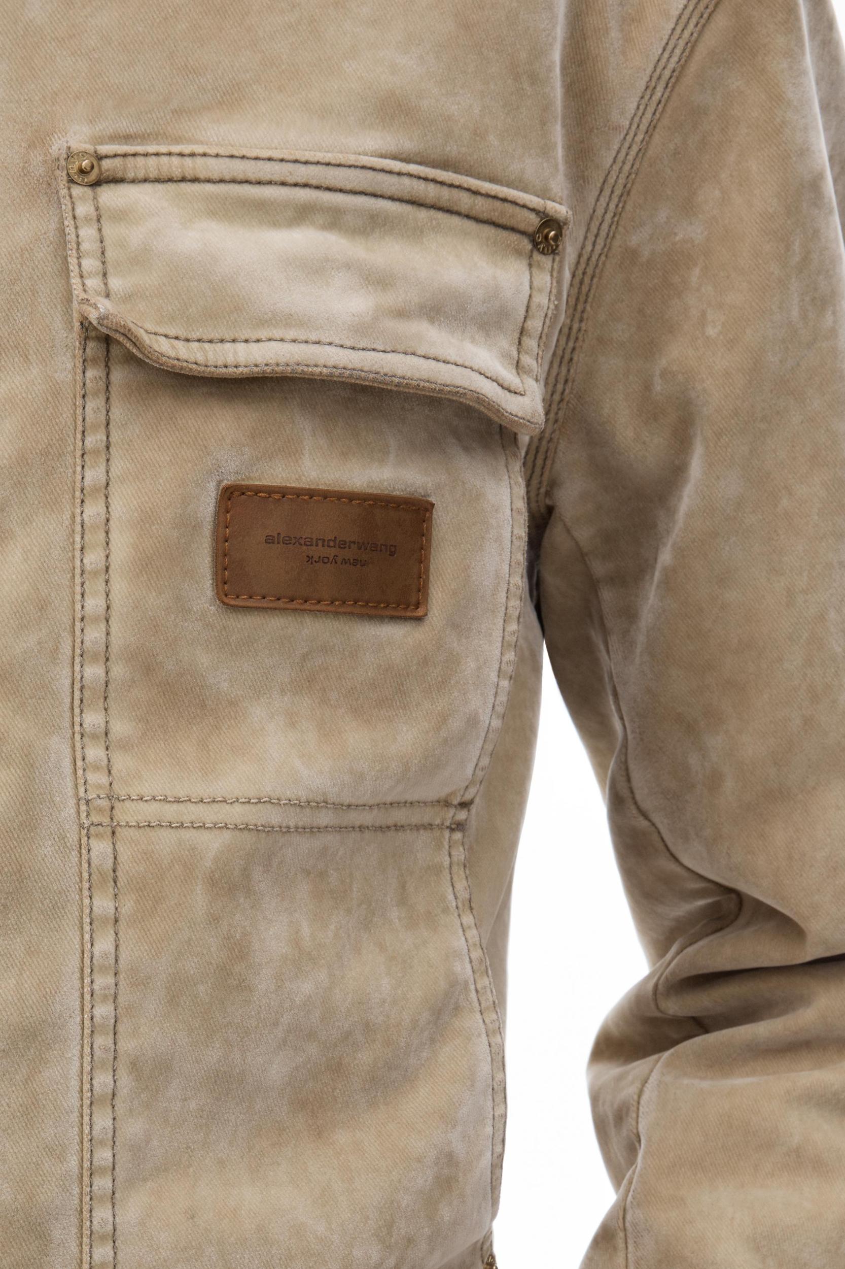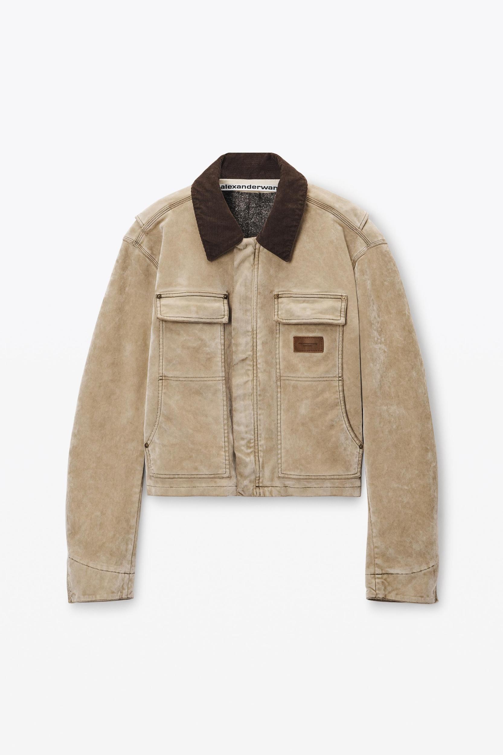 Flocking in a weathered tan wash enhances the worn look of this workwear jacket. It features a contrast corduroy collar, patch and side slip pockets, and a concealed front placket.