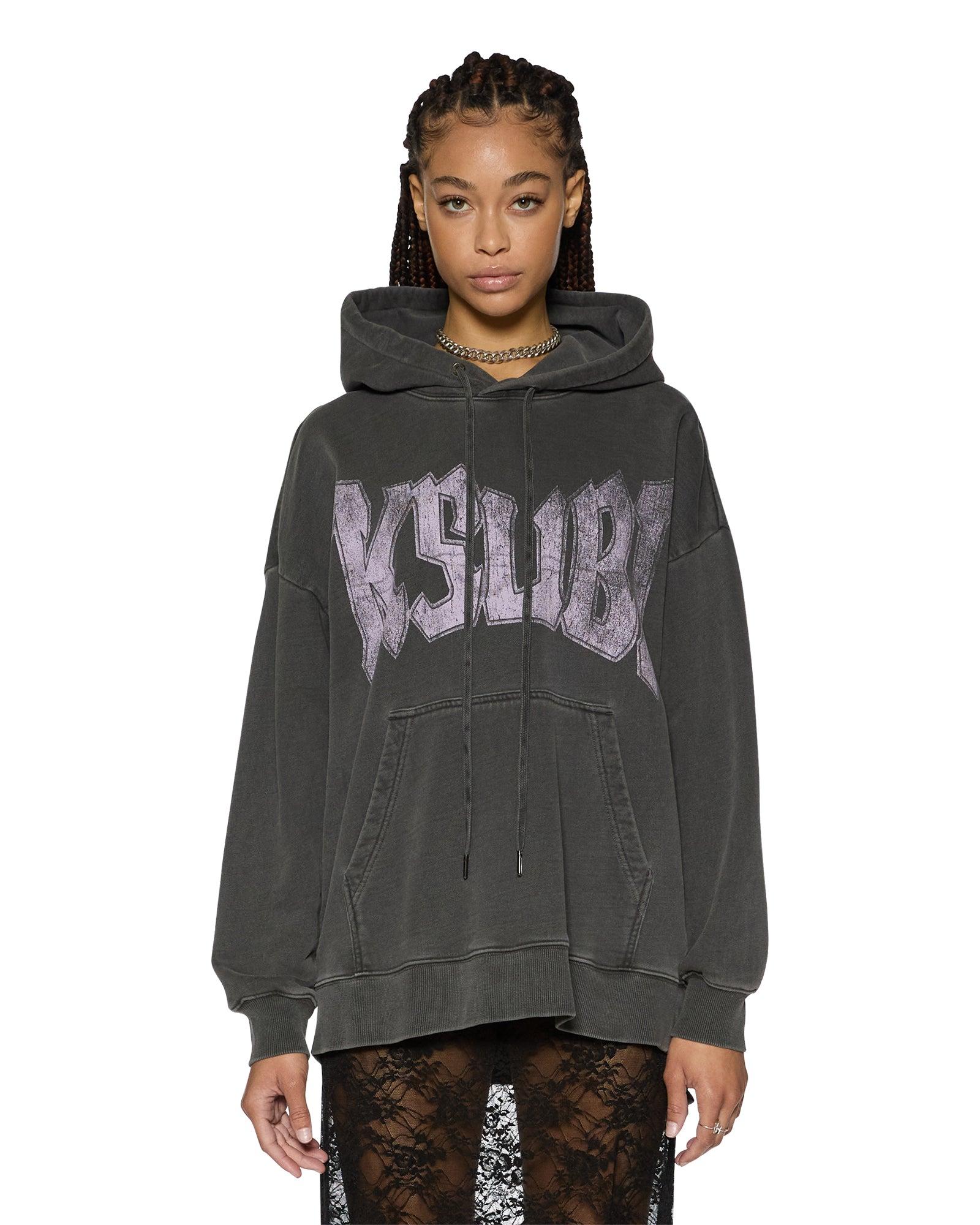 The World Tour Oh G Hoodie Charcoal is an oversized fit hoodie with a dropped shoulder and long sleeves, featuring rib cuffs and hem band, and a front pouch pocket. Made from premium loopback cotton fleece in washed charcoal for a vintage handfeel, it includes exclusive Ksubi graphic art on the front and back, and T-box embroidery on the back.