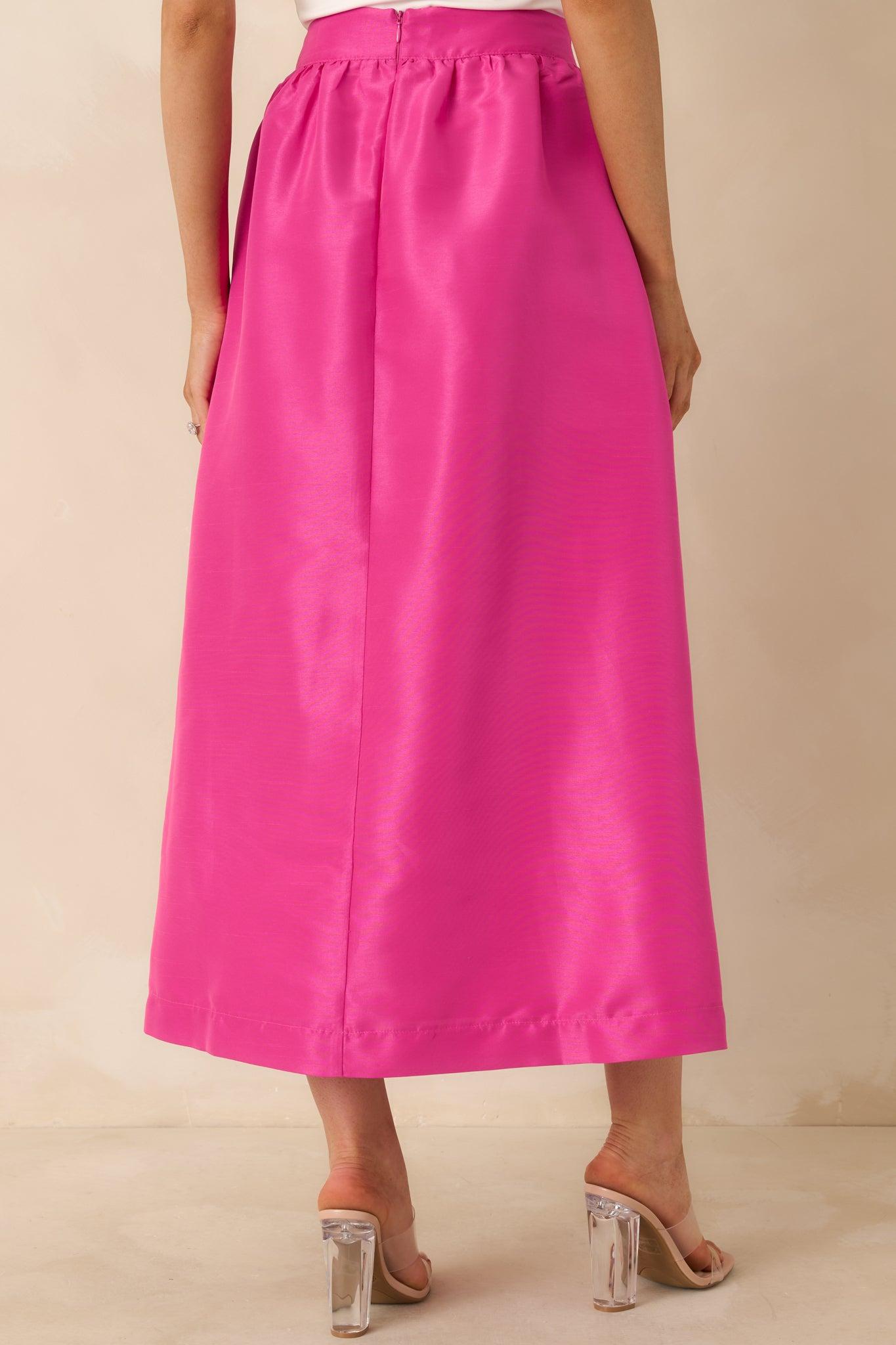 Bold, confident, and ready to make an entrance, the Worth the Chase Fuchsia Pink Structured Maxi Skirt brings statement color with a refined feel. Its structured shape balances the vibrant fuchsia hue, creating a look that feels elevated without being overdone. Easy to dress up or down, this skirt moves effortlessly from daytime plans to dressed-up moments. This fuchsia pink maxi skirt features a smooth, structured woven fabric with a high-rise waistband for a flattering fit. Designed with a gathered waist that flows into a fully lined full-length silhouette, it includes functional side pockets and a side slit for added movement.