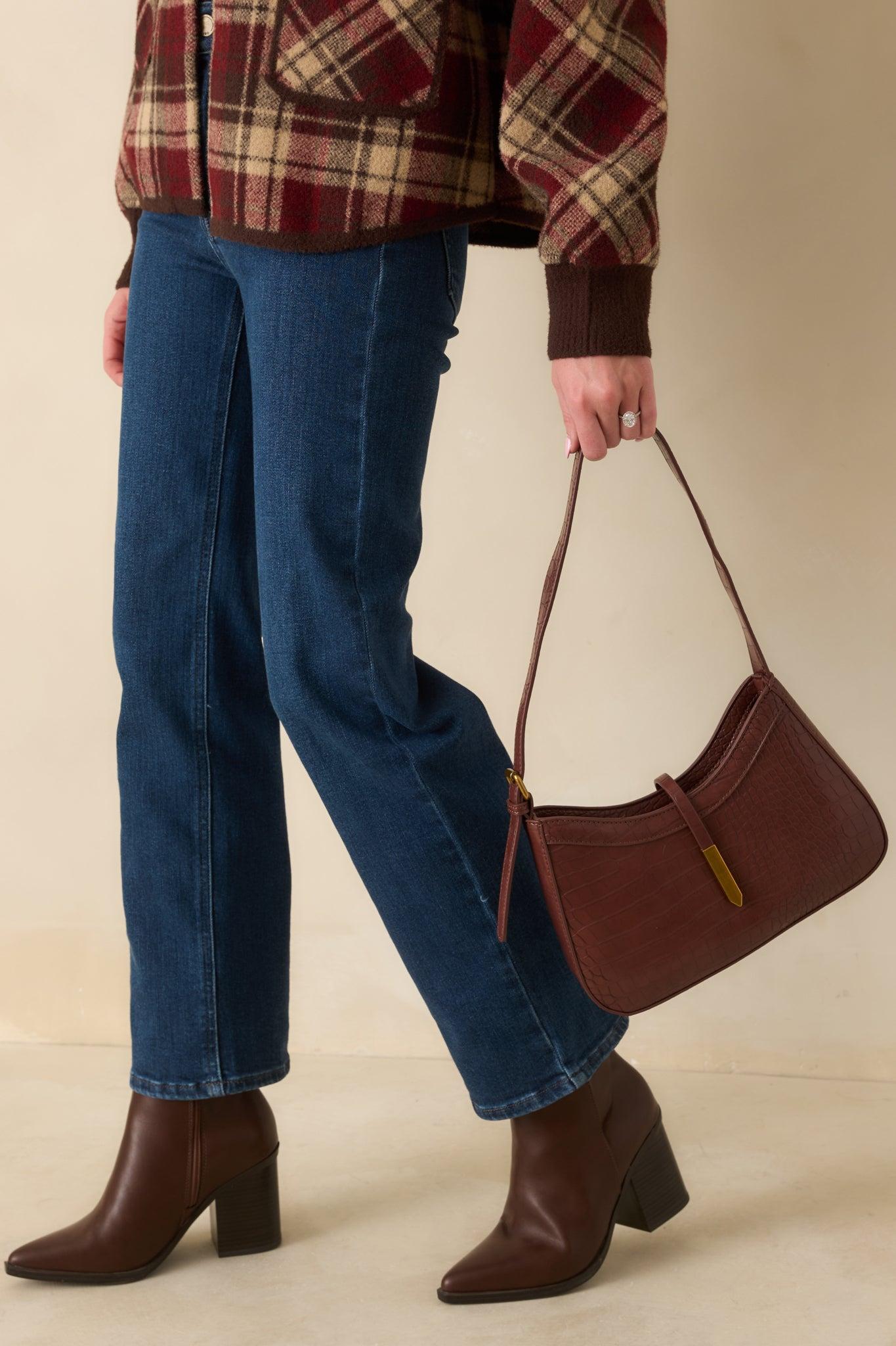 Elevate your everyday style with the Worth The Risk Chocolate Brown Croc Embossed Faux Leather Handbag that blends modern edge and timeless refinement. This chocolate-brown shoulder bag features croc-embossed faux leather, a structured silhouette, an adjustable strap, sleek gold hardware, and a single-strap closure finished with a rectangular brushed-gold tip. It’s the perfect balance of rich texture and polished detail. This Bag Measures 11" in Length, 2.5" in Width, & 7" in Height 100% Polyurethane Manufactured in China