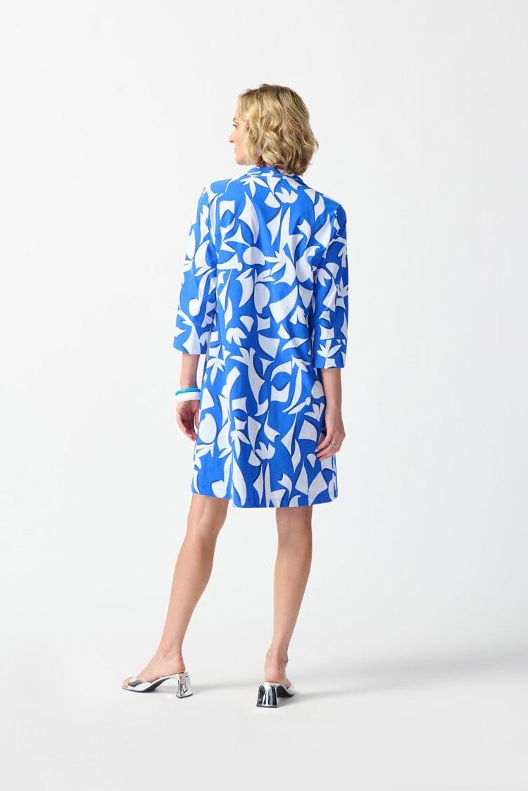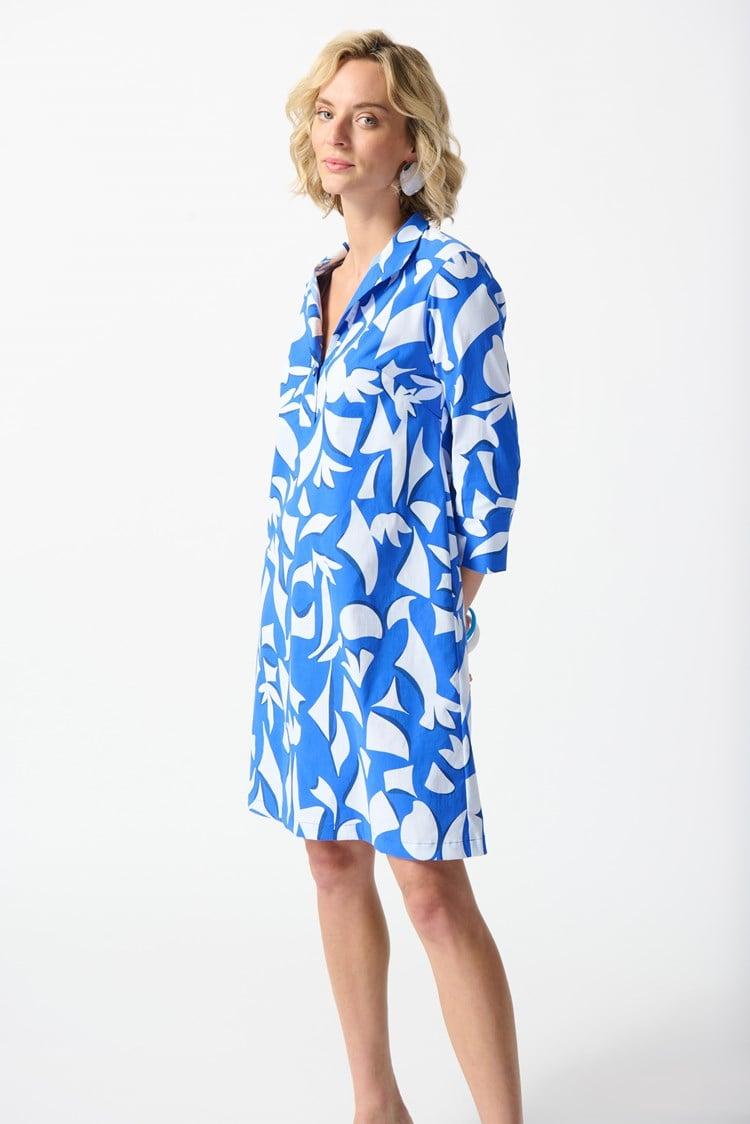 This poplin dress embodies modern sophistication to perfection. The design boasts an exquisite abstract print that elevates the piece’s artistry and trapeze silhouette. The funnel collar exudes effortless poise while the cuffed three-quarter length sleeves strike the right balance between chic and comfort. The button and plaquet at the front add a hint of charm and versatility to the garment allowing you to adjust the neckline to suit your style.