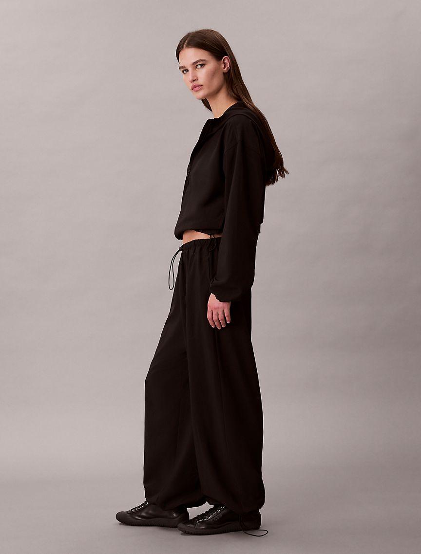 An exaggerated wide leg silhouette with a flexible waistband. These parachute pants are mid-waisted with seam pockets at the sides. Adjustable at the waist and cuffs with a drawcord detail.