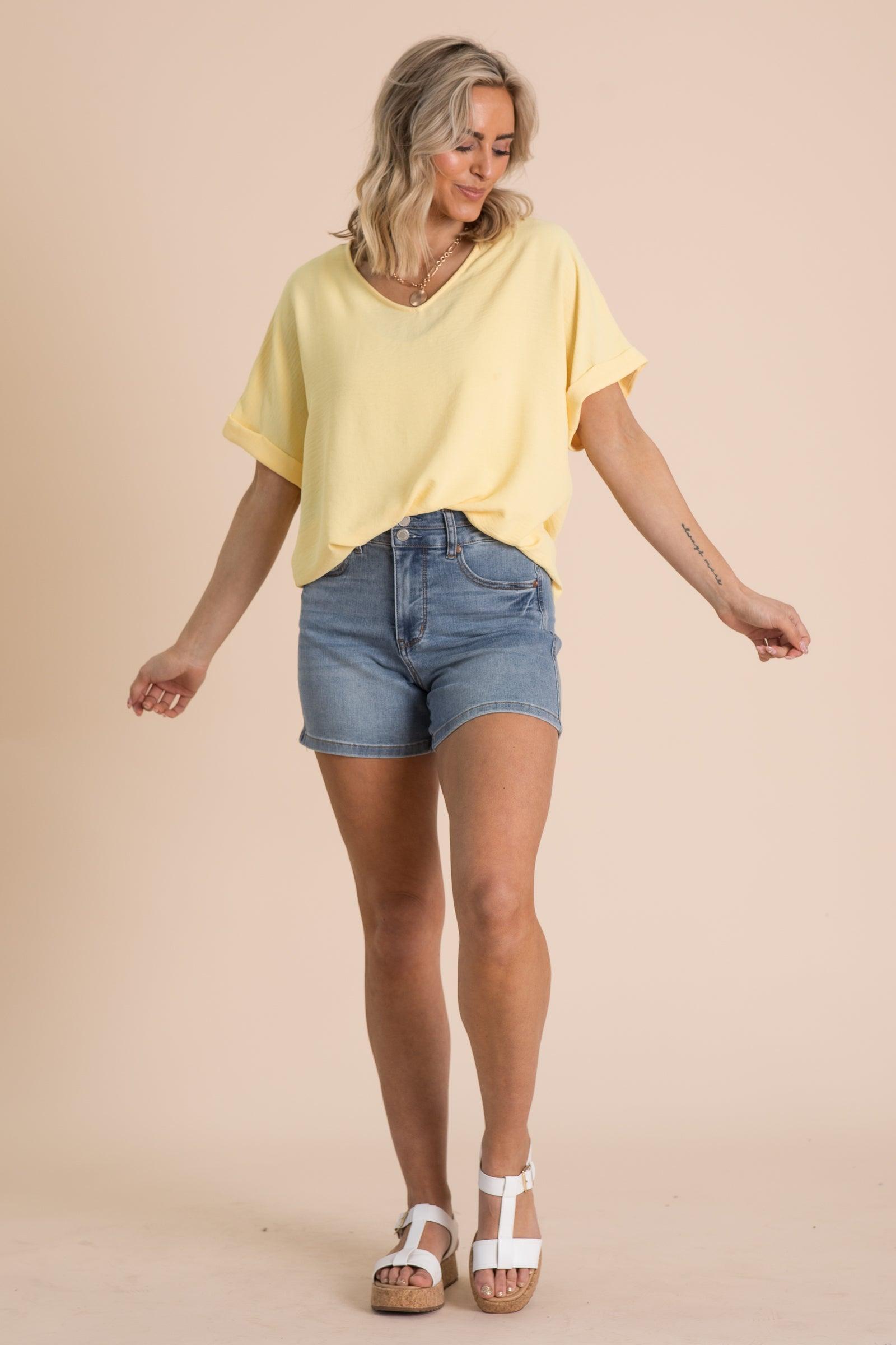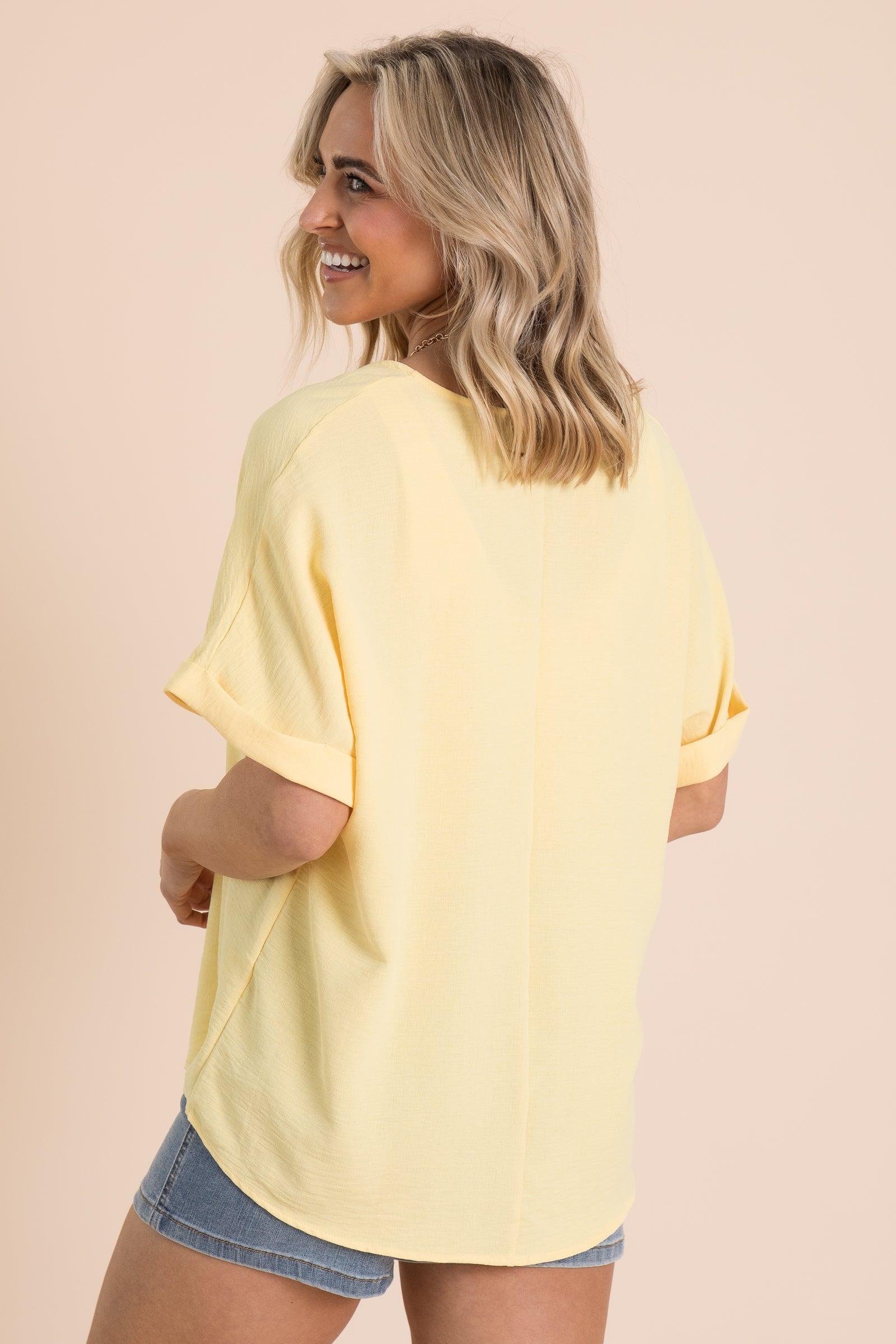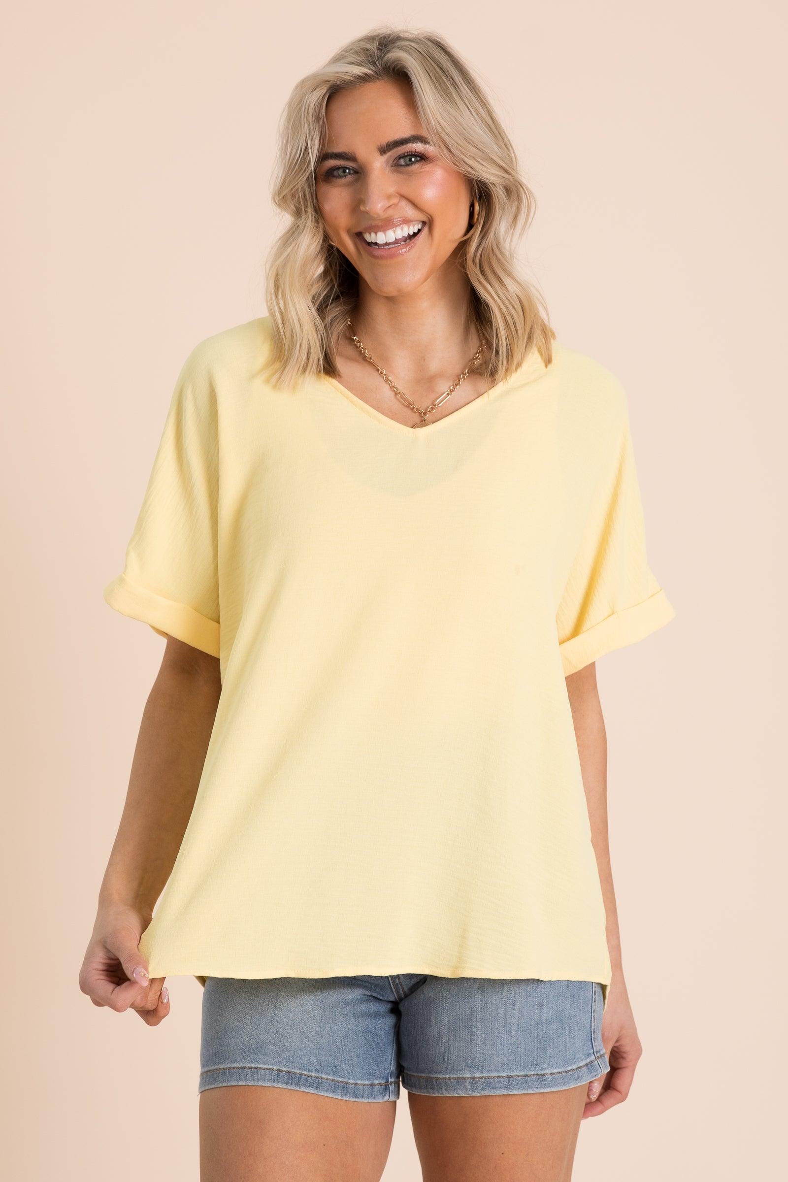 Product Details Colors: Aqua/ Lemon/ Navy Print: Solid Neckline: V-Neck Sleeve: Short Sleeve Hemline: Round Brand: Andree By Unit Material and Care 100% Polyester Hand Wash Cold Hang/Line Dry Size and Fit Small: Bust 48" Waist 46" Length 27.5" Medium: Bust 50" Waist 48" Length 28" Large: Bust 52" Waist 50" Length 28.5" Photo model is 5'8 and wearing a size small