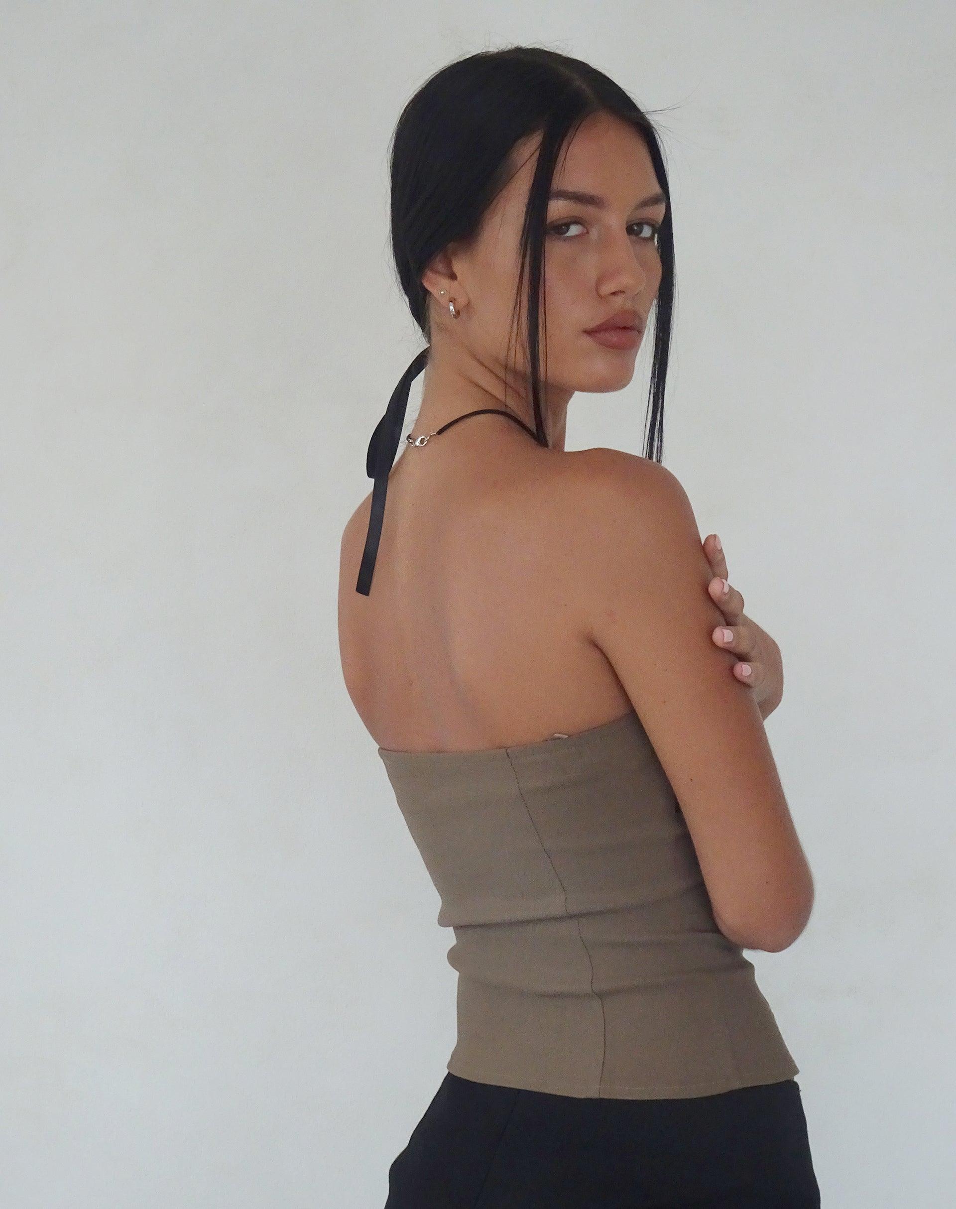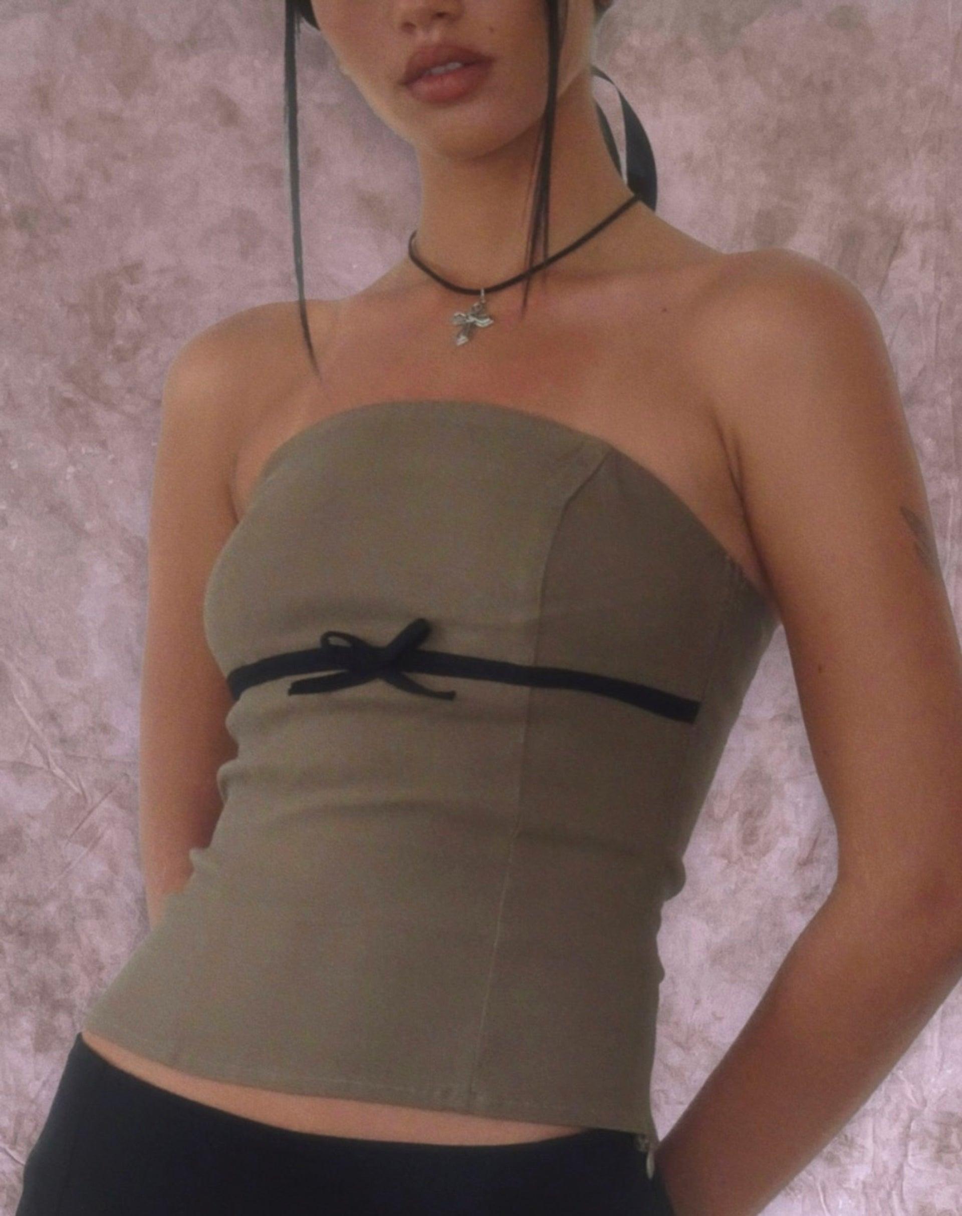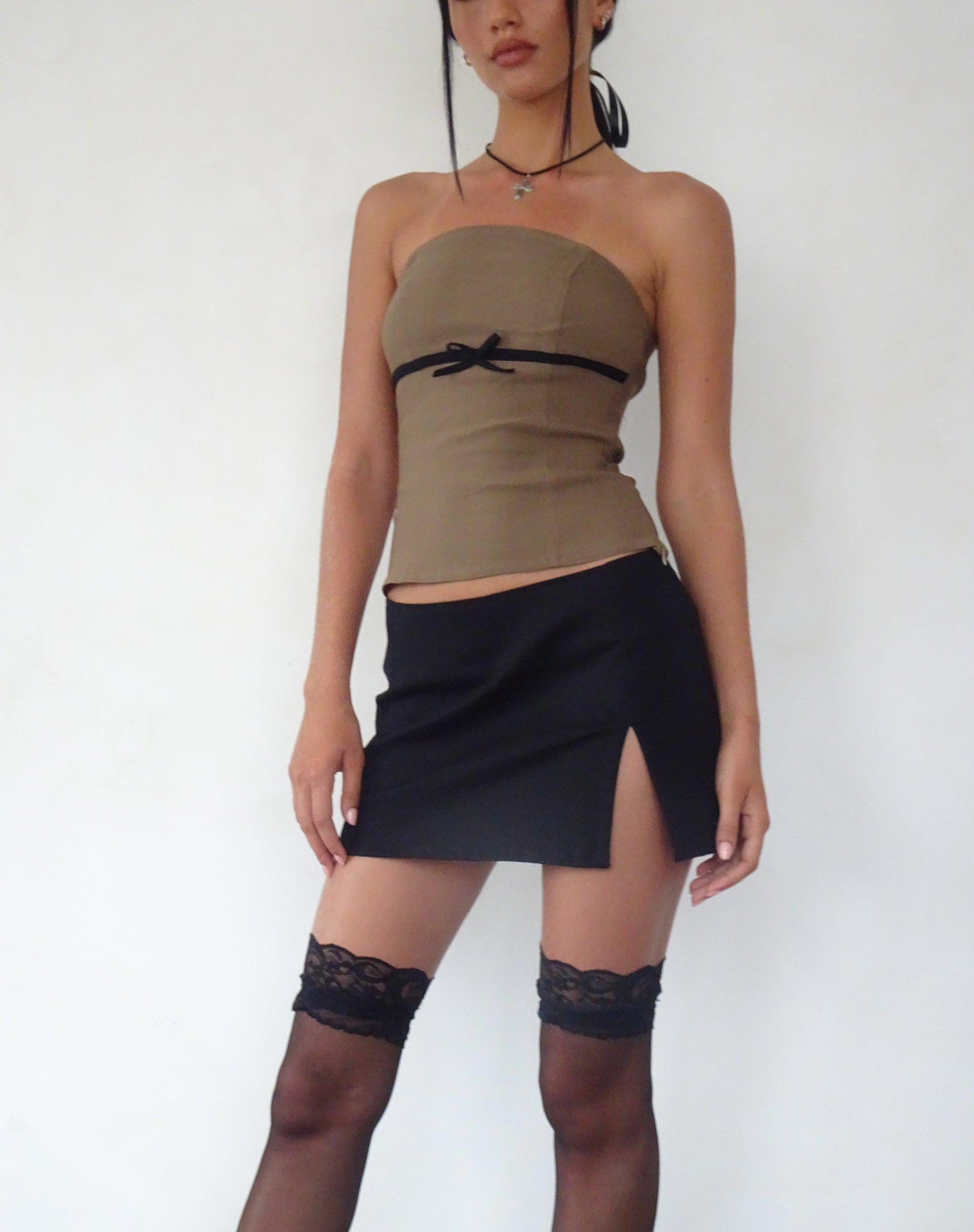 The Woyla top is femme tailoring, for the everyday. In a coco brown hue, it features a bandeau neckline with contrasting black bow detailing. We've styled ours with the Lidya mini Skirt and kitten heel. MODEL WEARS SIZE: EXTRA SMALL - MODEL HEIGHT:5'7 - FABRIC CONTENT: TAILORING 64% RAYON 23% NYLON 13% ELASTANE