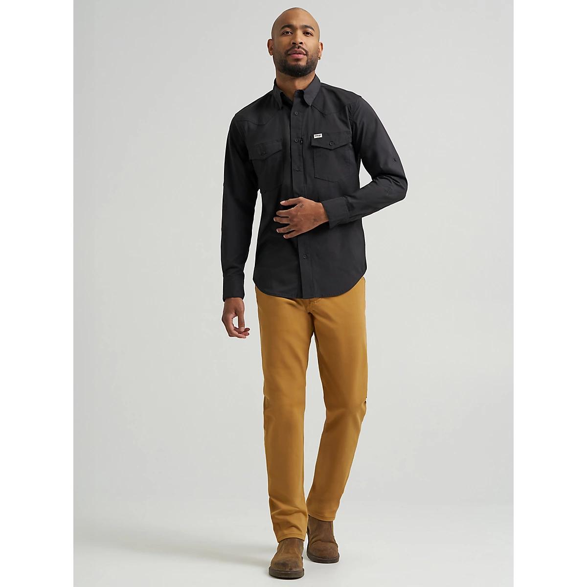 Offering reliable comfort and performance, the Wrangler ATG™ Men's Technical Shirt will become an easy choice for every day you spend outside. It’s crafted from a comfortable fabric blend with just the right amount of stretch. It repels water to keep you dry and comes with built-in UV protection against the sun’s harmful rays. You get the Western styling you love with single-point yokes from front to back, plus chest flap pockets for any essentials you bring along. Our signature sleeve tab system lets you adapt your look on the fly and the full button front makes layering easy.