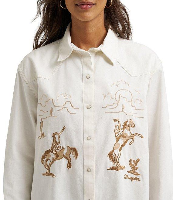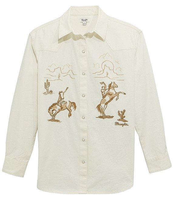 From Wrangler®, this shirt features: Spread collar Long sleeves Snap-front closure Cowboys "riding" horseback character designs and scenery on the front Cotton denim Machine wash/tumble dry Imported.