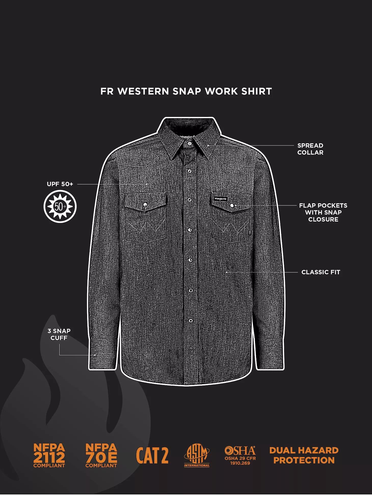Shop the Wrangler® FR Flame-Resistant Long Sleeve Western Snap Solid Twill Work Shirt on Wrangler.com, the official website for Wrangler SHIRTS and all your favorite Wrangler men's apparel.